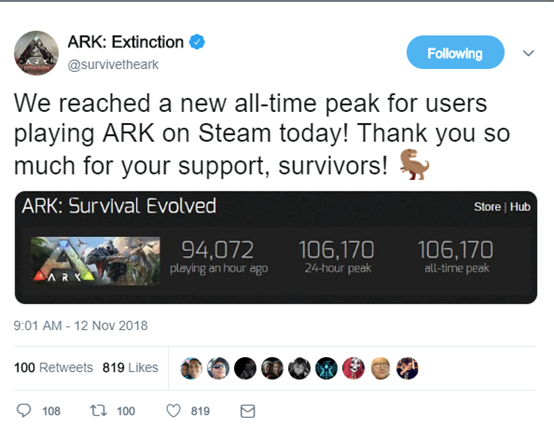 《方舟:生存进化》DLC“灭绝”Steam销量持续霸榜,刷新在线历史记录 生存沙盒游戏《方舟:生存进化》今日在推特公布了Steam平台最新在线人数106,170 。新的在线人数突破了《方舟:生存进化》在2017年2月的历史峰值100,723。 “我们宣布《方舟:生存进化》在Steam平台创造了新的在线人数记录。非常感谢生存者们的支持!” 持续 “Steam霸榜神作”的传奇 《方舟:生存进化》11月7日推出了“方舟三部曲”的最后一部,也是方舟史上最大的DLC“灭绝”。 新DLC发布12小时,推动《方舟:生存进化》进入Steam全球热销榜榜首。11月5日-11月11日排名前10的Steam销量榜上,《方舟:生存进化》名列第四,并独占三席 “灭绝”是《方舟:生存进化》DLC三部曲的最后一部。在“灭绝”DLC中,幸存者将回到一切开始的地方——地球。 曾经郁郁葱葱,蓬勃发展的家园,现在是一个腐败,充满敌意和荒凉的世界。 探索发现多样的生物,在过去文明的废墟上,人类去寻找地球死亡的线索以及恢复其未来的关键。 在杂草丛生的地平线上,充满科技大都市在废墟中崛起。 人类能击败主宰地球的巨大漫游泰坦,完成方舟周期来拯救地球的未来吗? 全新的未来黑科技 “灭绝”是一个全新的地图。玩家在“灭绝”DLC中将可以捕获,驯服和制造强大和不寻常的有机和机械生物类型,它们不同于以往在方舟宇宙中看到的任何东西。通过无人机来提高探险侦查的视野。玩家还能拥有具有传送功能的冷冻舱,将探险过程中发现的新生物保存在冷冻舱中,可以跨越和穿过以往无法行进的峡湾和泰克桥。 新元素颠覆地球面貌 新元素腐蚀和变异它在地球触碰的一切。玩家必须做好准备,应对灾难性事件带来的新挑战。和巨大的泰坦展开史诗般的战斗。搜索荒原,寻找补给,保护自己俘获到的珍惜生物。同时,抵御哪些突发的灾难性的元素爆发,包括日食、流星雨。 新的目标:BOSS战 在‘灭绝’中除了科幻科技成分以外,BOSS战也是成为了这张地图的新特色,尤其是对于这张地图上的诸多大BOSS来说,是相当有游戏性的一种玩法,不再是之前的只有要开泰克才会去打BOSS,野外游荡的BOSS也不再是只有泰坦一种,这让游戏的最终目标也不再是只有‘抄家’一种而已。 目前《方舟:生存进化》本体和包括“灭绝”在内的扩展包低至6折,获得所有游戏包仅需要人民币147元,11月14日后恢复原价。 了解更多相关信息,请前往http://game.yzz.cn/html/info-2133.html |