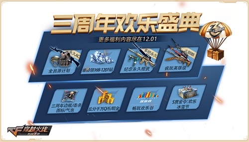 《穿越火线》手游(简称:CF手游)三周年欢乐盛典活动即将于12月1日开启,游戏将为广大玩家带来众多精彩活动和丰厚奖励。今天率先带来三周年欢乐盛典的爆料,更多精彩内容期待玩家关注。 “源计划”壕礼活动来袭 更有最高1201钻等你抽 CF手游三周年活动期间,源计划活动重磅上线。当玩家更新CF手游至最新版本后,便可在游戏内看到“源计划”图标,点击图标便可参与相关活动。本次“源计划”活动中,玩家不仅可以获得永久枪械,更有永久AC道具等待玩家前来领取。此外,活动期间玩家登陆游戏即可参与抽奖,单日最高可获得1201钻石。 纪念永久橙武登录即送 畅玩多款英雄级武器 玩家只需在12月1日至12月2日期间登录游戏,即可获得本次三周年纪念款永久橙色武器。三周年活动将送出多款永久纪念武器,以及三周年边框、击杀图标和气泡等,相信对于广大CF手游玩家来说意义非凡。除了永久纪念武器外,包括AK47-火麒麟在内的多款英雄级武器也将在活动期间陪伴玩家驰骋战场。赏金令S3:欢乐冰雪节也即将开启,全新的奖励敬请玩家期待。 千万现金Q币、欢乐谷门票等你领 除了海量道具福利外,在三周年活动期间,玩家还可以邀请自己的小伙伴,参与拼团红包活动瓜分千万现金Q币大奖。本次三周年还与欢乐谷合作,打造CF手游欢乐谷主题乐园,与玩家在线下共同狂欢,活动期间还将送出欢乐谷门票,敬请玩家留意后续活动。 CF手游三周年欢乐盛典即将在12月1日全面开启,全员源计划、永久纪念橙武、海量钻石、千万现金Q币等8大活动期待玩家前来参与。众多预热活动已经开启,敬请玩家们关注体验! 更多详情请关注: 《穿越火线》手游官方网站:http://cfm.qq.com/ 《穿越火线》手游官方微博:https://weibo.com/u/6397607475 《穿越火线》手游官方论坛: http://bbs.g.qq.com/forum-56951-1-1-1.html?ADTAG=cf.gw.rk 《穿越火线》手游官方APP:http://cf.qq.com/app/ 个人战绩全掌握、版本爆料提前看、武器福利领不停!尽在《穿越火线手游》唯一App 《掌上穿越火线》。 关于腾讯游戏 腾讯游戏,全球领先的游戏开发和运营机构,国内最大的网络游戏社区。以“用心创造快乐”的理念,腾讯游戏通过在多个产品细分领域的耕耘,对多元化四大平台的打造,致力为玩家提供“值得信赖的”、“快乐的”和“专业的”互动娱乐体验。 腾讯游戏,用心创造快乐! |