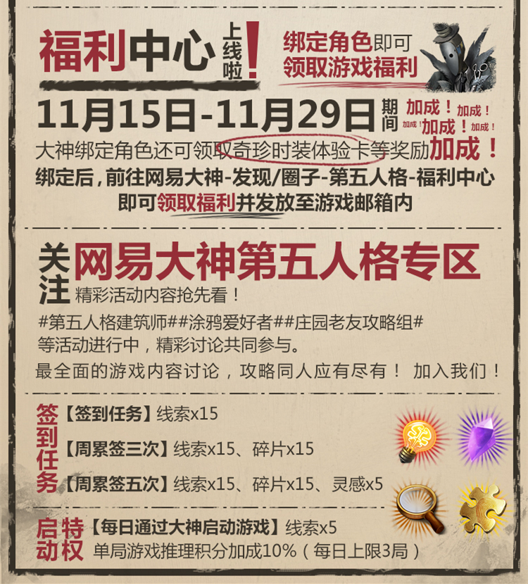 推理宝藏等你开启!网易大神《第五人格》福利中心今日上线,即日起绑定游戏角色,即可在《第五人格》专区的福利中心领取线索、碎片、灵感、推理积分加成等每日游戏福利。11月15-11月29日,绑定角色可领取大神专属头像框,还有奇珍时装体验卡等绑定奖励加成! 【福利中心上线 海量奖励天天领】 11月15日-11月29日期间,登录网易大神,绑定《第五人格》游戏角色即可赢得线索、碎片、大神专属头像框,还有额外的宿伞之魂体验卡、奇珍时装体验卡等你赢取! 目前《第五人格》福利中心目前已开启,各位玩家只需每天签到,即有机会领取线索、碎片和灵感等奖励! 活动结束后,绑定奖励将变更为:线索×188,大神专属头像框(永久) 【多重精彩活动 玩转海量福利】 为了欢迎各位新访客到来,我们还准备了精彩话题、同人活动等你参与~ 活动一:#第五人格建筑师# 登录网易大神参与#第五人格建筑师#话题,参与新角色“建筑师”相关讨论,如攻略、同人内容、玩法等,活动结束后,将随机抽取20名幸运儿送出胡子先生超萌公仔。 活动二:#涂鸦爱好者# 登录网易大神参与#涂鸦爱好者#话题,设计你想要的第五人格主题涂鸦表情包,并@第五人格庄园管家 投稿,即可参与活动。优秀作品将获得毛绒换装公仔(空军、佣兵、医生、园丁等)~还有机会加入大神官方同人创作团队哦! 活动三:#庄园老友攻略组# 攻略组招募开始!在#庄园老友攻略组#话题下,投稿发布攻略内容,即有机会成为庄园老友攻略组成员。征稿分为#人皇#、#屠皇#两个阵营,分别征集求生者、监管者相关的攻略内容,亦可在话题内发布一句话攻略。优质内容有机会享受独家攻略组福利、游戏充值礼包福利等惊喜奖励~ 庄园的大门已经打开,欢迎各位加入网易大神! 【关于“网易大神”】 网易大神是游戏玩家专属的兴趣社区。这里汇聚了广大精英玩家、游戏圈红人、行业大咖,集合了网易独家的官方资讯和福利趣闻,旨在为玩家打造一个丰富的游戏兴趣社交圈。玩家可以在网易大神与游戏中的好友实时聊天、多元互动;以游戏会友,结交更多游戏同好,和大神一起发现更多游戏乐趣。 官方网站:https://ds.163.com 官方微信:wyds_163 官方微博:@网易大神APP 官方大神号:@网易大神 了解更多相关信息,请前往http://game.yzz.cn/html/info-6531.html |