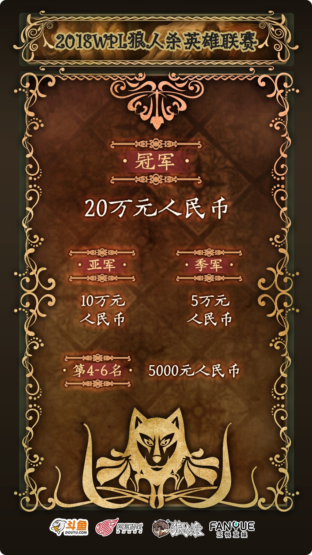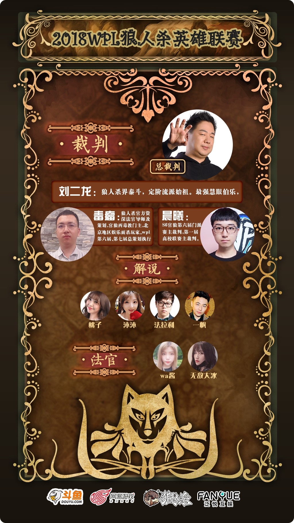 12月2日15点,狼人杀英雄联赛2018总决赛在武汉华中科技大学国际学术交流中心附近正式开赛!斗鱼8000全程独家直播! 本届狼人杀英雄联赛,是由网易游戏、狼人杀官方主办,上海泛悦文化承办, 斗鱼直播独播呈现的全国最高级别狼人杀赛事。 从九月份的百万狼友线上海选赛,西安、成都、北京、武汉、上海、广州六大城市赛,到封神之战的全国总决赛, 共历经为期三个月的激烈角逐,最终十二名选手突出重围。 百天磨砺,一朝登顶。真正的比赛,才刚刚开始! 他们要面对的,是来自六大赛区的最强两人。 等待他们的,是五场比赛的持久鏖战。 拼下百万分之一的机会,临门一脚在此一役。 犹记的西安赛区冠军283容嬷嬷悍跳狼人最稳发言,竟能使得全场男士无人怀疑; 北京赛区逍遥派三叔强势C全场,直指冠军; 成都赛区283掌门北影凯神南派代表,热血突围; 上海赛区斗鱼GK瞎唠嗑头发比人浪,放飞自我聚焦全场; 武汉赛区“道歉哥”汉普(武汉普通话)支配全场,只得一发道歉三连。 WPL拥有场外最权威顶级裁判阵容,最专业的赛事团队,颜值超高的美女法官,烧脑对决不容错过! 本次赛事还有价值百万的奖金。总决赛角逐出的冠军、亚军、季军将分别获得20万、10万、5万元人民币现金奖励, 第4—6名将分别获得5000元人民币现金奖励。除此之外赛事互动充值的5%也将作为奖励。 冠军将分得其中34%,2—12名将每人分得6%。奖励不仅有高额现金,还有成为主播的机会。 进入决赛圈的12名选手,都将获得斗鱼主播签约资格!荣耀加冕天下知! 要么留下背影,要么拔得头筹,究竟谁能兑现自己的豪言!让我们一起见证,最强狼王的诞生,超凡入圣! |