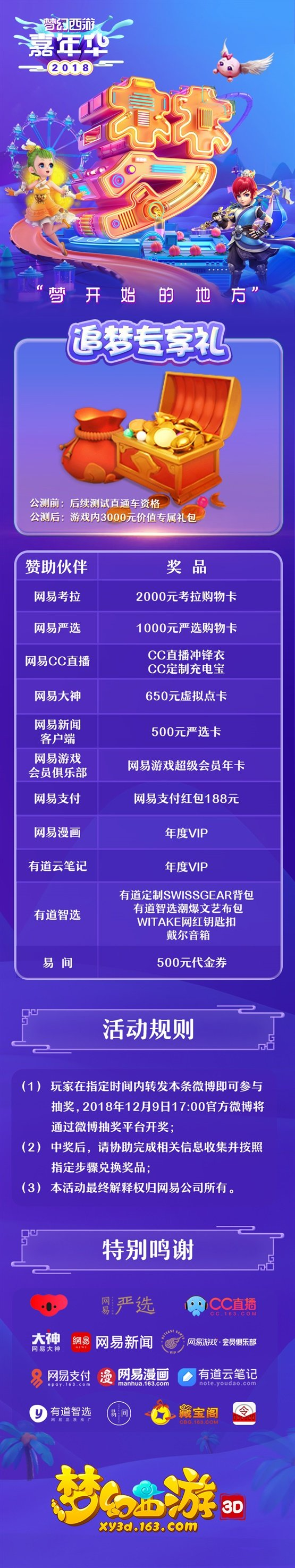 你有价值超过10000元的大礼包,成为《梦幻西游3D》锦鲤就在此刻! 12月8日,万众期待的梦幻西游2018嘉年华就将在广州保利世贸博览馆拉开帷幕。四季流转,爱梦如初,作为梦幻西游家族的最新成员,《梦幻西游3D》也将出现于嘉年华现场,为玩家送上重重惊喜。 除了嘉年华现场的众多福利与趣味互动,12月1日-12月9日,《梦幻西游3D》官方微博(@网易梦幻西游3D)还为所有玩家准备了一份超级惊喜的“追梦专享礼”! 现在,只要关注@网易梦幻西游3D,并转发活动微博,即可自动获得抽奖资格。在12月9日17:00,梦幻西游2018嘉年华落下帷幕之际,《梦幻西游3D》将在参与者中抽取一名幸运玩家,送上专属梦幻大礼包一份。化身《梦幻西游3D》锦鲤,就在此刻! 【携手11大网易品牌,寻找下一个网易锦鲤!】 那么,这位《梦幻西游3D》锦鲤将获得哪些好物呢? 除了追梦专享礼中所包含的后续测试直通车资格、公测游戏内3000元专属礼包之外,《梦幻西游3D》还携手网易考拉、网易严选、网易CC主播、网易大神、网易资讯客户端、网易游戏会员俱乐部、网易支付、网易漫画、有道云笔记、有道智选、易间等网易旗下顶尖潮流品牌。为锦鲤送出包括代金券、年度VIP、专属定制周边等专属好礼——总价值超过万元人民币! 【精彩不间断,嘉年华精彩蓄势待发】 除了微博抽奖活动,在12月8日~12月9日,玩家还能亲临广州保利世贸博览馆,与《梦幻西游3D》手游来一次亲密接触。届时,《梦幻西游3D》手游将在现场还原美轮美奂的东海海滨,以“四季流转,爱梦如初”为主题等待着诸位玩家的到来。 玩家可以在试玩区实机体验游戏,感受最新的捏脸玩法,参与各种趣味互动游戏,触摸三界心跳,还能通过线上线下抽奖,一试手气。 在12月8日下午13:30的梦幻西游年度发布会现场,《梦幻西游3D》还将为玩家带来一系列的重磅游戏更新情报。 如此丰厚的内容,相信一定能让玩家乘兴而来,满意而归! 在梦开始的地方,《梦幻西游3D》等待着与玩家一起,重温感动。 很快,梦幻西游2018嘉年华就将掀开它的神秘面纱。无论你是否将亲临现场,都可以加入这场狂欢之中,见证《梦幻西游3D》即将所带来的一系列惊喜,也许在此过程中,你也将化身《梦幻西游3D》锦鲤,成为三界少侠所艳羡的目标! 《梦幻西游3D》是由网易梦幻西游金牌团队研发的次世代3D即时制角色扮演手游,为梦幻西游品牌在3D领域的全新拓展。独创梦幻西游式国风美学,飞越全景西游世界,感受日夜交替、四时盛景。全新的西游成长体验,经典玩法3D重塑,兄弟同心组团开荒!专属的三界冒险之旅,自由结交仙魔精怪,善恶随心自主人生。即刻启程,触摸三界的心跳。 更多游戏详情请关注: 官方网站:https://xy3d.163.com/ 官方微信公众号:wymhxy3d 官方微博:网易梦幻西游3D 客服电话:95163686 扫码进入小程序预约游戏: 了解更多相关信息,请前往http://game.yzz.cn/html/info-7238.html |
