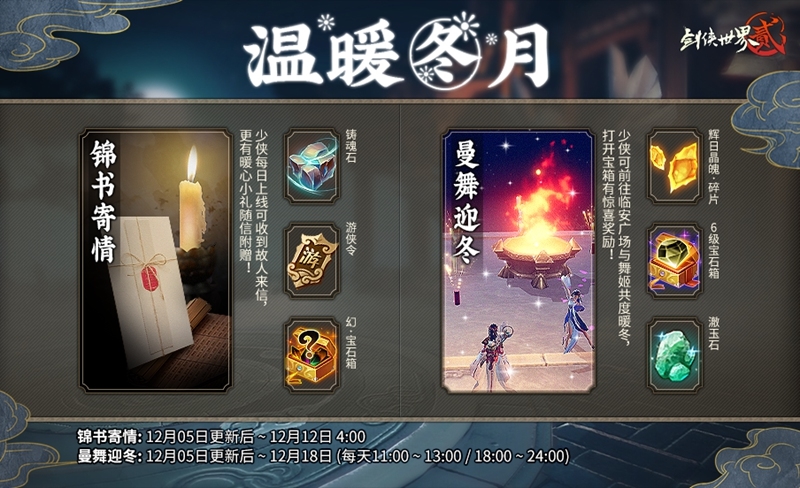 寒冬时节,不知各位少侠的窗外是否已经是一片银装素裹的世界了呢?在这个有些萧索的季节里,别忘了还有一个热闹的江湖和一群熟悉的陌生人在等你哦!《剑侠世界2》手游迎冬版今日温情上线,想不想来看一看,都有哪些故人给你来信了呢? 【锦书寄情 暖心江湖】 即日起,各位40级以上的江湖少侠每日登录游戏时,都将收到一封故人来信,随信还将有一些暖心小礼,不妨猜猜都是谁寄来的呢? 不过要记得,少侠每日登录都只能收到当日的来信,如果错过就是错过哦!当日来信的时间判定为当日4:00至次日4:00,活动时间持续至12月12日4:00,不要错过机会哦! 【曼舞迎冬 热闹有你】 即日起至12月18日24:00,临安城的广场上将于每日的11:00至13:00,18:00至24:00架设篝火,举办盛大的聚会!会有很多翩翩起舞的舞姬与各位江湖少侠共度暖冬! 活动期间,少侠在活动篝火附近娱乐不仅可持续获得角色经验和护法经验奖励,每隔一段时间,还会在篝火旁出现随机活动宝箱,成功开启后可是有机会获得珍稀奖励的哦! 【惊喜免单 同闯天涯】 为迎接冬日到来,奇珍阁将限时上架四款超值礼包,不仅购买开启后可获得珍稀道具和绑定元宝,更有机会在购买时触发免单奖励,不仅无需支付本次消费,还有额外银两红包可以领取哦! 与此同时,少侠在12月5日9:00至12月19日4:00期间累计充值并消费满足一定数量金额,还可获得多种充值促销回馈奖励!据说,双十二当天消费,还会有超值全免单活动哦!详情敬请关注后续的官方资讯和官方公众号推送哦! 《剑侠世界2》迎冬版今日暖心上线,寒冷冬日,一起来感受属于江湖的温暖吧! 官方网站:https://js2.xoyo.com/ 官方微信:jxsj2sy 了解更多相关信息,请前往http://game.yzz.cn/html/info-1649.html |