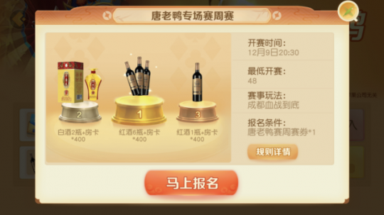 对重庆的小伙伴们来说,“生活麻辣烫”这部轻喜剧算的上是陪伴闲暇、本地人熟知的地方佳作。生动诙谐的演员们也凭实力圈粉无数——本地笑星唐老鸭各位也很熟悉辣,重庆人都知道!特别是在《网易棋牌》的重庆地区玩法中,就一直保留着生活麻辣烫里的唐老鸭、闷墩的特色皮肤,游戏场景里融入玩家生活中熟悉的人和事,这种接地气的方式使地方体验再度升级。 近期《网易棋牌》与本地笑星唐老鸭联名为重庆玩家奉上为期一个月的专场赛事——【重庆笑星唐老鸭专场赛】。赛事分为日赛、周赛并且场场都有专属福利,与此同时生活麻辣烫的主演唐老鸭也会下场与玩家一起分享欢乐搓麻玩牌,这才是一场人人都能融入,人人都爱玩的现实版生活麻辣烫! 赛事流程 (12月1日-12月31日) 日赛:每周一至周六晚八点,满50人准时开赛 周赛:每周日晚八点半,日赛前十名均可参赛 赛事奖励 日赛: 日赛名次 获得奖励 第一名 50元话费+周赛券 第二名 30元话费+周赛券 第三名 10元话费+周赛券 第四名-第十名 10张房卡奖励 周赛: 周赛名次 获得奖励 第一名 价值1608元红酒一件(6瓶) 第二名 价值336元白酒2瓶 第三名 价值160元红酒1瓶 第四名-第八名 50元话费 第九名-第十五名 30元话费 除了以上提到的这些奖品之外,周赛排名前十五的玩家均可享有获得网易棋牌代理资格,以及大量房卡奖励。更多赛事详情还可以添加客服微信:wycq002咨询详情! 除了以上的比赛,《网易棋牌》在重庆区域的子游戏中还有很多受当地玩家喜爱的特色玩法-推倒胡、三人两房、重庆麻将、幺地人等,这些均可以通过金币休闲场和约牌房两种模式来满足大家对地方玩法的追求。扫描下方二维码下载游戏,抢先参赛还能分享多重福利,【重庆笑星唐老鸭专场赛】人人都爱的血战玩法等你来挑战! 关于《网易棋牌》 《网易棋牌》是网易首款结合全国各地区玩法、高度还原地方特色文化的一款极具风格的棋牌游戏,汇聚地方棋牌生活,深度品味棋牌文化,打牌场景结合当地著名景点打造家乡亲切感,兼有多重花样赛事、福利活动…...经典与创新交融,应有尽有,精彩卓绝,下载即享重磅奖励! 可通过以下方式了解游戏最新动态: 官方网站:http://qp.163.com? 官方微博:网易棋牌 微信公众号:网易棋牌手游 |
