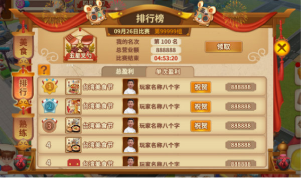 《舌尖上的中国》正版手游是一款由央视易橙与微视隆大联合开发,金刚游戏代理发行的以美食养成为主题的模拟经营手游。 游戏下载:http://uri6.com/tkio/VRf6Bna 上期小编为各位美食家介绍了如何举办“美食节”的教程 ,今天小编继续为大家介绍一下“美食节”排行榜与美食推广的玩法详解,一起来看看吧! 【举办美食节 收益口碑双赢】 在举办美食节之后,想要知道收益口碑如何,就可以进入排行榜单进行了解啦。举办美食节的星级越高,获得的收益也会增加。排行榜分为六个阶段:一星叉勺、二星叉勺、三星叉勺、四星叉勺、五星叉勺、六星叉勺。排行榜每天21点结算,结算完毕会发放勋章,勋章用来提升阶层。阶层越高,排名越高。每自然月重置一次阶位,每月月底最后一天21:00重置。结算后24小时不上线,则奖励作废。 每天21点结算后,可在排行榜中领取一份奖励。祝贺与被祝贺都可获得一份奖励。每天可领取一份阶段奖励。升阶后,还可领取一份升阶奖励。总之奖励丰富拿到手软哦! 【加强推广力度 占领全国领域】 除了举办美食节可以获得丰厚的利润和口碑之外,把美食推广到各地,让更多的人们尝到美食,也是重要的经营之道! 通过对各个省份的城市进行美食推广,每座城市都有数量不等的街区需要进行推广宣传!需要将这些据点都推广完毕才可解锁下一个城市。推广中,可以让美食合伙人出场,使推广宣传效率翻倍哦。推广宣传所消耗的红钞需要通过举办美食节获取哦! 每个城市最后一个据点,都要进行一次试营业挑战,需要菜品总分过关才可挑战成功。占领城市后,可在本城市内放置菜品进行营业。放置的菜品属性越好,奖励越高! 每推广一次小据点可获得金币奖励。在每个城市最后的试营业中,挑战成功会获得金币和其他道具奖励。在城市内放置菜品进行营业,可获得金币、经验及其他道具奖励。具体以游戏内为准。 以上就是小编为大家介绍的“美食节”玩法啦,具体玩法以游戏内为准。美食家们是不是已经开始摩拳擦掌想要启动美食节赚取奖励啦。表捉急~美食节即将在后续新版本中开放哦!让我们拭目以待吧! 了解更多相关信息,请前往http://game.yzz.cn/html/info-5525.html |