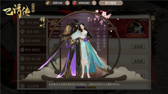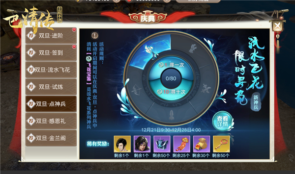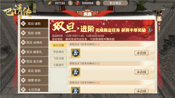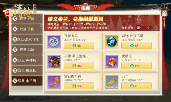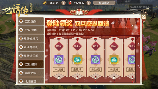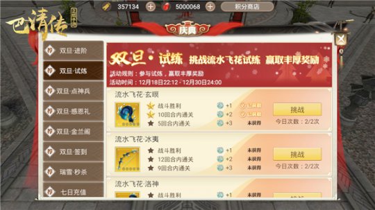 “双旦同庆迎凛冬,圣诞庆典拿豪礼” 由盛大游戏、心光流美联合发行的开放式3D手游《巴清传》即将开启双旦庆典活动。参与双旦庆典,不仅能获取多种珍稀游戏道具,更有绚丽的全新华服、全新系列武器等丰厚奖励! 【点神兵轮盘,赢流水飞花系列武器】 在双旦期间,全新武器-流水飞花系列武器震撼登场。想要获取流水飞花,需要消耗飞花宝鉴进行点神兵,就有机会获得流水飞花武器哟。使用飞花宝鉴点神兵,除了能获得全新系列武器外,还可以获得锦时·冠、头像·锦时、金兰币宝箱、宝石提升符、虎睛玉、金钥匙等丰厚道具 而飞花宝鉴可通过双旦签到、金兰阁兑换等方式获取 【流水飞花试炼 赢取丰厚奖励】 在双旦期间,各位主事大人可参与“流水飞花”主题试炼。挑战流水飞花系列武器试炼关卡,获胜可获金兰币。活动期间,根据挑战的关卡星级还将获得相应地飞花宝鉴奖励,星级越高奖励越多。 主事大人获得的金兰币,可在金兰阁中兑换飞花宝鉴、背饰·长夜飞星碎片、头像·霸王别姬、虎睛玉、宝石提升符、刀币等奖励。 【完成进阶挑战 赢取新背饰碎片】 在活动期间,主事大人只要完成指定的进阶任务,如获取流水飞花武器、挑战飞花试炼、七国游历等,就可领取背饰·长夜飞星碎片哦! 【累计充值 送极品宠物】 在双旦期间,主事大人累计充值达到规定数额就获得相应档次的奖励,奖励包括金兰币、飞花宝鉴、双旦限定华服·锦时、双旦限定头像框等奖励。 开放式3D手游《巴清传》即将开启“双旦盛典”系列活动。参与活动,不仅能获取多种珍稀游戏道具,更有绚丽的全新华服、全新武器以及全新背饰,等你来拿!双旦佳节,让我们一起乱世共武! 了解更多相关信息,请前往http://game.yzz.cn/html/info-6911.html |