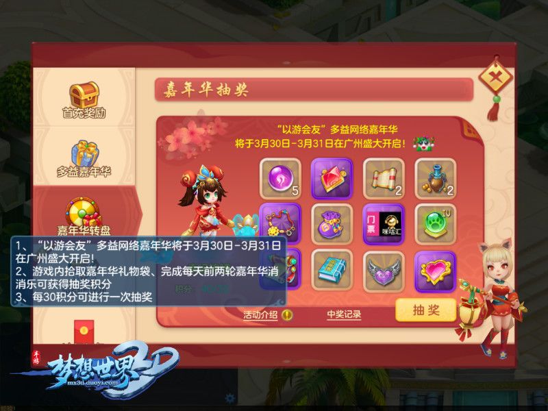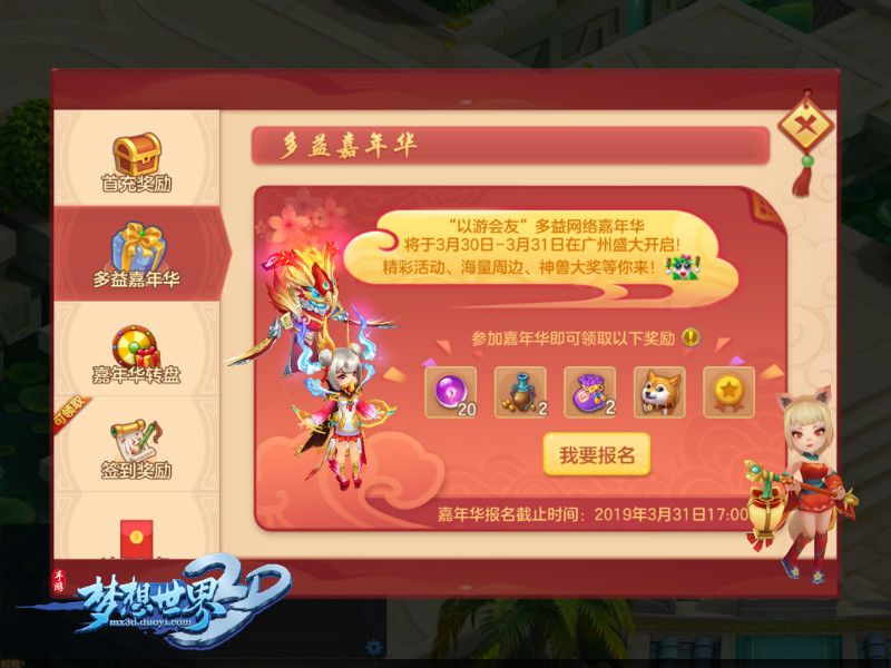 《梦想世界3D》三月全新内容“骑乐融融”即将上线,全新绝学助战回合,五大新宠风格百变,特色铭文宠物进阶,双人坐骑震撼登场!多益网络嘉年华将在3月30日-3月31日于广州国际媒体港召开,梦想大陆的少侠可免费报名参加,游戏内外缤纷活动礼品多多。 《梦想世界3D》手游官网:http://mx3d.duoyi.com/ 《梦想世界3D》手游下载地址:http://mx3d.duoyi.com/d/ 《梦想世界3D》手游特色站:http://mx3d.duoyi.com/topic/tese/ 《梦想世界3D》手游“云霄赐福”专题:https://mx3d.duoyi.com/jieri/newyear/ 《梦想世界3D》手游新服推荐:皓月当空、紫气东来 嘉年狂欢 乐在其中 2019年多益嘉年华将于3月30日-31日在广州市海珠区广州国际媒体港拉开帷幕,现场不仅有精美的伴手礼、海量周边,还有首次打响的梦想世界3D线下赛,无懈可击的队伍配置,定能给大家带来一场精彩绝伦的比赛。这个三月,在梦想大陆称霸一方的少侠们,都将齐聚羊城,共庆嘉年,共同狂欢。 缤纷活动 乐在其中 在这全城狂欢的喜庆日子里,游戏内的缤纷活动当然少不了,即日起至3月31日24点,在游戏内拾取嘉年华礼物袋和参加糖果消消乐可获得游戏道具与嘉年华积分,嘉年华积分可参与嘉年华转盘抽奖,每30积分参与一次抽奖,最高可获得咪咕音乐会门票,3月30日可与爱豆一起共庆嘉年华。 齐领礼包 乐在其中 各位少侠在游戏内报名之后在现场进行签到即可在游戏内获得包括随机宝图碎片与精美头饰在内的丰厚礼包,除此之外,线下还有缤纷活动,海量周边、神兽大奖等你来拿,赶快去报名参加赢取精美大奖吧! 关于《梦想世界3D》手游 《梦想世界3D》手游今日全平台公测开启!招式靠领悟,回合真策略!见招拆招更鲜活,216种招式相生相克尽展极限回合策略。释放想象,海量玩法极具创意,闯迷宫泡温泉惊喜等你来探。碎片收集萌宠进化,宠物养成独具特色。萌娃天降,浪漫社交温情相伴,同城好友推荐,享受真实梦想人生。更有炫酷时装翅膀、搞怪头饰、清凉泳装,独特外观百变搭配任你选! 《梦想世界3D》官网:http://mx3d.duoyi.com/ 《梦想世界3D》官方微信:mxsj3d |
