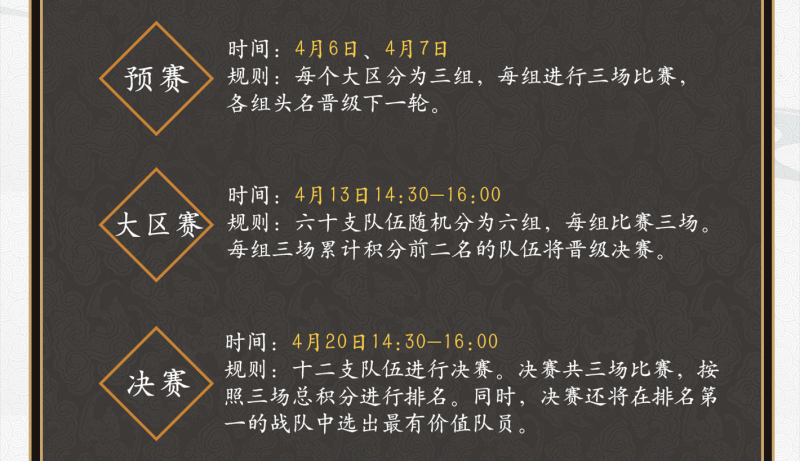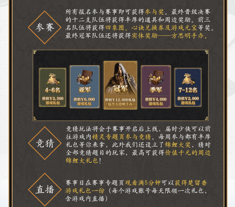 旌旗扬,战鼓响,《楚留香》首届生死剑冢全区服竞技大赛即将开启,全新赛事高燃宣传曲,更有超万元游戏礼包、方思明手办作为奖励。与江湖好友并肩,一起踏入这场生死剑冢的竞技盛宴! 官网地址(http://clx.163.com/) 【决胜天元 全区服竞技大赛开启】 自《楚留香》“生死剑冢”玩法上线以来,深受广大玩家的喜爱。本次“决胜天元”赛事作为《楚留香》第一届生死剑冢大赛,将在全区服开启,让各大区服的玩家齐聚一堂,一决高下。 “决胜天元”赛事将于4月1日开启,届时满足邀请赛参赛条件的玩家可组建战队。赛事流程共分为预赛、大区赛、决赛三个阶段:4月6日至7日进行预赛,根据三场预赛成绩的总积分晋级大区赛;在4月13日的大区赛中,成绩排名前二的队伍就能晋级至4月20日的决赛。 本届大赛不仅设有丰厚的游戏奖励,包括专属称谓、头像框、大量元宝,更有人气NPC方思明手办、官方精美周边大礼包等实物奖励。持续关注赛事参与竞猜并收看直播,同样也有好礼相赠。更多信息详情可前往大赛活动页面查看(http://cc.163.com/zt/clxjsty)。 【全新古风电音宣传曲 音乐人助力江湖战】 男儿何不带吴钩,《楚留香》联手网易云音乐,邀知名电音制作人LuckyMaxx尝试全新古风电音风格,操刀打造第一支PVP赛事宣传曲《吴钩行》,全曲气势磅礴,豪迈的武侠画面感迎面而来,相信定能为场赛事,添上一把助燃剂。本次全新PVP赛事宣传曲将于“决胜天元”预赛当天正式上线网易云音乐,敬请期待。 一腔热血难自控,豪气云天少年郎。江湖侠士,意气风发,到底谁能在这场赛事里荣登榜首,独占鳌头?《楚留香》决胜天元大赛,一触即发! (关注网易大神@楚留香手游 获取独家爆料和福利。) |