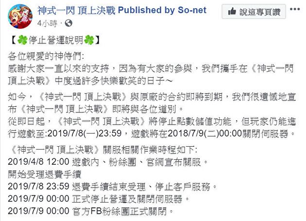 【多玩网4月9日讯】日本 Sony 企业在台分公司 So-net 近日宣布,旗下手机游戏《神式一闪 顶上决战》将在 2019 年 7 月 9 日 00 : 00 正式停止营运及关闭伺服器。 《神式一闪 顶上决战》是由日本游戏公司Applibot Inc. 制作发行,以日系少年热血动漫风格为主题,结合独特养成系统,玩家们可自由培育出继承神之力的战士【神侍】,搭配奥义技能打倒敌人秽灵,展开冒险之旅。 官方表示,感谢大家一直以来的支持,因为有大家的参与,官方与玩家携手在《神式一闪 顶上决战》中度过许多快乐欢笑的日子。如今,《神式一闪 顶上决战》与原厂的合约即将到期,很遗憾地宣布《神式一闪 顶上决战》即将与各位道别。从即日起,《神式一闪顶上决战》将停止点数储值功能,但玩家仍能进行游戏至2019 年7 月8 日(一)23 : 59,游戏将在2019 年7 月9 日(二)00 : 00 关闭服务器。 |
