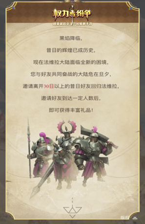 史诗荣耀,战报来袭。暗夜降临法维拉,黑焰来袭危机四起,英雄崛起时代迎来终结,新世界的大门已开启!网易首款全球开放策略手游《权力与纷争》新版本正式来袭猴,无数领主们斗志昂扬地携手走入新纪元,勇猛地迎接一波波全新挑战,向未知的世界发起全力冲锋!当领主们勇往直前之时,昔日的辉煌也并未消逝,一份由你亲手打造的时代战报即将震撼诞生,为你纪念英雄崛起时代的荣耀纷争历史,助你集结力量再次出发! 重拾昔日荣耀战报,英雄整装待发! 妖异的紫烟从王城上升起,乌鸦成群在衰败的城堡上盘旋,黑焰降临后的法维拉迎来的是鬼魅般的沉寂。当傀儡疯王再度现身,一个时代的辉煌已成为了过去。 重温往昔,英雄崛起时代发生在法维拉大陆上的一切,那一封封沾染了勇士热血的战报,书写下了亘古不灭的回忆:几大王国中各大城市纷争不断,领主们缔结联盟各显神通,展开了一次次激烈的争夺,有正面进攻的强势宣战 ,有夜袭城下的出其不意……在黑焰即将降临之时,领主们斗志激昂地对王城发起了一波波强力冲击,高战集结万众一心,一波波的冲锋陷阵,令王城脚下的战火熊熊燃烧……历史的车轮滚滚,然而那些挥之不去的荣耀,曾经挥洒的热血,一点一滴的付出,永远篆刻在所有人的心里! 为了让领主们能够纪念自己曾挥洒过的热血,同时还能与他人分享自己的荣耀纷争史,一份记载着领主们辉煌战绩的趣味战报H5横空出世,将领主们在法维拉大陆上最骄傲的一切记录在册,即使在新时代来临之际,你也可以骄傲地向世人展示自己光辉的过往! 首先,领主们登陆游戏之后,可以寻找点击帝国历,即可在界面右下角找到好友召回活动的入口。 进入活动界面,可以查看本次好友召回活动进行的时间,点击页面上“我的战报”按钮,玩家可以通过H5战报了解“黑焰降临”新版本中的背景故事,还能够获得一份特别的个人战报信息。领主们不仅可以和好友分享属于你的荣耀战报,更能生成邀请码,邀请曾经共同抗敌的老友们重回法维拉大陆,感受全新的挑战! 通过这份特别的战报,你可以充满骄傲地向世人展示你在法维拉所度过的光辉岁月,你将获得专属于你的荣誉,以纪念你不凡的经历。也许你是统帅三军威震四方的战争之王,或是精通经营之道的商业巨擘,甚至是潜心生产精工匠造的建筑大师……更重要的是,这份极具意义的战报将记下你的赫赫战功,纪念你曾为之奋斗的疆土,更为你曾挥洒过得热血留下永不磨灭的印记。快来生成属于自己的时代战报吧! 召唤老友重返法维拉,同享荣耀豪礼 有福同享有难同当,亲手挣下的战功同样不是一个人在奋斗。还记得那些和自己并肩作战的队友吗?你们同仇敌忾意气相投,曾经一同参与法维拉大陆上的激烈战斗,也曾携手化解一次次致命危机。多少次敌军兵临城下,自己苦苦支撑就快抵挡不住时,是你的队友在危急时刻赶到,成为你的最强助力,令局势化险为夷;如今新世界的大门已隆重开启,王城陨落城下对决之时,却不见了他的身影…… 2019年4月18日10点-5月9日8点,《权力与纷争》好友召回活动将在游戏内上线,快将你们曾经并肩作战的辉煌战绩生成一份特别的战报分享给昔日的队友吧,希望这些刻骨铭心的回忆能够助你召回那些昔日旧友,请他们再次踏上法维拉这片神秘的土地,一同见证新时代的来临。 在活动上线期间,阔别多日的领主们只需要根据步骤回归,无论是邀请好友的领主还是被邀请的一方,都有机会获得超诱人奖励,助力你们继续在黑焰降临新版本中并肩前行! 为了嘉奖号召力十足的领主们,只需要召回1位老友,领主就能够获得神秘信物礼盒、金币、夜星钻石、通用加速等丰富的道具奖励,当邀请人数达到一定标准之后,奖励还将继续加码!召集回的老友越多,领主获得的奖励就越贵重,邀请人数达到10人、20人的领主不仅将获得高额金币和丰厚的道具奖励,更能获得超珍稀的贵族信物礼盒,礼盒里的内容将更加诱人,快去邀请好友解锁这个珍贵的礼物吧! 英雄崛起时代落幕,黑焰降临新篇开启。回首过往,荣耀战绩历历在目,放眼未来,空前危机等待化解。《权力与纷争》为领主们量身定制最特别的英雄崛起时代战报,分享并邀请老友回归,即有机会获得豪华奖励!携手昔日战友,整装迎接新的大战吧,再次在碑上刻下属于胜者的英名,荣耀纷争将永无止境!关于游戏的更多玩法、更多精彩内容,请关注相关后续报道。 【关于《权力与纷争》】 《权力与纷争》是网易首款全球开放策略手游。游戏共有五大类型、四十余种不同建筑,玩家可在自己的领地中,精确规划资源实现最大化利用,发展农业、工业、军事,提升城市实力,抵御外敌入侵。游戏内有金钱帝国、工业巨擘与战争之王三大派系,各大派系天赋不同,给予玩家更多个性化发展空间,不同派系玩家也可通过合作共同提升实力。游戏中有丰富完善的贸易系统,玩家可凭借自己的商业能力低买高卖,上演逆袭。游戏中更有联盟竞赛与战争,及后期将要开启的跨服战和跨国战等多种战斗玩法,玩家可与真人斗智斗勇,享受策略战斗的快感。 官方网站:http://qlyfz.163.com/ 官方微博:https://weibo.com/qlyfz 官方微信:qlyfz163 |