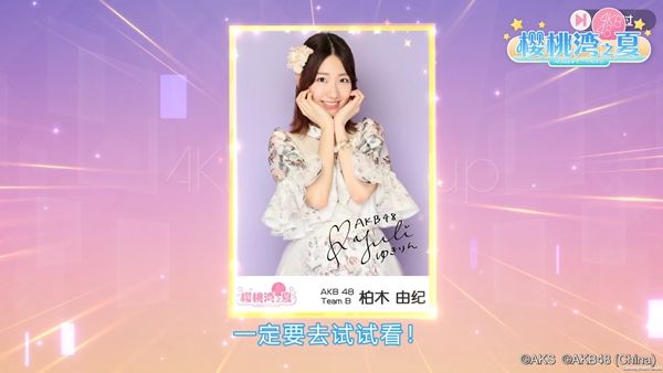 今日,备受关注的AKB48正版授权养成手游《AKB48樱桃湾之夏》又迎来了一位前辈的加盟,来自AKB48 Team B的柏木由纪。官方也将邀请柏木由纪担当《AKB48樱桃湾之夏》的测试招募官,诚邀粉丝们来到樱桃湾,体验经纪人之旅~ http://v.17173.com/v_4_4038020/Mzg5MjMwNDg.html http://video.duowan.com/play/9029549.html https://www.iqiyi.com/v_19rsgcu6lo.html 【柏木由纪小档案】 柏木 由纪 (Yuki Kashiwagi) 所属队伍:AKB48 Team B 生日:1991年7月15日 星座:巨蟹座 身高:164cm 家乡:日本国鹿儿岛县 梦想:歌手 喜欢的食物:西瓜、珍珠(珍珠奶茶里的) 【邀请测试招募报名开启】 《AKB48樱桃湾之夏》的测试招募官柏木由纪也给大家带来了好消息,游戏的邀请测试招募活动启动啦!你准备好了么?一起加入经纪人的行列,来到樱桃湾打造自己的专属女团!现在报名还有机会获得限量的生写及周边哦~ 邀请测试时间:2019年5月 测试环境:安卓系统各类手机 测试资格:300名 测试资格发放方式: 1、官网预约抽取:登录官方网站akb48ytw.web.sdo.com预约游戏并填写调查问卷,我们将从问卷结果中抽取符合测试资格的经纪人发放测试激活码。 2、TapTap报名:登录TapTap《AKB48樱桃湾之夏》专区,预约游戏并参与TapTap《策划面对面 来自经纪人的心声》活动,说出你对游戏未来的设想或建议,即有机会获得测试激活码。 《AKB48樱桃湾之夏》创新的经纪人视角养成玩法,可让大家体验真正的经纪人职工作内容,通过招募偶像,安排偶像特训、拍摄生写、演出等模拟经营活动,感受偶像养成的核心玩法,融入打造偶像女团的全过程。《AKB48樱桃湾之夏》经过了匠心研发后,现在终于有机会与玩家见面了。本次邀请测试欢迎各位玩家和粉丝报名,也欢迎大家提出宝贵意见,帮助项目组一起完善《AKB48樱桃湾之夏》。 ·关于《AKB48樱桃湾之夏》 《AKB48樱桃湾之夏》是盛趣游戏和AKB48 (China)共同发布的AKB48正版授权官方手游,目前正在开发之中,预计2019年上线。游戏设定在充满元气的樱桃湾,玩家们将在这里担当一名经纪人,培养自己的偶像,通过开放式游戏互动模式与偶像来一场跨次元的邂逅。游戏开发也将由AKS全程参与监修。《AKB48樱桃湾之夏》将于2019年与粉丝们见面。 《AKB48樱桃湾之夏》中文官网: akb48ytw.web.sdo.com 《AKB48樱桃湾之夏》官方微信:樱桃湾之夏 《AKB48樱桃湾之夏》官方微博:@AKB48樱桃湾之夏 《AKB48樱桃湾之夏》全球官网:akb48cbb.sdo.com 《AKB48樱桃湾之夏》官方Twitter:AKB48 CherryBayBlaze 《AKB48樱桃湾之夏》官方Facebook:AKB48 Cherry Bay Blaze |