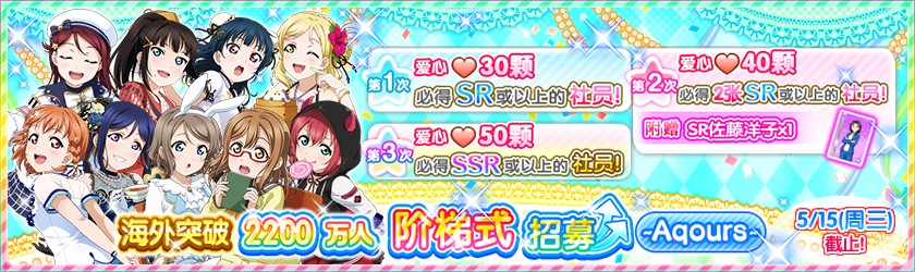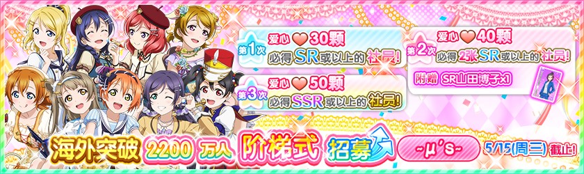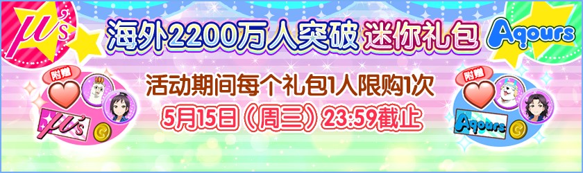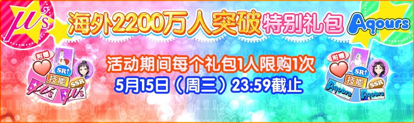 根据最新情报,由株式会社Bushiroad与KLab株式会社共同开发,盛趣游戏发行的全球人气音乐手游《Love Live! 学园偶像祭》海外玩家数突破2200万人! 《Love Live! 学园偶像祭》自推出以来,作为音游标杆之作,一直凭借精美的角色卡面及丰富多变的活动玩法深受玩家喜爱,在国内iOS音乐类游戏畅销榜常年稳居前三,多次获得苹果App Store推荐。 《Love Live! 学园偶像祭》随着游戏人气的提升,也给这款游戏IP带来了无穷的活力。如全国大赛的举办以及漫展的参展等丰富的线下活动已经让《Love Live! 学园偶像祭》成为了中国二次元文化中的一个品牌。 为了感谢各位玩家的支持,官方也推出许多庆祝活动,各位千万不要错过哦! ■登录奖励 海外2200万人突破登录奖励 【时间】 2019/5/7 15:00 ~ 2019/5/15 23:59 ★第1天★ 除通常的登录奖励外,可额外获得 爱心 1颗 ★第2天★ 除通常的登录奖励外,可额外获得 方糖[耐力50] 1块 ★第3天★ 除通常的登录奖励外,可额外获得 爱心 1颗 ★第4天★ 除通常的登录奖励外,可额外获得 方糖[耐力50] 1块 ★第5天★ 除通常的登录奖励外,可额外获得 爱心 1颗 ★第6天★ 除通常的登录奖励外,可额外获得 方糖[耐力50] 1块 ★第7天★ 除通常的登录奖励外,可额外获得 爱心 1颗 ※获得第7天的 爱心 奖励后,特别登录奖励活动随之结束 ■礼包商品 【贩卖时间】2019/5/7 15:00 ~ 2019/5/15 23:59 【贩卖礼包&详细内容】 「海外2200万人突破特别礼包μ's」 爱心 x 40 SR或以上社员招募券?μ's? x 1 SSR或以上社员招募券?μ's? x 1 【附赠】爱心 x 10 【附赠】SR或以上技能支援招募券x 1 【附赠】SR山田博子 x 2 【附赠】SR羊驼 x 2 价格:138元 「海外2200万人突破特别礼包Aqours」 ?爱心 x 40 ?SR或以上社员招募券?Aqours? x 1 ?SSR或以上社员招募券?Aqours? x 1 【附赠】爱心 x 10 【附赠】SR或以上技能支援招募券 x 1 【附赠】SR佐藤洋子 x 2 【附赠】SR小香菇 x 2 价格:138元 「海外2200万人突破迷你礼包μ's」 爱心 x 20 SR或以上社员招募券?μ's? x 1 【附赠】爱心 x 5 【附赠】SR山田博子 x 1 【附赠】SR羊驼 x 3 【附赠】G x 500,000 价格:68元 「海外2200万人突破迷你礼包Aqours」 爱心 x 20 SR或以上社员招募券?Aqours? x 1 【附赠】爱心 x 5 【附赠】SR佐藤洋子 x 1 【附赠】SR小香菇 x 3 【附赠】G x 500,000 价格:68元 【注意事项】 ?上述各礼包活动期间,1人限购1次 ?礼包商品只能通过各种付款方式进行购买,无法以爱心进行购买。 ?所购买的「SR以上技能支援招募券」、社员以及「G」会送至礼物盒,其他的道具、票券则会直接加入玩家账号中。 ■限定课题 庆祝海外玩家数突破2200万人的期间限定课题登场! 海外2200万限定课题 【期间】2019/5/7 15:00 ~ 2019/5/15 23:59 【内容】通关指定曲目就能达成的课题。 ※课题的详细内容请在上述活动期间至游戏内确认。 ■期间限定歌曲 活动期间,在普通歌曲中广受好评的部分曲目将作为特别歌曲登场! 另外,还有机会游玩到那些需要达到特定Rank或完成特定课题才能游玩的曲目! 千万别错过哟? 海外突破2200万 期间限定歌曲 活动时间:2019/5/7 15:00 ~ 2019/5/15 23:59 【开放曲目】 《μ's》 再会了再见! 没有出口的猎户座 香格里拉的淋浴 春情浪漫 你着欢喜我喜欢着你 心灵之焰 然后是最后一页 软绵绵的哦 哈喽,数星星吧 ?←心脏跳动 《Aqours》 心动雀跃,就是要跳舞! 天空与心灵放晴 心-跳-周! 白日梦勇士 G弦上的灰姑娘 欢乐派对列车 追逐太阳吧! 在你双眸中围绕冒险 我的舞蹈☆今夜 奇迹波浪 ※开放难易度:容易、普通、困难、专家 ※首次完成歌曲奖励为友情点*500 ■获得绊点、金币增加 在限定期间内通关演唱会时所能获得的绊点将会变成2倍、金币会变成5倍? 快趁这个机会多多游玩演唱会! 【期间】2019/5/7 15:00 ~ 2019/5/15 23:59 【注意事项】 ?活动期间游玩普通歌曲、特别歌曲的曲目所获得的绊点、金币都会增加,但游玩街机谱面曲目则不在本活动范围。 ?歌曲列表画面筛选功能中的「获得金币提升」选项在活动期间会无法使用。 ?活动期间于歌曲列表画面上虽然仅会显示「获得绊点 2倍」,但实际通关演唱会时除了获得2倍绊点以外,也会获得5倍「金币」。 『海外突破2200万人阶梯式招募?μ's?』登场! 【时间】 2019/5/7 15:00 ~ 2019/5/15 23:59 【内容】 第1次:爱心30颗、必得SR或以上的社员! 第2次:爱心40颗、必得2张SR或以上的社员!附赠SR山田博子x1 第3次:爱心50颗、必得SSR或以上的社员! 【注意事项】 ?招募对象为截止至2019年4月26日于优等生招募中登场过的μ’s社员。 ?登场的社员和出现率请查看招募详情。 ?「海外突破2200万人阶梯式招募~μ' s~」计算在优等生奖励内。 『海外突破2200万人阶梯式招募?Aqours?』登场! 【时间】 2019/5/7 15:00 ~ 2019/5/15 23:59 【内容】 第1次:爱心30颗、必得SR或以上的社员! 第2次:爱心40颗、必得2张SR或以上的社员! 附赠SR佐藤洋子x1 第3次:爱心50颗、必得SSR或以上的社员! 【注意事项】 ?招募对象为截止至2019年4月26日于优等生招募登场过的Aqours社员。 ?登场的社员和出现率请查看招募详情。 ?「海外突破2200万人阶梯式招募~Aqours~」计算在优等生奖励内。 今后也请继续支持《Love Live! 学园偶像祭》! ▼关于「Love Live!」Project Love Live!是以「大家一起实现梦想」为关键词于多媒体展开的学园偶像计划。 以学园偶像团体「μ's(缪斯)」为中心,不仅推出了附动画PV的音