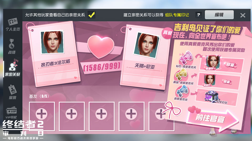 爱要勇于表现,更要大声宣布,让所有人分享你的幸福!网易快节奏开黑枪战竞技手游《终结者2:审判日》520真爱周浪漫开启,“官宣CP”甜蜜上线,天眼系统重磅回归,生化演习玩法升级,好友福利惊喜连连,全新外观酷炫登场!这个520,在吉利岛和无畏峡湾,让浪漫值爆表! 天眼系统机制优化,生化演习全面升级 本周,《终结者2:审判日》打击外挂的终极利器“天眼系统”震撼上线,天眼委员们将凭借自己丰富的经验和非凡的技巧,人工对疑似使用外观行为进行判定,《终结者2:审判日》将以其作为重要参考,进一步提升打击外挂的力度和精准性!天眼系统还新增委员判断复查机制,如天眼委员存在多次不经观察即随意判断正常玩家为外挂的行为,将被暂停委员资格,有力的保障了正常玩家的权益。 备受玩家追捧的生化演习模式也再度升级——玩法地图由吉利岛更换为无畏峡湾,不仅地图面积显著增大,地形复杂度也大大提升,感染者和人类的斗争将更为烧脑。感染王机制加入,游戏最后一分钟,当感染者处于劣势时,感染分最高的感染者玩家将化身为感染王,血量、移速和跳跃能力将得到提升,它将率领感染者阵营逆势反攻,绝境出击!无畏峡湾之上,究竟是病毒肆虐,还是人类获胜?你就是最关键的因素! 官宣CP正式登场,浪漫一周奖励不断 还有什么,比并肩作战的感情更加深厚坚韧?如果你已经与心中的他/她无数次奋战在终结战场上,如果你们已经结下了深厚的情谊,那就让“官宣CP”称号来证明你们的爱吧!本周,真爱好友隆重升级,“官宣CP”正式登场,只要累计亲密度达到指定数值,即刻解锁这一称号,还可赢取专属头像框、印记等奖励。 浪漫的520即将到来,《终结者2:审判日》也为你和你的好友备下了诱人的礼物。本周,每日与好友组队进行游戏即可领取金币、玫瑰花束等奖励,别羡慕,这就是爱的力量。假如你的好友已经暂别终结战场,那就赶紧召唤他回归吧!精美的野火套装等待你的领取! 叛逆外观酷炫亮相,全新配件无所遁形 深受玩家喜爱的远程冷兵器复合弓迎来全新专属配件“追踪器”,装配追踪器后,复合弓发射的箭头上将附着大量追踪单元,能够附着在15米范围内的活动玩家身上,2秒时间内,他们在你眼中将无所遁形!在激烈的掩体攻坚战中,这一配件将助你精准侦查敌情,制定出更具针对性的攻坚战术。 至尊补给狂拽上新,叛逆狂徒系列外观联袂登场。该外观由男性时装“危险分子”,女性时装“反叛少女”,跑车外观“叛逆者”,大马士革刀外观“一千吨铁锤”及降落伞外观“叛逆者飞行器”组成。在危机四伏的终结战场上,墨守成规注定败走麦城,偶尔的叛逆和个性,反倒会为你带来酣畅淋漓的胜利!平日里忍受了太多误解和麻烦的你,就在《终结者2:审判日》中尽情当一次叛逆者吧! 游戏内活动继续上演,完成各类任务即可领取叛逆勋章,可用于兑换多种高级外观,还有考拉红卡登录即可领取,购物优惠任你畅享;抽取至尊补给可获得额外奖励,达指定次数更可直接领取橙色时装、载具皮肤等奖励;乱斗竞技场玩法轮换为决战赛博坦,超小的战斗地图,丰富的物资投放,让你亲历最惊心动魄的厮杀。 网易快节奏开黑枪战竞技手游《终结者2:审判日》浪漫520真爱周正式开启,丰富更新内容,海量惊喜福利邀你上线体验!登录游戏官网,查看更多游戏资讯! |