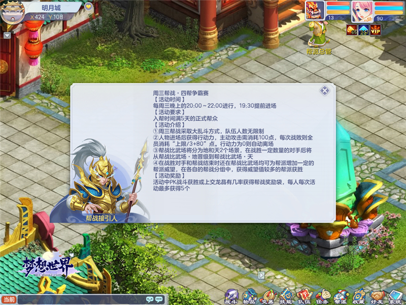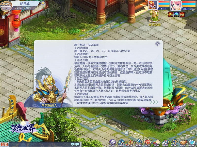 十二年经典IP,国风武侠回合战斗网游全新《梦想世界》拥有富有策略的战斗系统,主辅流派双修,12个流派400种招式,多种多样的PK玩法为你带来极致的战斗体验。决战龙渊四帮争霸,全新《梦想世界》帮派竞赛最强PK,快来一战到底吧! 全新《梦想世界》官网:https://mx.duoyi.com/ 全新《梦想世界》品牌站:https://mx.duoyi.com/act/dream/ 全新《梦想世界》回归专题页:https://mx.duoyi.com/act/huiliu/ 全新《梦想世界》攻略站:https://mx.duoyi.com/glz/ 决战龙渊 守卫帮派荣耀 全新《梦想世界》每周一开启决战龙渊帮派竞赛活动,帮派对战彰显实力,守卫荣耀决战龙渊。帮派竞赛决战龙渊是各帮派间一对一对战的对抗活动,每周一晚上的20:00到21:30开启,等级≥30级的帮派成员可提前半个小时参加入场,各位少侠赶快来积极参加,为守卫帮派荣耀而战。 帮派竞赛中,每位玩家入场时都会获得一定的行动力,主动攻击、战斗失败或者逃跑会扣除行动力,行动力为零时将被传送回明月城。各位玩家可选择通过PK战胜对手直接对敌方巨龙造成伤害,或者单人拾取或夺取敌方玩家龙晶上交来提升己方巨龙伤害。 帮派竞赛以率先将敌方巨龙血量攻击至0点帮派为胜,若巨龙同时存活,则根据巨龙血量或双方PK表现来决定胜负,同时若一方帮派场内人数不足五人时将被判负。活动中PK胜利或者上交龙晶还能获得帮战奖励,每人每次活动最多获得5个,胜利方加油胜利者宝箱,同时战斗中表现出色的玩家还会获得额外奖励袋,各位少侠一定要积极对战,赢得胜利,守卫帮派荣耀。 一较高下 四帮争霸赛 全新《梦想世界》四帮争霸赛于每周三晚上的20:00至22:00开启,所有入帮时间满5天的正式帮众即可组成队伍前往明月城帮战接引人(421,106)处参加,少侠们为了帮派的荣誉,快把队伍组起来大“杀”四方吧! 帮战采取大乱斗的方式且队伍人数无限制,少侠们入场后获得一定的行动力,需要注意的是,主动攻击则消耗100点行动力,并且战败后全员消耗一定的行动力,如果队伍的行动力降为零则自动离场。比武场分为天与地两个场景,如果胜利次数达到一定则会进入高阶的场景“天”,对决获胜与帮战结束后还在比武场的少侠将能为本帮派增加威望值,最终威望值多的帮派获胜。如此则需要各位少侠巧妙的利用行动力,仔细策划每一次的攻击,衡量自身实力,精准出击,方能达到威望之巅。 关于全新《梦想世界》 全新《梦想世界》,国风武侠回合战斗网游,十一年经典回合IP,以主修辅修双流派的强大招式体系,继承见招拆招、相生相克的策略战斗特色;同时打造深度游戏世界观,全新美术升级,明月如初,国风新起,这一次,江湖等你缔结侠缘! 更多游戏详情,请关注多益网络 全新《梦想世界》官网:http://mx.duoyi.com 全新《梦想世界》客户端下载:http://mx.duoyi.com/down/ |