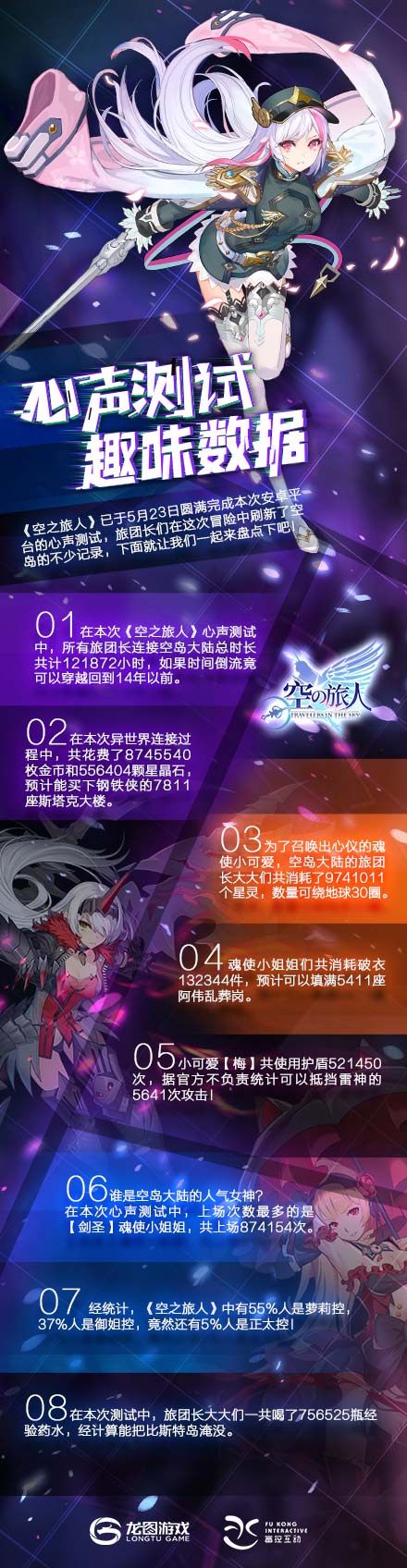 距离心声测试已经过去8天了,各位旅团长大大有没有想念我们可爱的魂使小姐姐和奇幻的空岛大陆呢?大家可能不知道,在这次冒险中,旅团长们可是刷新了好多有趣的数据呢,今天就给大家献上一份【趣味数据大揭秘】!接好了哟~ 没有参加测试的宝宝们会不会觉得不明觉厉呢?快来访问《空之旅人》官网,搭上下次测试的早班车,空岛大陆埋藏了更多惊喜等你挖掘~ 《空之旅人》是一款由龙图游戏发行的日式幻想卡牌RPG二次元手游。故事以魔幻异世界的空岛为背景,讲述了一群为抵制灾兽侵袭而生的人造兵器“魂使"的故事。游戏采用回合制策略战斗,玩家通过美少女卡牌的收集和羁绊育成,自由组建阵容,为空岛的未来和少女的命运而战。独创的绝境破衣和弹幕抽卡等亮点,为玩家的旅途增添更多趣味体验。 《空之旅人》官网:http://kzlr.longtugame.com/ 《空之旅人》官方微博:https://weibo.com/6621274091/ 《空之旅人》QQ群:734656787 《空之旅人》官方微信:空之旅人 |