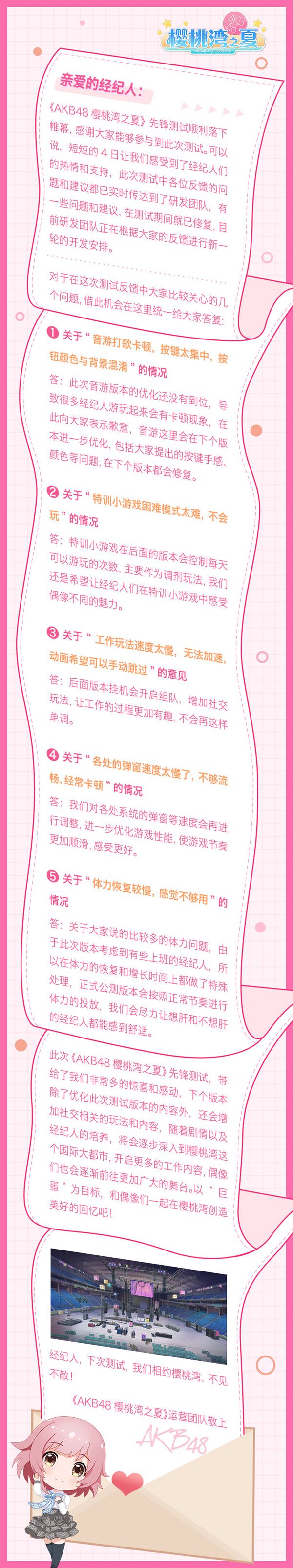 AKB48正版授权偶像养成手游《AKB48樱桃湾之夏》先锋测试日前完美落幕,官方也收到了数千条玩家的意见和反馈。今日,运营团队致谢各位“经纪人”,感谢大家对于先锋测试的支持,并对于大家集中关心的问题给予了答复,全文内容如下: 亲爱的经纪人,大家好: 《AKB48樱桃湾之夏》先锋测试顺利落下帷幕,感谢大家能够参与到此次测试。可以说,短短的4日让我们感受到了经纪人们的热情和支持,此次测试中各位反馈的问题和建议都已实时传达到了研发团队,有一些问题和建议,在测试期间就已修复,目前研发团队正在根据大家的反馈进行新一轮的开发安排。 对于在这次测试反馈中大家比较关心的几个问题,借此机会在这里统一给大家答复: 1、关于“音游打歌卡顿,按键太集中,按钮颜色与背景混淆”的情况 答:此次音游版本的优化还没有到位,导致很多经纪人游玩起来会有卡顿现象,在此向大家表示歉意,音游这里会在下个版本进一步优化,包括大家提出的按键手感、颜色等问题,在下个版本都会修复。 2、关于“特训小游戏困难模式太难,不会玩”的情况 答:特训小游戏在后面的版本会控制每天可以游玩的次数,主要作为调剂玩法,我们还是希望让经纪人们在特训小游戏中感受偶像不同的魅力。 3、关于“工作玩法速度太慢,无法加速,动画希望可以手动跳过”的意见 答:后面版本挂机会开启组队,增加社交玩法,让工作的过程更加有趣,不会再这样单调。 4、关于“各处的弹窗速度太慢了,不够流畅,经常卡顿”的情况 答:我们对各处系统的弹窗等速度会再进行调整,进一步优化游戏性能,使游戏节奏更加顺滑,感受更好。 5、关于“体力恢复较慢,感觉不够用”的情况 答:关于大家说的比较多的体力问题,由于此次版本考虑到有些上班的经纪人,所以在体力的恢复和增长时间上都做了特殊处理,正式公测版本会按照正常节奏进行体力的投放,我们会尽力让想肝和不想肝的经纪人都能感到舒适。 此次《AKB48樱桃湾之夏》先锋测试,带给了我们非常多的惊喜和感动,下个版本除了优化此次测试版本的内容外,还会增加社交相关的玩法和内容,随着剧情以及经纪人的培养,将会逐步深入到樱桃湾这个国际大都市,开启更多的工作内容,偶像们也会逐渐前往更加广大的舞台。以“巨蛋”为目标,和偶像们一起在樱桃湾创造美好的回忆吧! 经纪人,下次测试,我们相约樱桃湾,不见不散! 《AKB48樱桃湾之夏》运营团队敬上 2019年6月 |