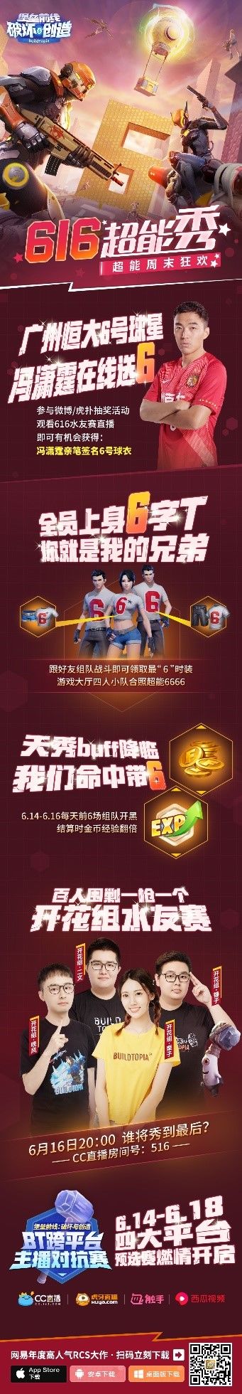 网易首款RCS即时创造射击手游《堡垒前线:破坏与创造》(以下简称《堡垒前线》)正式迎来“六月·超能月”。今天,超能秀周末狂欢也将在6月14日开启:除了游戏内开设海量超能福利、跨平台主播对抗赛、616开花组水友赛,更有广州恒大6号球星冯潇霆在线送6!只要参与各种活动,探险家就能获得丰厚线上线下奖励,随时随地秀不停! BT超能周末狂欢 6字T上身你就是我的兄弟! 超能周末狂欢,即将拉开帷幕!在探索启明星之谷的过程中,出色的队友能让这次探险之旅事半功倍。活动期间,探险家只要和好友组队战斗,即可领取最“6”时装!届时,大家还可以呼朋唤友穿上6字T,在游戏大厅合照6666一起秀出圈!! 除了精美的“6”字时装免费领取以外,《堡垒前线》还将于6月14日~6月16日为探险家送上天秀BUFF。在活动期间,探险家每天前六场组队开黑活动都将在结算时,获得额外的金币和经验翻倍奖励,加速成长轻松上分就在此刻! 跨平台主播对抗赛开启 开花组水友赛616看你秀 在6月14日~6月18日,来自CC直播虎牙直播、触手直播、西瓜视频四大直播平台的主播还将打响《堡垒前线》跨平台主播对抗赛预选赛,在这一赛事中,《堡垒前线》将为优胜战队送上2万人民币现金大奖以及对应平台专属皮肤设计权利,让优胜战队能将自己的荣耀烙印于启明星之谷中! 告别了安德罗妮×板娘这对明星主播组合,在6月16日20:00,启明星之谷又将迎来开花组水友赛。届时,探险家可以前往CC直播房间516,一睹锤子、栗子、二文、晚风四大开花组主力的各种骚操作。 广州恒大6号球星冯潇霆 亲笔签名球衣限量送 在探险家们体验诸多游戏内精彩活动时,《堡垒前线》还将在游戏外为探险家送出专属明星好礼。6月14日起,探险家只要参与官方微博抽奖、看开花水友赛直播、虎扑盖楼活动以及直接参与开花组水友赛,都将有机会获赠由广州恒大球星冯潇霆送上的亲笔签名6号球衣一件,让冯潇霆为你点赞! 现在,《堡垒前线:破坏与创造》超能秀周末狂欢已经开启!无论是时尚新装6字T,还是冯潇霆亲笔签名6号球衣都已经为探险家们准备妥当。如果探险家想要将这些好礼收入囊中,不妨叫上自己好友,前去挑战一番开花组水友赛,或是收看跨平台赛,也许幸运就会降临于你身上,让冯潇霆也为你的天秀爆灯! |