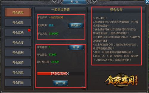 《贪玩蓝月:传奇来了》是由贪玩游戏平台推出的一款ARPG游戏。天王郭富城亲自试玩贪玩蓝月,一上手就爱上这款游戏,加入贪玩蓝月跟郭天王一起爆超级神装! 《贪玩蓝月:传奇来了》手游官网:http://m.tanwan.com/wzcq/ 近几年,越来越多明星代言传奇游戏,各类广告视频层出不穷,可谓令人眼花缭乱。你可能不知道的是,天王郭富城原来也是一位传奇老玩家。在体验过这么多款传奇游戏之后,郭富城说出了他最爱的一款,那就是《贪玩蓝月:传奇来了》!这不,他最近空降贪玩蓝月的玩家现场,并向玩家们实力推荐这款天王心目中最喜欢的真传奇游戏,并踢爆假传奇游戏的内幕,惊呆了一众玩家! 吃下郭天王的这颗安利: 你肯定没想到的是,作为《贪玩蓝月:传奇来了》的老玩家,郭富城早就在游戏内建立了自己的帮会!想要加入天王的帮会与天王并肩作战吗?那就要好好了解一下游戏的帮会系统了。游戏是个小社会,一个虚拟的社会,那么有社会就会有群体,有组织,帮会系统就是游戏中建立组织的系统。首先,建立帮会需要一些基础条件。 一、 个人等级为70级,即开启帮会系统后才可以建立。 二、 建立的人需要充值的VIP等级为2级(VIP2)。 帮会总共有8项功能:帮会信息、帮会成员、帮会活动、帮会仓库、帮会福利、帮会图腾、帮会消息、帮会列表。 帮会信息:你可以查看帮会名称、自己的职位、帮会总人数、帮会等级和升级条件、弹劾会长、退出公会,还有一个最重要的,帮会公告!其中几项需要着重提一下: 一、 弹劾会长:需要会长离线时间超过48小时,弹劾时间为一天,需要帮会成员投票表决,按照赞成和反对数来决定弹劾成功和失败。 二、 退出公会:如果是自己退出公会则需要等待2小时才能重新加入新的帮会,如果是被有职位踢出则不需等待就能即刻加入新的帮会,需要注意的是无论是怎么退出帮会的,走之前一定要拿清帮贡,不然退出或者被踢后是直接清空帮贡的哦。 帮会活动:这里是属于帮会的活动,有帮会的玩家才可以参加。有4项分别是:帮会禁地、帮会BOSS、帮会采集、帮会押镖。除去帮会禁地每日可进行3次,其他3个活动则是特定日子特定时间才能参加。 帮会仓库:帮会仓库是装备来源的途径之一,甚至对于一些玩家来说是装备主要的来源途径,在这里,你可以通过存放非绑定装备或捐献金币得到一定额数的贡献,贡献数足够后,可以兑换仓库里的装备(每件装备都会有固定额数的帮贡值,可点击装备查看)。这里需要注意的是帮会5级后,帮主可进行兑换限制操作,例如3转以上装备(包括3转)需精英或以上职位才可随意兑换。 帮会福利:这是一个比较重要的功能,这个功能和别的功能不同的是,有3个小功能,分别是:帮会红包、贡献商城、管理工资。 帮会红包,就是发元宝红包的页面,可设置数额和数量,并且可以查看各个玩家抢到了多少元宝。(每个玩家每天最多只能发1万5的元宝)。贡献商城,顾名思义,就是使用帮会贡献来购买的商城,在这里可以购买各种日常所需的物品,贡献商城是根据开区时间逐步开放新的售卖品的哦。管理工资,做帮会管理那么辛苦,怎么可能没有报酬呢,管理工资就是领取报酬的地方,每天只可领取一次,按照帮会和个人活跃度来计算工资。(建议大家等到晚上下线时再领取,那样获得更多)。 《贪玩蓝月:传奇来了》是一款大型多人ARPG游戏,采用全2.5D图像技术,通过即时的光影成像技术,营造亦真亦幻的游戏世界。游戏美术设计上汲取了东西方的美术元素,使用玄幻而写实的美术风格,人物造型华丽而独特,富有真实立体效果和绚丽的光影。游戏参考了大量中国古代神话故事和传说,并加以独创的发挥,塑造出一个奇幻的东方神话世界。 《贪玩蓝月:传奇来了》手游官网:http://m.tanwan.com/wzcq/ |