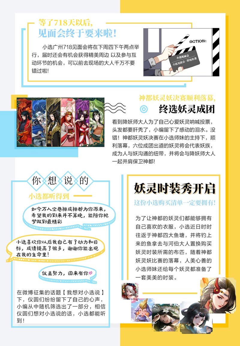 网易新概念妖灵大作《神都夜行录》最新一期小选周刊已于近日正式上架,预告小选见面会将于7月18日下午两点正式举行。并且公布神都妖灵妖终选阶段最后的晋级者,以及将要开启的妖灵时装秀时间,降妖师们可以在活动期间兑换珍贵时装哦! 震撼来袭 小选见面会 7月18日下午两点,小选广州718见面会将隆重开幕!现场不仅有大量免费精品周边放送,还有精心设计的互动环节等待降妖师们前来参与。同时为了将更多降妖师粉丝的心声传达给小选师妹,游戏在新浪微博设立征集话题“我想对小选说”。届时,官方将会从中筛选一部分,所以粉丝的心声有机会让小选师妹听到!届时,官方将会从中选取一部分幸运粉丝的留言,亲手交给小选师妹哦!作为仪圆的你,想要对小选直接传达自己的心声吗?那就不要错过这个机会,快把想对小选说的话发出来吧! 成团在即 神都妖灵妖 7月11日,在小选师妹的协助下,神都妖灵妖活动终选阶段已经完美落幕!男子组最后胜出者为大司命、应龙、司羿,女子组最后胜出者为少司命、山鬼、阿织,在此恭喜这6位妖灵成为妖族代言人。另外,神都妖灵妖成团见面会也将在7月18日正式开幕,届时以大司命、少司命为首的妖族代言人将成为人与妖灵沟通的纽带,与降妖师们一起保护盛唐神都! 免费兑换 妖灵时装秀 除此之外,《神都夜行录》妖灵时装秀也于近日上线,降妖师们可以使用各种鱼去河伯处兑换布匹,来兑换心仪的时装。另外,《白蛇:缘起》联动活动“缘起千年梦浮生”将于7月18日正式开启,全新妖灵白娘子将携手小青一同登场。作为《神都夜行录》暑期开始的序幕,本次活动为降妖师们准备了海量福利。其中联动皮肤“白蛇:缘起”将重磅降临神都,另外还有妖灵碎片、幽都神藏等丰厚奖励。 《神都夜行录》“神都妖灵妖成团见面会”将于7月18日在萤火虫漫展L3展厅5号馆A04正式开启。 【神都夜行录】 国韵之美,归于盛唐。网易新概念妖灵手游《神都夜行录》是一款国风妖怪收集RPG手游!在游戏中,你可以奇遇万千妖灵,体验绝美百妖剧情!盛世大唐,国韵美学,让你亲历神都风志!每有妖物作乱之日,便是降妖师现身之时,让我们一起走进国风妖怪的世界! 《神都夜行录》官网:http://sd.163.com/ 《神都夜行录》微信公众号:神都夜行录 《神都夜行录》官方微博:神都夜行录 《神都夜行录》官方抖音号:神都夜行录降妖司 《神都夜行录》官方贴吧:神都夜行录 《神都夜行录》网易大神:神都夜行录 |