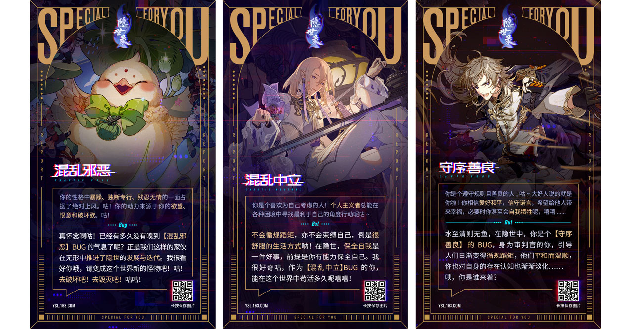 变成一个BUG入侵到虚拟游戏《隐世录》手游(隐世录官网:https://ysl.163.com/)中,会是一种怎样的体验? 按照《隐世录》手游(隐世录官网:https://ysl.163.com/)的官方设定,隐世,表面上是创世神守护下的理想乡,实质上,却是一个受程序操控的虚拟电子世界。而 “BUG”,就是违背程序设定的东西,是错乱的游戏世界,是隐世居民觉醒的意识,还有可能是程序员敲错的代码…… 其中最大的BUG,正是“入侵”隐世的玩家! 【“BUG”也要分个类?一分钟识别你是什么BUG】 在《隐世录》手游(隐世录官网:https://ysl.163.com/)中,作为“BUG”的玩家的不同选择,会对隐世造成不同的影响……这些影响有时候甚至会脱离玩家本意。 如果你是个崇尚自由的“BUG”,决心带领隐世居民冲破程序的桎梏。也许热爱秩序的你是个守序善良的“BUG”,为了隐世的稳定与和平,不惜化身修罗消灭外来者。 是守序还是混乱?是善良还是邪恶?一切取决于玩家的阵营和选择。 点击链接(https://ysl.163.com/bugcs/m/)或扫一扫下方二维码,进入隐世直通飞艇!虚拟世界也逃不过分类的命运,马上化身BUG入侵《隐世录》手游(隐世录官网:https://ysl.163.com/)中,一分钟识别自己是什么种类的BUG吧! 在这一分钟的隐世之旅中,你有可能遇到 “再见已成敌人的昔日兄弟”、“有钱有权却坏到不行的结婚对象”等,这些神秘角色应该如何分类?敬请关注《隐世录》手游(隐世录官网:https://ysl.163.com/)后续解禁的角色情报。 【更多情报陆续解禁】 对《隐世录》后续版本情报感兴趣的玩家,也可以持续关注官方微博@隐世录手游,关注官方微信“隐世录手游”(yslsy163),或登录《隐世录》官网(https://ysl.163.com/)了解更多“BUG”内幕! |