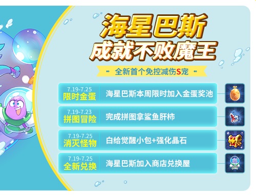 夏天和暑假怎么少的了沙滩和海水,《野蛮人大作战》全新首个免控减伤S级宠物【海星巴斯】破水而来!本周限时首发海星巴斯,在减免伤害的同时,还能够免疫控制,助你成就打不败的魔王!那么如何轻松获得海星巴斯?看过来,活动攻略带你飞! 【宠物召唤抽金蛋】 在活动时间内,金蛋系统奖励加入海星巴斯,玩家可以使用唤宠玉石抽取新宠物,十次召唤至少获得1只A级宠物,并且有概率获得一只S级宠物,新活动助力金蛋活动记得别忘了参加呦~ 活动时间:7月19日——7月25日 【商城兑换海星碎片】 在商城的兑换屋隐藏着新宠的兑换方式,仅在本周限时兑换。玩家可以使用草原硬通货【鲨王肝柿】的碎片,用来兑换新宠物海星巴斯。 活动时间:7月19日——7月25日 【拼图活动】 鲨币碎片不足不用担心,全新拼图活动完成全部活动,还可以获得一整只完整的鲨鱼碎片。 活动时间:7月19日——7月23日 【消灭冒险岛怪物】 冒险岛模式作为新版本十分热门的游戏玩法,进入冒险岛累计消灭怪物,即可领取丰厚奖励,觉醒小包+强化晶石拿到爆! 活动时间:7月19日——7月25日 全新首个免控减伤S级宠物【海星巴斯】正在向你招手!精彩活动一定不要错过哦~更多精彩内容请关注官方微信公众号:野蛮人大作战 【关于《野蛮人大作战》】 《野蛮人大作战》是一款将创造与战斗合二为一的奇妙游戏!所有元素,任你调配,战斗沙盒更有趣!技能随机、场景随机、每场都是新开局!你可以一秒开团实力战,也可以发散思维创世界,还有花样萌宠陪你挂机,奇妙剧情等你收集,多种玩法随你换!想要最强战斗力,还想提升创造力?嘿,快来这里,跟全世界的野蛮人一起! 官方Q群:424434850 微信公众号:野蛮人大作战 |