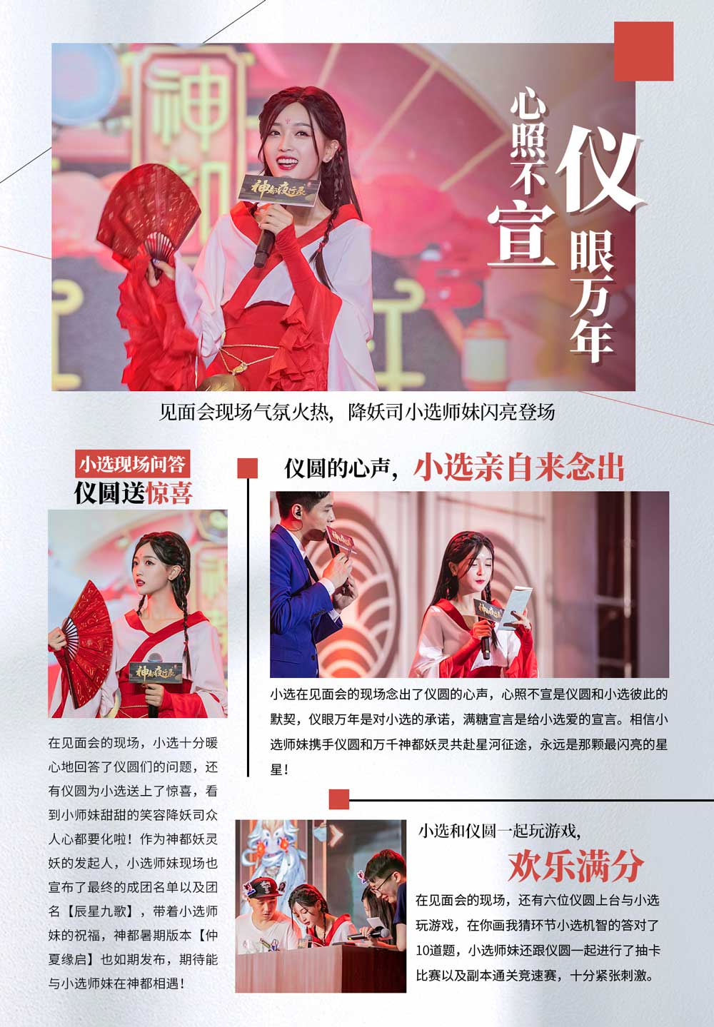 经过数月的激烈选拔和角逐,由降妖司小师妹吴宣仪发起的“神都妖灵妖”虚拟偶像出道选拔大赛完美落幕,7月18日的“神都妖灵妖”成团见面会上,六位优胜妖灵在小选的宣布下正式成团“辰星九歌”出道,并带来了精彩的表演。 见面会中,小选还与仪圆们欢乐互动,尽显可爱俏皮的一面,正式发布的《神都夜行录》暑期班本“仲夏缘启”也赢得了阵阵欢呼。 惊艳登场,互动欢乐多 热衷于降妖卫道的小选在《神都夜行录》中频频现身,引发了寻找“神都宣仪”的热潮。而在7月18日的见面会上,小选更是以降妖司小师妹的古典形象亮相,一袭红装印衬下的甜美与优雅俘获了所有到场观众,“心照不宣,仪眼万年”的口号响彻会场,倍显温馨和热闹。 在接下来的互动环节中,小选暖心地回答了仪圆们的问题,并与《神都夜行录》策划分别与三位幸运粉丝组成队伍进行PK,三局挑战中,小选都表现优异展现了她对《神都夜行录》的了解和不俗的技巧。仪圆们为小选送上的惊喜礼物——北卡蓝灯海也令她泛起了甜美的笑容,两封饱含仪圆真挚喜爱和美好祝愿的信,将见面会的温情氛围推上了高潮。坦诚机智的问答,激烈趣味的挑战,精心准备的惊喜,小选与仪圆们的羁绊,因《神都夜行录》而更加紧密、牢固。 辰星九歌,六妖终成团 本次成团见面会上,六位成功入选的妖灵也是当之无愧的主角,在小选的介绍下,男子组的大司命、应龙、司羿,女子组的少司命、山鬼、阿织相继登台亮相,带来了精美绝伦的走秀表演。 随后,小选还正式公布了神都妖灵妖虚拟偶像团的团名“辰星九歌”,星辰的浪漫神秘与九歌的高阔辽远融于一体,恰到好处地体现了以大司命和少司命领衔的神都妖灵妖天团的实力与魅力。 仲夏缘启,相约降妖司 与“辰星九歌”一同正式登场的,还有《神都夜行录》精心为玩家们准备的暑期版本“仲夏缘启”,与《白蛇:缘起》联动的“缘起千年梦浮生”活动率先开启,全新SSR妖灵“白娘子”携SR妖灵“小青”绝美亮相,当古老的神话传说,唯美的国漫经典与神秘的妖灵世界相遇,必将为玩家们带来新奇而趣味的游戏体验。 联动皮肤“白蛇:缘起”,全新玩法全服Boss及更多暑期版本内容也将陆续登场,伴你欢度暑假。小选也将继续奋战在神都世界,以智慧、勇气和实力捍卫和平,击溃邪魔!你是否会依约来到降妖司,与她并肩作战? “辰星九歌”妖灵天团正式出道,暑期版本“仲夏缘启”如期发布,小选仪圆欢度美好互动时光,本期小选周刊精彩内容为你奉上,登录《神都夜行录》畅享更多欢乐! 【神都夜行录】 国韵之美,归于盛唐。网易新概念妖灵手游《神都夜行录》是一款国风妖怪收集RPG手游!在游戏中,你可以奇遇万千妖灵,体验绝美百妖剧情!盛世大唐,国韵美学,让你亲历神都风志!每有妖物作乱之日,便是降妖师现身之时,让我们一起走进国风妖怪的世界! 《神都夜行录》官网:http://sd.163.com/ 《神都夜行录》微信公众号:神都夜行录 《神都夜行录》官方微博:神都夜行录 《神都夜行录》官方抖音号:神都夜行录降妖司 《神都夜行录》官方贴吧:神都夜行录 《神都夜行录》网易大神:神都夜行录 |
