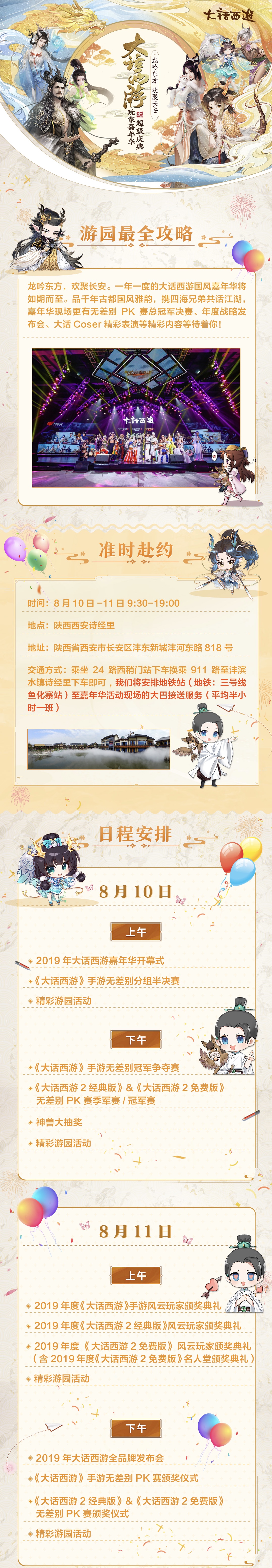 四海宾客齐云集,长安共聚品国风。《大话西游》手游玩家们期盼已久的2019大话西游玩家嘉年华之超级庆典即将盛大开启!8月10日-8月11日,大话将携最精彩的活动内容和游戏爆料,在西安诗经里景区(陕西省西安市长安区沣东新城沣河东路818号)等待五湖四海的好兄弟们齐聚一堂,共话西游! 届时,活动现场将有全天候的精彩游园等待大家参与,更有无差别PK赛全国冠军总决赛燃情开打,大话策划面对面、风云玩家颁奖典礼、《大话西游》全品牌发布会等精彩活动同期举行!不仅如此,活动现场还将进行神兽大抽奖,参与嘉年华即有机会得神兽!海量活动福利,丰富大话周边,快来西安体验这夏日里最激动人心的国风狂欢嘉年华吧! 为了帮助大家更好的体验嘉年华的全部惊喜内容,大话特别为大家整理了一份2019嘉年华最强攻略,快来看看都有什么精彩内容! 龙吟东方,欢聚长安。8月10日,大话西游玩家嘉年华之超级盛典将在古都西安诗经里(地址:陕西省西安市沣东新城沣河东路818号)燃情开幕,大话诚邀四海玩家们前来共襄盛举,共品古都国风,畅玩游园盛会,更有丰富表演、神秘爆料、精彩赛事、海量好礼、豪华抽奖……更多惊喜,敬请期待!更多游戏、赛事信息,请关注《大话西游》手游官网、官方论坛、官方大神。 |