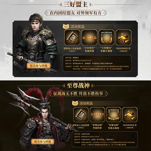 群雄逐鹿的三国乱世,涌现了许多英雄豪杰与才子佳人的故事。近期,在腾讯游戏独代、星辉游戏自研的正版授权三国战争策略手游《三国群英传-霸王之业》中,游戏大神评选活动已经拉开序幕,为各位主公提供了一个展示才华、美貌与实力的舞台。即日起至9月15日,各个奖项的报名将持续进行,官方更是准备了重磅活动奖励来为主公们加冕封神。期待大家踊跃参与,一展闪亮风采! 马上报名>> https://bwzy.qq.com/cp/a20190521versatile/index_p.html 【多种奖项,多样精彩】 为了让在各个不同方面拥有实力或特长的主公都能参与到活动中来,本次游戏大神评选共设置了五个奖项。无论主公是创作才华滔滔不绝的“四方才子”,才貌双绝的“绝代佳人”,用声音征服全服的“五星主播”,还是团结盟友、领军有方的“三好盟主”,亦或是战无不胜、所向披靡的“至尊战神”,都能在这里秀出你的精彩! 【人气比拼,实力对决】 想在游戏大神评选中拔得头筹,首先要展示的便是才华和实力。参评“四方才子”的主公需要提交原创游戏攻略、玩家故事等原创内容作品;参评“绝代佳人”的主公需要提交唱歌、跳舞、弹琴等才艺表演作品;参评“三好盟主”的主公可提交体现外交、发展联盟、作战指挥能力的事迹材料;参评“至尊战神”的主公则选定参评角色一键报名,凭借歼敌数量与其他报名主公一决高下。除了拥有强大的实力,本次活动还要比拼各位主公的号召力。除报名“至尊战神”的主公外,其他奖项报名成功的主公可以邀请自己的盟友和伙伴来为自己或自己的作品点赞,点赞数排名前6的主公即可赢取本次活动的丰厚奖励哦! 【重磅奖励,独一无二】 本次活动的重磅奖励包含了实物奖品和游戏资源。排名前6的玩家即可获得本人定制古装金牌纪念奖品、对应奖项专属头像框和价值6666元的游戏礼包奖励,问鼎榜首的主公除了上述奖励外,还可赢取对应奖项的专属称谓。如此丰厚且独一无二的奖励,想要获得的主公快来踊跃报名吧! 以上就是本次游戏大神评选活动的全部内容,丰厚的实物及游戏资源奖励、独特的专属头像框和专属称号都在等着为各位才华横溢、实力强大的主公加冕封神!活动报名正在火热进行中,各位主公千万不要错过哦!更多精彩内容,敬请持续关注《三国群英传-霸王之业》! 【关于《三国群英传-霸王之业》】 《三国群英传-霸王之业》是一款由腾讯游戏独代,星辉游戏研发的正版授权的三国战争策略手游,采用三国题材,辅以写实风格;玩家可通过内城建设、招兵买马提升实力,打造属于自己的军队,演绎一方诸侯的崛起之路。游戏以写实的美术表现,立体全面的策略维度,丰富的沙盘模拟经营方式,特色的武将派遣玩法,带给玩家真实的三国主公体验。 【了解更多《三国群英传-霸王之业》最新消息,请关注】 官网:http://bwzy.qq.com/ 官方微博:@三国群英传-霸王之业 官方微信号:tt_bwzy 官方Q群: 玩家1群:437222774 玩家2群:546947750 玩家3群:436103351 玩家4群:556774362 玩家5群:598487499 官方微信二维码: |