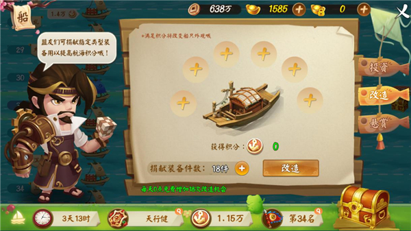三国航海赛是全新的竞技玩法,开启时间按周期性运转,达到指定时间后将会开启活动,活动持续4~7天,活动以联盟为单位,联盟成员达到30级以上则可以参与活动。三国航海赛玩法中可通过【投资】【改造】【悬赏】三个玩法任务来获取小船积分,达到指定的积分还能获得丰厚的宝箱奖励。在三国航海战中还会遇到其它特殊事件,在此模式中,团队的力量显得无比重要,每一位玩家都是救世主!