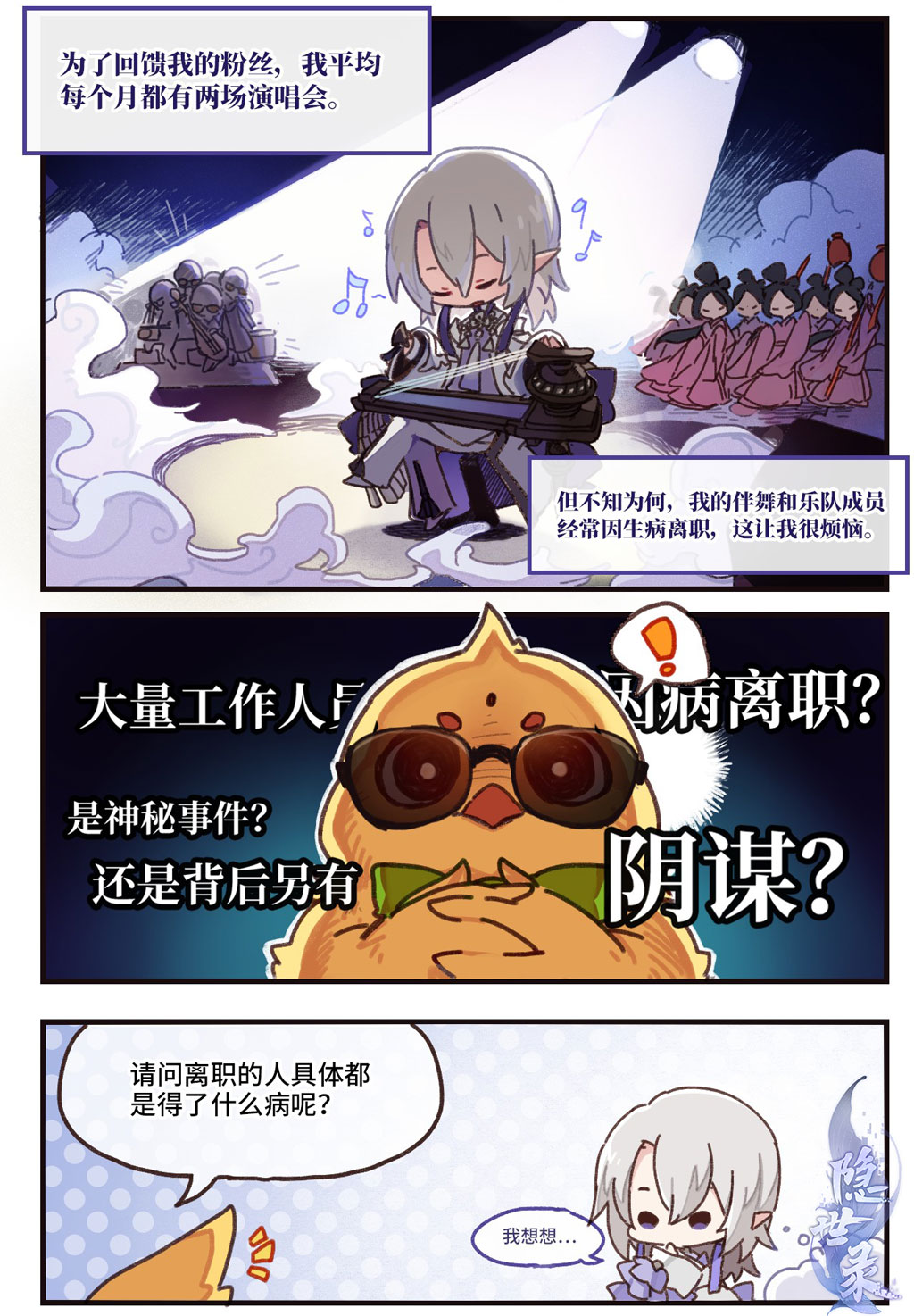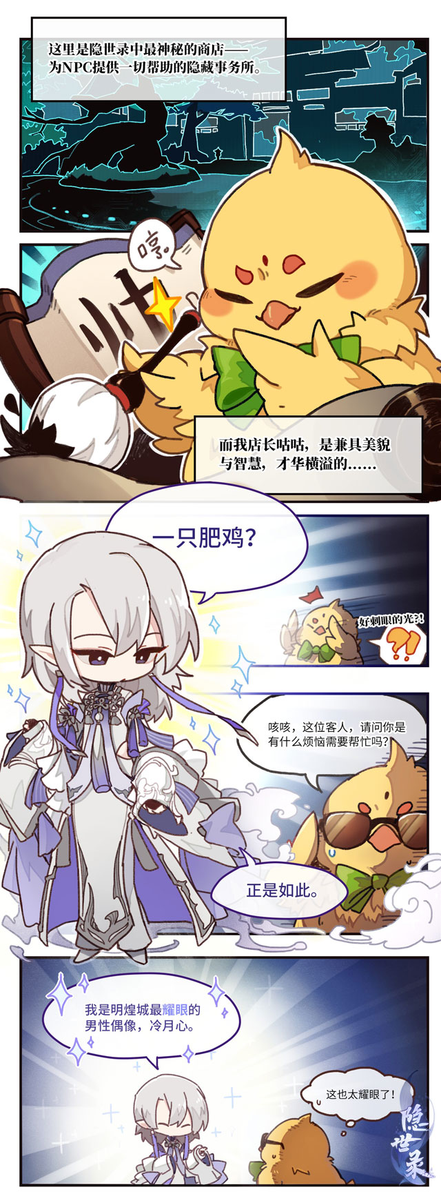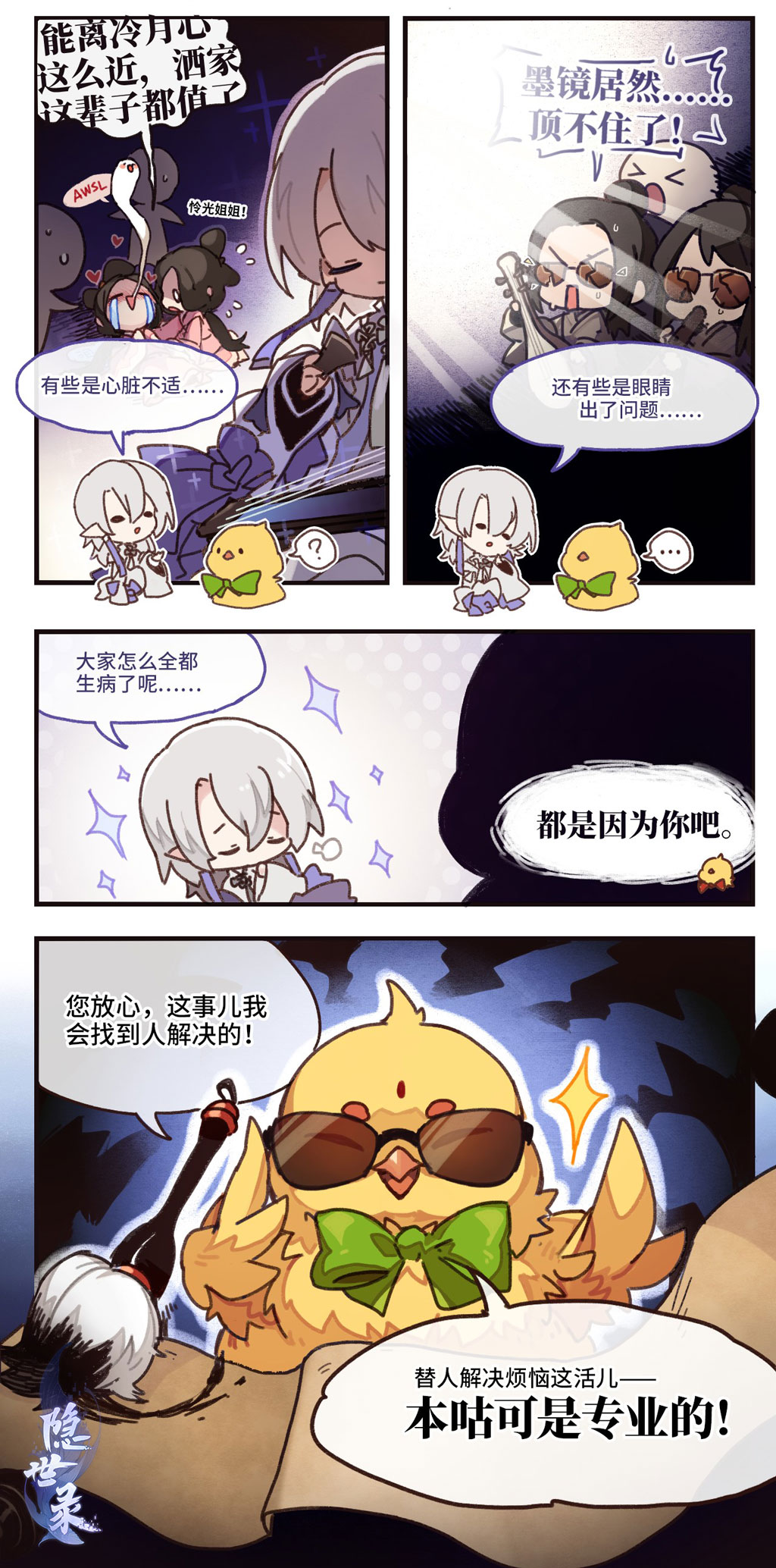 “虚假与真实“相遇,”“毁灭与重生”交错,穿越躁动的代码乱流,到达隐世表面最为安宁又繁华的明煌城……在网易首款BUG手游《隐世录》(隐世录官网:https://ysl.163.com/)这个核心主城里,玩家所耳闻过的最响亮的名字,莫过于魅香楼的头号巨星,隐世的超人气爱豆——冷月心。 冷月心表面上是唱作俱佳的偶像万人迷,因为“BUG”的干扰觉醒后却又展现着更多不为人知的一面……这样的他,最近烦恼着的却是…… 无法停止释放魅力的冷月心,面对纷纷“病倒”的同伴究竟要如何是好?号称能解决各类男体的事务所负责鸡——咕咕,又会怎样解决这个难题?欲知后事如何,可进入《隐世录》官网(https://ysl.163.com),或关注官方微博@隐世录手游,关注官方微信“隐世录手游”(yslsy163),系列隐世小剧场持续更新,更多福利情报将会陆续解禁! |