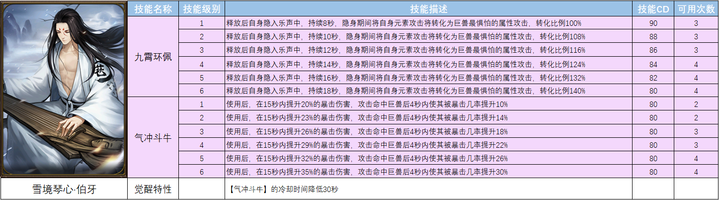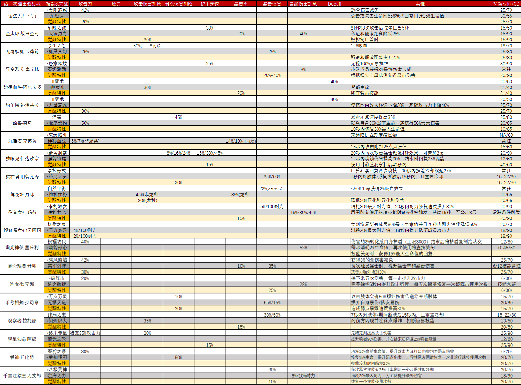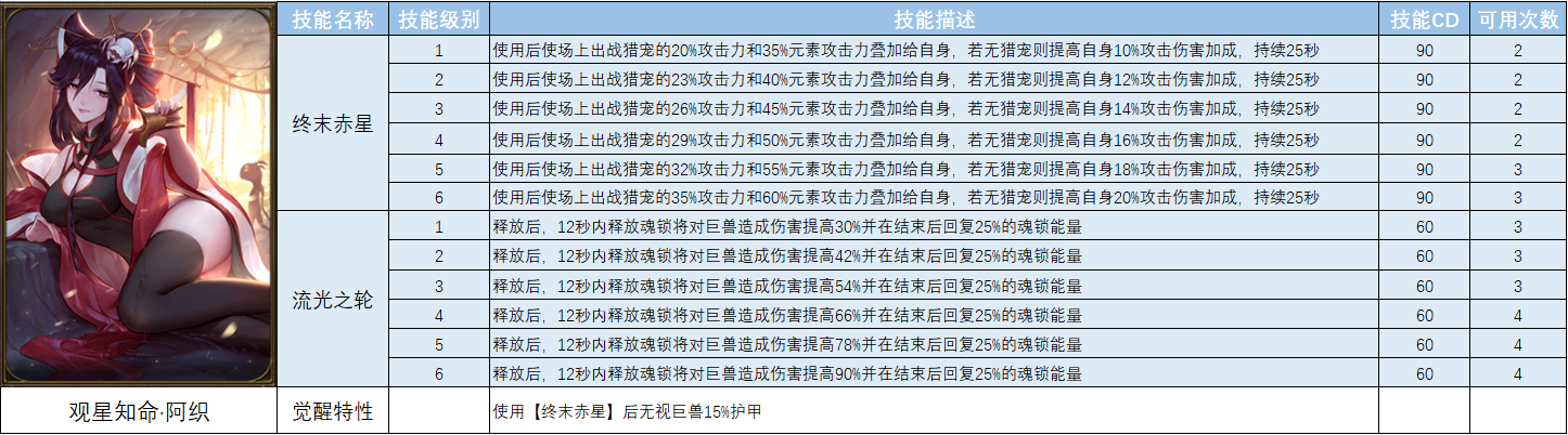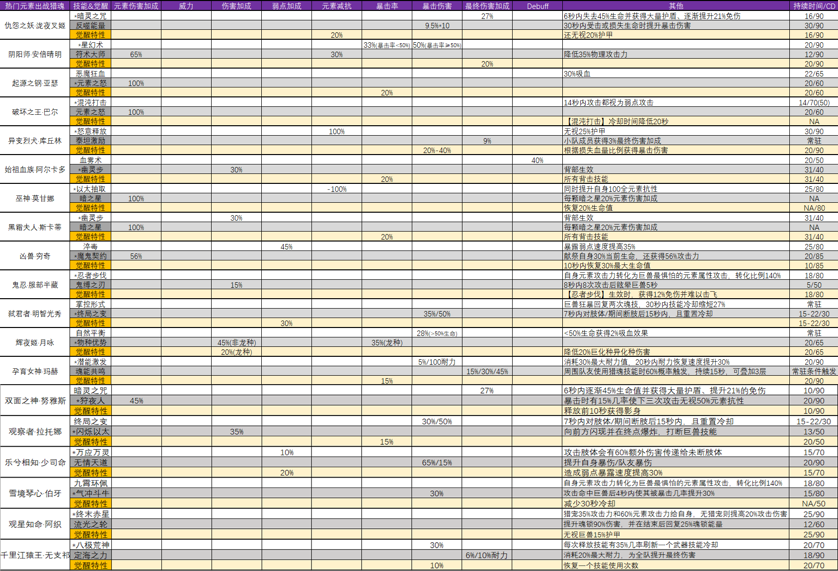 夜行妖魂,《猎魂觉醒》X《神都夜行录》联动活动开启!“世间妖怪,皆有温度”《神都夜行录》联动第一弹时间为2019年8月22日维护后至2019年9月5日6时。联动猎魂副本开启,探究来自东方的神秘猎魂! 本次第一弹新猎魂为昆仑瑞兽·开明(圣光系),雪境琴心·伯牙(黑暗系),观星知命·阿织(秘术系),乐兮相知·少司命(泰坦系),千里江猿王·无支祁(自然系)。出战方面,神都第一弹猎魂出战技能有部分引用讨鬼传猎魂技能,同时也有功能性更强,且设定得较为强大的魂技,值得拥有;配装方面,神都第一弹猎魂出现了各种主流特技的镶嵌猎魂,玩家在配装时有更多的选择,同时也丰富了猎魂圣契系统。今天我们就来听听官方课代表给大家总结的猎魂攻略吧! 1. 出战分析 昆仑瑞兽·开明 昆仑瑞兽·开明 是一个输出平稳且增益幅度较高的物理出战猎魂。 【乘风踏焰】带来最高达42%的攻击力提升和8%的全伤害减免;【禁军列阵】常驻在暴击时增加暴击率和暴击伤害;五星觉醒特性是使用【乘风踏焰】时攻击力额外增加30%,这样一共增加了72%的攻击力,非常强大。在提升伤害的同时补足了双暴,而且技能覆盖率很广,输出平滑,是个物理玩家值得入手的出战猎魂。 乐兮相知·少司命 乐兮相知·少司命彰显了泰坦系的狂暴的特性,是一个将点状攻击变成面状,同时又增加自身和全队输出能力的通用型猎魂。伤害增幅主要为传递的那60%伤害,暴击伤害和弱点伤害增幅也是相当可观。并且该猎魂是目前少数可以变相增加副武器灵刃输出的猎魂。 【万物万灵】是猎魂觉醒目前第一个尝试将肢体伤害部分传递到其他肢体的技能,使用后一定时间内攻击巨兽肢体效果为同时攻击多个肢体,打击弱点时造成的伤害皆为弱点伤害,并且使用副武器攻击时该技能同样生效;【无情天道】使用后增加大量的暴击伤害并且增加队友15%暴伤,给自己提升输出的同时增强全队的输出能力;五星觉醒特性更是增加了对弱点肢体的伤害,进一步提高输出能力。技能覆盖情况复合泰坦系一贯的特点,分别为15/70和20/90,技能覆盖率较低。 雪境琴心·伯牙 雪境琴心·伯牙依旧遵循了黑暗系元素向的风格,技能类似讨鬼传猎魂服部半藏,转化元素伤害使单元素在面对多BOSS情况下更得心应手。未获得服部半藏的玩家可以考虑入手一个。 【九霄环佩】在隐身的同时将自身元素攻击力转化为巨兽最惧怕的属性攻击,在面对元素被克制的情况下能发挥神效;【气冲斗牛】则提供了大量的暴击伤害增加,技能期间集中巨兽使其被暴击几率提升,变相的提升了全队的暴击率,增加了全队的输出能力。五星觉醒特性减少【气冲斗牛】的冷却时间,进一步增加了技能覆盖率。伯牙相对于半藏更注重团队的输出。技能覆盖情况为18/80-90和15/80,覆盖率也较低。 观星知命·阿织 观星知命·阿织继承了秘术系往日“奇技淫巧之风”,在战斗中的增幅与出战猎宠密切相关。爱养猎宠的玩家可以考虑入手一个~ 【终末赤星】继承出战猎宠的部分攻击力和元素攻击力,未出战猎宠则增加攻击伤害,具体数值随出战猎宠的属性来决定;【流光之轮】提升大量魂锁伤害,在拉完魂锁之后恢复25%的魂锁能量,更方便玩家利用魂锁进行破位。五星觉醒特性是使用【终末赤星】后无视巨兽15%护甲。技能覆盖情况为25/90和12/60,覆盖率一般。 千里江猿王·无支祁 千里江猿王·无支祁保留了自然系独特的刷新技能冷却效果,和出云一样利用耐力值增幅伤害。 【八极荒神】又是一个可以刷新技能的魂技,在刷新技能的同时可以增加额外的暴击伤害;【定海之力】消耗20%耐力值使用,并且在持续范围内剩余耐力值决定攻击伤害的加成。技能释放后全队玩家都可以增益,是个通用性很强的魂技。五星觉醒特性是使用【八极荒神】后恢复一个魂技的使用次数,并且获得10%的暴击伤害加成,提供伤害的同时保证了技能使用率。技能覆盖情况为20/70和18/90,覆盖率较低。 与以往强势热门出战猎魂对比: 【物理】 物理出战百花齐放,四强为出云阿国、潘朵拉、穷奇和少司命,明智光秀和拉托娜适合能够连续破肢体的情况,吸血鬼和克苏鲁通用性很好并且兼顾功能性(隐身/控制),无支祁加成团队作战,月咏玛赫和开明常驻特技稳定生效适合鏖战局。 【元素】 元素出战异彩纷呈,爆发型为少司命、穷奇、亚瑟、猎犬,穷奇爆发最强,亚瑟持续稍好总伤较高,少司命总伤最高,猎犬爆发高且比少司命、亚瑟和穷奇持续时间长,持续型为黑霜夫人、莫甘娜、库丘林、安培晴明、月咏和玛赫,其中黑霜夫人最为实用,莫甘娜和库丘林、安培晴明分别适合低元素星等和高元素星等的情况,安倍晴明适合暴击率低于50%且高爆伤的情况,月咏和玛赫同物理的结论。值得一提的是服部半藏和伯牙,非常适合竞速多boss抗性不同场景。 2. 配装分析 【新猎魂特技】 此次登场的五个联动猎魂的特技也是相当出色,值得一提的是少司命的主强攻,副穿透镶嵌特技,物理玩家终于可以除祝融亚瑟外多一种更好的强攻镶嵌主魂选择!此外,猎魂开明镶嵌增加独行和重创特技,为需要重创特技的玩家提供了更多选择;伯牙的心得和娴熟特技似乎更适合元素武器镶嵌,不过新套装黯骨套可能堆娴熟会溢出;阿织镶嵌提供热血和进退,似乎也更方便物理玩家堆增伤特技;无支祁镶嵌提升精准和锐利,同时附带两种加暴击率的特技,属性
