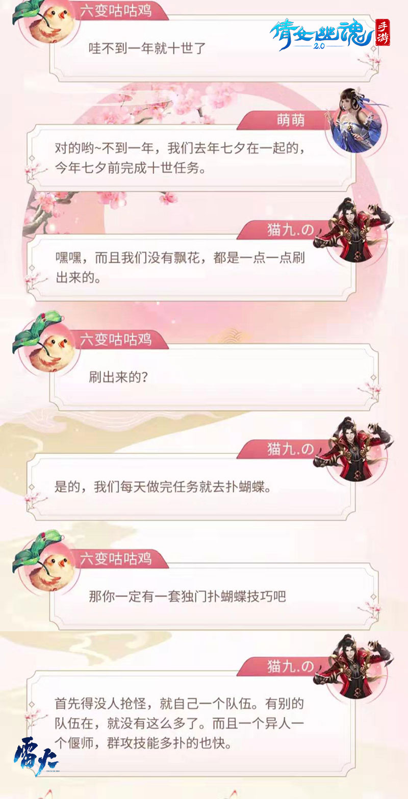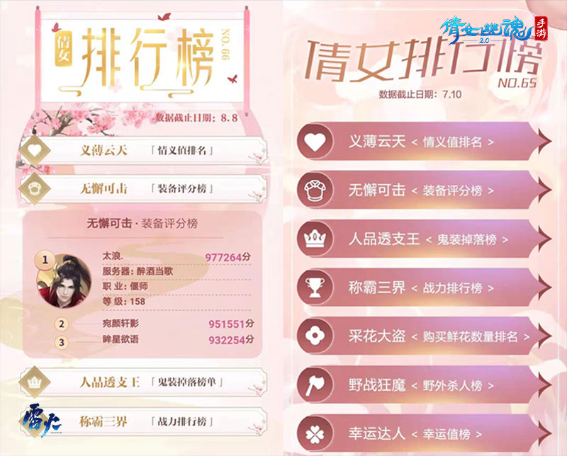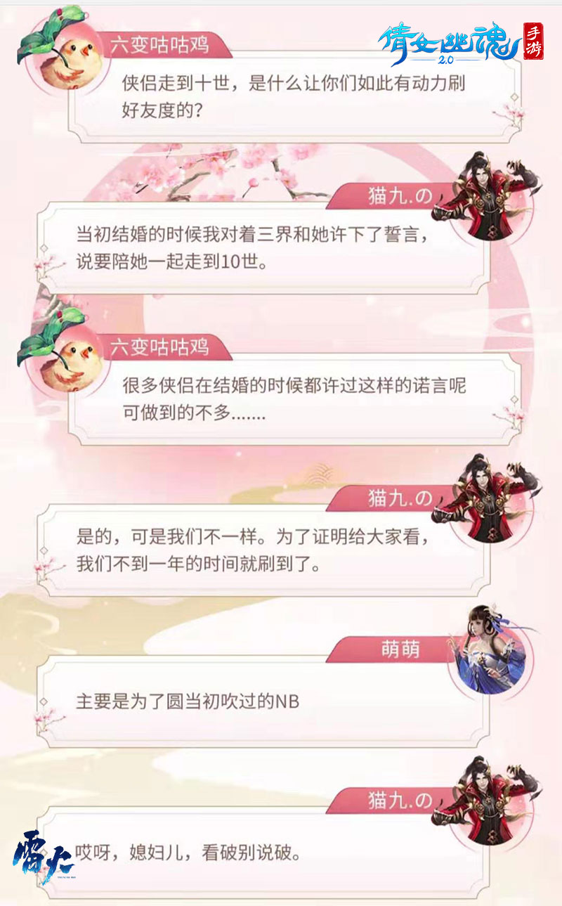 山无陵,江水为竭。冬雷震震,夏雨雪。天地合,乃敢与君绝。两情长久,不离不弃。死生契阔,与子成说。无数侠侣在倩女手游中走到一起,不离不弃,随后便有动人故事流传开来。而本期倩女手游膜拜榜就会讲述一对侠侣在一年之内刷出十世称号的故事。 【侠侣十世相濡以沫,情意绵绵相依相伴】 侠侣新婚,常许海誓山盟:十世相濡以沫,长久不分离。但380万亲密度要求如同高山,难以征服。【猫九.の】与【萌萌】这对侠侣征服这座高山只需一年,没有高调飘花,只是简单的每日陪伴,忙里抽闲上线看看,对方在线便一起去扑蝴蝶,无需特意追求,只是多陪一会彼此,不知不觉,友好度就够了。 【每日坚持同心协力,点滴积累达成成就】 十世相濡以沫,相依相伴便足够。【萌萌】与【猫九.の】这对侠侣证明了这一点,他们为自己做了一个统计,每日坚持扑蝴蝶可增加友好度2.5万,一个礼拜则可增加11~12万,一个月则是40~45万。这么看来不到一年便可达到380万亲密度了。不过约25只蝴蝶可提升一点友好度,有如此诚心何事不成?【萌萌】也为想达成十世的侠侣们提了自己的建议:为对方送上【以爱之名】才是最快的选择。 【全新榜单盛大来袭,更多精彩尽在膜拜】 在本期膜拜榜中,装备评分榜和战力排行榜榜首为来自【醉酒当歌】服务器的玩家【太浪.】,两项评分分别达到了977264和1976691。而来自【雪中情】服务器的玩家【莫离づ涟漪】则以236件鬼装掉落成为本期人品透支王。本期膜拜榜中壕无人性榜首为来自【神雕侠侣】服务器的【眸星欲语】,送出红包总数为8492167800银两。另还有来自【雪中情】服务器的玩家【憶丶思哖】以1189476积分稳坐关宁积分榜榜首。其他更多精彩排行,尽在本期膜拜榜! 【关于《倩女幽魂》手游】 国民手游《倩女幽魂》是《新倩女幽魂》端游的官方手游,拥有端游级唯美画风与人设,传承经典玩法!魔气弥漫,世界事件卷土重来。次世代更新来袭,角色华丽新生!剧情全面迭代,场景3D升级,倩女幽魂手游2.0时代开启全新纪元! 《倩女幽魂》手游官方网站:https://qnm.163.com/ 《倩女幽魂》手游官方微博:@倩女幽魂手游 《倩女幽魂》手游官方微信:网易倩女幽魂手游 《倩女幽魂》手游官方贴吧:倩女幽魂手游吧 《倩女幽魂》手游Facebook:@qnyhshouyou 《倩女幽魂》手游助手App:https://yxzs.163.com/qnm/ 《倩女幽魂》手游网易大神:倩女幽魂手游菌 |
