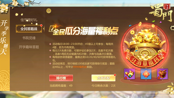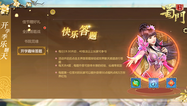 短裙衬衫青春洋溢,校园内欢声笑语,洛天依邀请诸位来《蜀门手游》畅享开学季活动,缤纷活动更有重磅好礼等你来领!活动期间登录就送开学季头像框和玄灵清丹;书院觅缘,于世外桃源之境开启一场对决冒险,这是一场默契与配合的比拼;答题竞赛,瓜分福利点更有红包相送;“依食记”同人作品大赛,清音灵狐全新造型值得用爱发电! 【书院觅缘 奇遇之旅】 钟灵毓秀之地,山川秀美水天相接,一座宁静书院坐落其中,书院中散落着竹简书籍,一派寂然宁静。 此次书院觅缘活动就在这方宝地开展,一场比赛会有四队人马进行较量,各位蜀友可两人组队,乘坐坐骑捡拾地上的书卷,一人负责掌控坐骑的方向,而另一人则负责释放技能,对敌人造成一定的干扰或者对自身进行一定的增益,比如禁锢住敌人,比如一瞬间吸收大范围内的竹简,不同的坐骑技能不尽相同,拥有一只强效增益的坐骑可以说是力挽狂澜扭转战局的一大法宝,当然如果没有双人坐骑,玩家也可以选择游戏里提供的夜空蝶或龙王剑。 书院觅缘活动的奖励也是非常丰厚,获胜方可以获得200万经验,500万灵力,神品仙灵丹*2,而输了的一方也有奖励,可以获得100万经验,200万灵力,外加天品仙灵丹*2,不论胜负皆有奖励! 【答题比拼 好礼相送】 学然后知不足,开学季答题活动当然是必不可缺的,答题活动仍是不以成败论英雄,无论是答错还是答对,都会有奖励送上! 此次答题活动分为两个阶段,第一个阶段的世界答题活动,玩家回答正确将会获得50万经验和100点仙魂,回答错误的玩家将获得20万经验和50点仙魂,另外全服第一位答对的玩家将额外获得5万元的世界红包与福利点! 第二阶段的全民答题活动更为看重各位玩家的手速,在紧张激烈之时也要继续保持冷静,另外悄悄透露一下,这次的题库会增加仙侣相关的题目,重点已经划出,就等你来!答题中胜利一方将获得的100万灵力和仙魂100点,失败一方也有奖励,50万灵力和仙魂20点给你,平局的话双方都能获得75万灵力和50点仙魂! 活动结束后,排名前100的玩家可获得永久称号【超级学霸】(属性+100攻击力),累计星数达到40的玩家,可参与瓜分9990福利点。排名第一的玩家可获得红玫瑰礼盒、仙魂1000点、绑银10万,排名在第二到十名的玩家可以获得仙魂300点、绑银五万!奖励丰厚,等你来拿! 【同人大赛 作品纷呈】 以蜀地美食为主题的“依食记”大赛正在如火如荼进行中,清音灵狐的造型深受大家喜爱,玩家参与的热情度只增不减,各式各样的同人作品层出不穷,下面就来欣赏一下各位大神的精彩作品吧! 麻婆豆腐在手,四川美食我有!感谢玩家渺纱飘雪带来的这张洛天依,捧着麻婆豆腐的天依开心得尾巴都要翘起来了!一旁的音之精灵已经忍不住偷偷吃一口啦,美味到眯眼睛,前路还有更多四川美食在等待着天依。 玩家教育日报为我们带来了Q版洛天依,楚楚动人的大眼睛让人想给她再买几笼小笼包,所有的爱都给你! 另外还有玩家Ray时光带来的超级棒的MMD,花瓣飘扬中天依的舞姿柔软不失力量,动感十足的节奏让观者也忍不住也跟天依跳了起来,随着身姿的舞动,天依身后的尾巴也随之摆动,毛茸茸的乖巧样子招人喜爱。 新学期有奇遇,牵手天依重返校园,让校园里的欢声笑语打破夏末的闷热,让少年人的懵懂情愫涌上心头,书院觅缘同伙伴开启一段精彩旅程,全民答题赢取丰厚福利,更多精彩活动请关注《蜀门手游》官网最新资讯。 ★ 蜀门手游 国民级热血仙侠手游 ★ 蜀门手游 官方QQ群:390520367 ★ 蜀门手游 百度贴吧:蜀门手游吧 ★ 蜀门手游 官方微信公众号:shumensy_2016 ★ 蜀门手游 官网:http://www.shumensy.com/ ★ 蜀门手游 官方社区APP下载http://www.shumensy.com/download/forum |