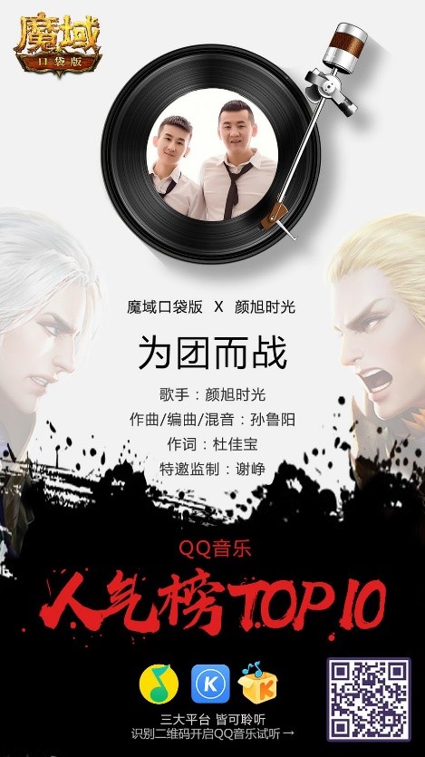 战火熊熊亚特大陆,雄心不灭魔域勇士。8月29日,《魔域口袋版》全新资料片“神域争霸”正式公测,史诗级的“军团攻城战”大幕掀开!而随着全新资料片发布,《魔域口袋版》更为玩家打造了一首资料片战歌——《为团而战》,蓬勃而出的铿锵男声,电吉他与贝司交缠的金属音质,众神时代,以战之名,呼唤百万勇士涉足神域,封神留名! 热血传唱 为团而战不改兄弟战魂 本次“神域争霸”资料片推出的全新战歌《为团而战》是由新锐音乐组合“颜旭时光”以及知名音乐制作人谢峥联合打造。“颜旭时光”作为快手平台热门主播,从街边弹唱到走红网络,从默默无闻到拥有近百万粉丝拥趸,始终坚持的一件事,便是对音乐的执着专注。此次《魔域口袋版》与其合作推出《为团而战》曲目,正是期望通过“颜旭时光”的独特经历和丰富声线,用歌词描绘一场场属于兄弟的情义故事、用旋律续写亚特大陆的战友狂歌!除了“颜旭时光”首度献声游戏外,曾为歌手高进、演员小沈阳制作过热门音乐《我的好兄弟》的制作人谢峥也倾情加盟负责歌曲监制,更是保证了《为团而战》这首战歌在音乐层面的专业水准。 上周五,歌曲已在QQ音乐、酷我音乐、酷狗音乐等音乐平台上线,一经上线更是成功挤入QQ音乐巅峰人气榜TOP10,见证属于魔域口袋版玩家的热情心声! 铁血兄弟 战场热曲呼唤百万雄师 游戏内,兄弟们浴血共书赤胆忠魂;游戏外,一曲《为团而战》写尽意气勃发。在《魔域口袋版》之中,紧张刺激的军团战是玩家释放激情挥洒热血的绝佳舞台,也因此游戏中的每个军团,都成为了孕育玩家关系的社交纽带。军团玩家之间的情感共鸣,因为共同进退的境遇与毫无保留的信任,提升到了新的高度。“凡人封神名留神纪,一声兄弟一生不离”,歌词之中不仅有让魔域口袋版玩家倍感熟悉与温暖的字眼,更是通过“兄弟不离”传递着玩家们真挚的军团兄弟情谊,激励更多源于平凡的玩家在军团赛事战火中“名留神纪”,构筑属于自己的荣耀丰碑! 跨服军团攻城战赛事已经打响,为团而战的传奇人生等你开启!属于你的人生传奇即将开始。战意缭绕,战歌嘹亮,一曲《为团而战》只为英雄而鸣响。身为《魔域口袋版》一份子,团队载誉之时,你还在犹豫什么? 不如洗尽耳朵,一闻滚烫战歌,邀约同仁,加入战团,决战天下。 跨服军团攻城战赛事已经打响,为团而战的传奇人生等你开启!现在拿起安卓手机登录《魔域口袋版》官方网站http://mykd.99.com/ 即可下载游戏,苹果用户在AppStore上搜索“魔域口袋版”也可下载。一闻滚烫战歌,邀约同仁,加入战团,速速决战天下! 【关于魔域口袋版】 《魔域口袋版》是以经典魔幻网游《魔域》为蓝本,以热血群殴为主题的手机网游,一人多宠、XP神技等核心玩法完美重现,精灵游侠等八大职业重新平衡,法系幻兽完美合体!火爆军团战场、逆天BOSS挑战无处不在! |