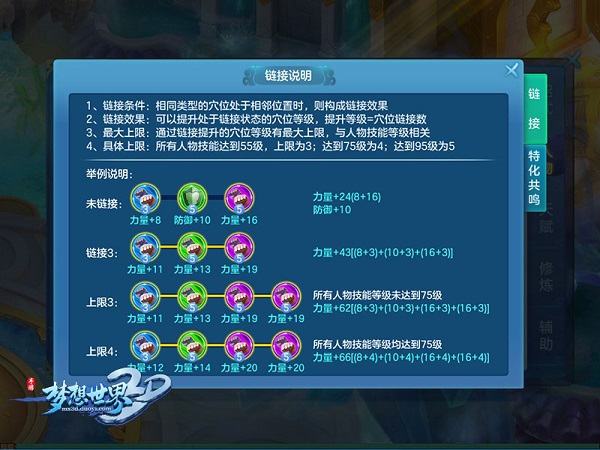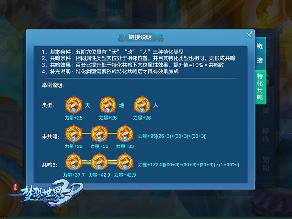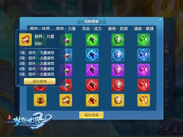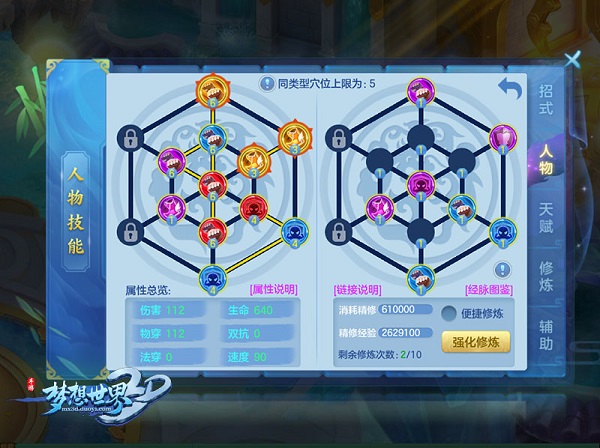 《梦想世界3D》二周年庆全新内容“九霄盛典”今日上线。飞云之上,遨游九霄,全新地图凌霄城震撼上线。噬星魔龙霸气登场,武极天下全服对决,还有周年时装张扬个性!轻松挑战强力Boss,不再为天魔令烦恼。 奇经八脉 淬炼气血 医书记载,任督二脉原属奇经八脉,因具有明确穴位,医家将其与十二正经脉合称十四正经脉。任脉主血,为阴脉之海;督脉主气,为阳脉之海。任督二脉已通,修炼经脉的法门开启。修炼经脉是快速提升武学修为,精进武艺的必经之路。淬炼经脉,打通穴位,快速增强伤害、生命、双穿、双抗、速度等属性值。 百会涌泉 穴位精修 所有人物技能等级在达到55级后可以获得经脉修炼-开启任务,完成任务将开启经脉系统,可在技能界面-人物技能分页进入。达到75级可以获得经脉修炼-强化任务,完成任务将开启经脉强化修炼,可以修炼获得更高阶的经脉。另外,所有人物技能等级达到65级起,人物技能每提升10级,将获得经脉解锁任务,完成任务可解锁对应经脉格(现有玩家依据人物等级,自动解锁)。消耗经脉精修经验,可以进行经脉修炼,获得经脉属性(消耗经脉精修卷宗可以免费修炼1次)。获得人物经验时,将获得等量的经脉精修经验(不计算人物储备经验量加成,同时使用人物经验心得不会增加经脉精修经验)。 特化共鸣 血脉链接 相同类型穴位处于相邻位置时,构成链接效果增强属性值,提升等级等于穴位连接数。穴位达到5阶之后,具有“天”、“地”、“人”三种特化属性,相同属性类型穴位处于相邻位置,并且其特化类型也相同,则形成共鸣,百分比提升处于特化共鸣下穴位属性效果,提升值为共鸣数*10%。 |