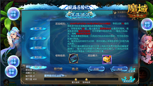 团战的热血气氛还未散去,未知的冒险正在潜伏,正当《魔域口袋版》神域争霸赛如火如荼的进行之时,在另一片未知海域里,玩家们为了寻找传说中海神岛海底埋藏着的海神宝藏,你将面临前所未有的严峻挑战,《魔域口袋版》海域探险活动全线升级,精彩福利不容错过。 鱼人财宝 海量奖励等你拿 神秘的深海隐藏着鱼人族世代守护的宝藏,玩家们想要到达深海获取宝藏,就必须穿越深海漩涡,而危机四伏的挑战就此开始。深海漩涡中魔化为海妖的鱼人将抵挡玩家夺取财宝的步伐,向鱼人族宣战。等级达到70级的玩家在9月3日-9月18日期间可向海妖鱼人发起挑战,海妖所处的巢穴共分为20层,巢穴等级越高栖息的海妖鱼人也将愈发强大,当然强大的海妖守护的宝藏也将越发丰富,你是否能成为实力派的完美证明,豪取所有奖励? 免费福利 豪取财宝显神通 在所有玩家们的愿望当中,首当其冲的自然是能免费获得豪华福利,享受剑刃飞舞,热血喷涌的爽快体验!想要掠夺鱼人的财宝,就必须进入深海旋涡,虽然每人每天只能免费进入一次,但《魔域口袋版》给与玩家们最直接的福利——所有玩家都可以免费获得额外的挑战机会,通过击失魂的鹿角兽、击杀旋涡海妖、前往海岛弹库摧毁泡泡雷、前往章鱼暗穴击碎暗黑之泡,即可免费获取进入深海旋涡的机会,豪取免费宝藏!多重获取方式带来最豪华奖励体验,唯有尽力挑战,方能在收获宝藏之时收获极致满足! 收获深海宝藏,豪取免费福利,伴随着热血团战的还有来自深海的福利,现在拿起安卓手机登录《魔域口袋版》官方网站http://mykd.99.com/ 即可下载游戏,苹果用户在AppStore上搜索“口袋魔域”也可下载游戏。现在就加入《魔域口袋版》,更多惊喜等着你!速速加入赢取福利吧~ 【关于魔域口袋版】 《魔域口袋版》是以经典魔幻网游《魔域》为蓝本,以热血群殴为主题的手机网游,一人多宠、XP神技等核心玩法完美重现,精灵游侠等八大职业重新平衡,法系幻兽完美合体!火爆军团战场、逆天BOSS挑战无处不在! |
