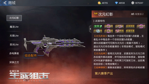 随着9月的到来,《生死狙击》手游第五赛季正式落下了帷幕,第六赛季已然开启!本次的更新内容除了新赛季外,还迎来了《生死狙击》手游最新的英雄级武器—次元幻影。那么,第六赛季给我们带来了哪些惊喜?全新的次元幻影又是一把怎样的武器呢?下面就一起来看一看吧。 第六赛季正式登场,全新等级奖励充满惊喜 在9月10日0点,《生死狙击》手游第六赛季正式开启!本次赛季将会持续近两个月时间,于11月5日24点将正式结束。既然新赛季开启,那么第五赛季的所有赛季数据也将全部重置,赛季的大体规则依然与第五赛季相同,不同点集中在赛季奖励中。 值得注意的是,在第六赛季中,只需要开启赛季贵族奖励即可直接领取一级奖励——最新英雄级武器次元幻影!该武器击杀玩家即可回复能量。随着玩家赛季等级的不断提升,玩家可以从赛季系统中领取海量的奖励,稀有武器、皮肤碎片以及各种其他实用道具材料均可从中获得。并且在本次赛季中,新增了101-300赛季等级奖励,玩家可以从中获得次元幻影合成碎片和赛季宝箱哦。 可变形的能量武器,配件系统增强额外效果 次元幻影是一把英雄级主武器步枪,极具科幻风的外观背后,是采用了可变式结构的模型处理;使得这把次元幻影除了在正常情况下的步枪形态以外,还可以变形为高密度的能量刃。除此之外,游戏还提供了四种配件,用来进一步强化次元幻影,提升战场表现。 作为一把英雄级武器,次元幻影的技能效果自然是玩家关注的重点。首先是次元形变技能,使得次元幻影可以变形为次元刃,切换近战形态,并且在使用次元刃时的每段近战攻击可以额外发射刀波,造成范围伤害。刀形态的次元刃拥有特性次元战神,该特性可以提升玩家移动速度,冒险模式下护盾值翻倍,而在变异战中可使玩家抵挡一次感染哦。 在冒险模式中,装备了光刃激发器配件的次元幻影,可以获得次元光刃特性,刀波伤害翻倍;当装备了力场发生器之后,次元幻影可以获得全新技能-次元杀阵,使用该技能可以释放能够反射并增强次元光刃的次元杀阵,造成更高的伤害;当装备了动能加速器,次元幻影将会获得次元充能特性,使得武器积累能量的效率大幅度提升,增加释放技能的速度;而当次元幻影装备了动能转换器之后,武器将会获得次元转换特性,使得在近战形态下完成击杀或者刀波击杀,可以回复血量与护盾。 《生死狙击》手游第五赛季已经结束,全新的第六赛季正式到来;在全新的赛季中,各种全新的奖励将会进一步丰富玩家们的游戏世界。如果你也想要体验最新的游戏内容,拥有最新的武器道具的话,记得一定要及时登陆游戏,参与全新赛季哦!更多资讯敬请关注《生死狙击》手游官方网站:http://m.issjj.com/。 扫一扫关注生死狙击微信公众号和微博!关注微信公众号,点击公众号菜单“领吗”即可领取更多惊喜福利,更有特惠秒杀活动等你来光顾哦! |