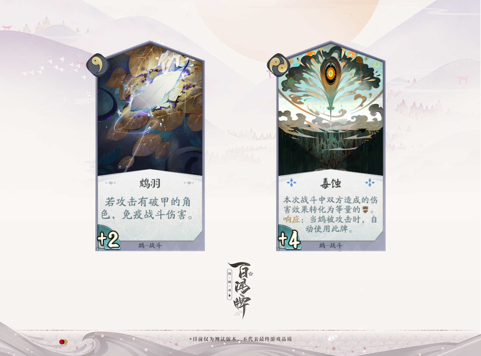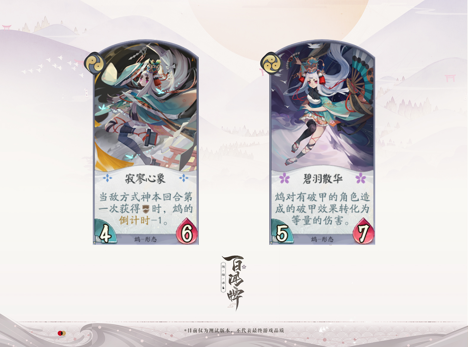 《阴阳师:百闻牌》蜃气楼试营业(安卓限号计费删档测试)即将于10月16日开启,蜃气楼又将迎来一位新的用毒高手!威力丝毫不下于蛇毒的鸩羽之毒,会有怎样的效果呢? 今天就给大家介绍一下,鸩是如何用破甲开启死亡倒计时的↓↓↓ 【式神介绍】 鸩高达5点的生命值保证了其前期的生存能力。每两回合给对方牌手叠加3点破甲值的能力,使她成为具有周期性爆发特性的输出型式神。 【卡牌介绍】 【法术牌】 鸩羽苏生在不亏牌的情况下触发鸩的能力,其功能性能灵活运用于对局的各个阶段。 觉醒带来的成长进一步加强了鸩的持续作战能力,随着对局的推进,鸩对敌方的威胁将越来越大。 【战斗牌】 功能多样的战斗牌可以在对局中与鸩的能力形成配合。 鸩羽和毒蚀为鸩在前中期的战斗中提供保护。 毒之华依照百分比为敌方单体叠加破甲值,不但能有效针对高血量式神,还能给敌方牌手叠加巨额破甲值,造成致命威胁。 致命诱惑则能够提升己方牌手血量优势。 【形态牌】 两种不同的形态分别从两个方面对鸩的能力进行强化。 寂寥心象可以让鸩更加频繁地发动能力,使其快速成长。 碧羽散华则能够将鸩的破甲能力转化为伤害,打出更加迅猛的爆发伤害。 (ps:上述卡牌技能效果以游戏实装为准) 【卡面欣赏】 破甲配上倒计时,频繁地给对方牌手生命值造成威胁。这就是绽放在鲜血之上的剧毒之花,鲜艳却危险! 更多游戏信息及福利活动,请留意以下官方平台情报: 《阴阳师:百闻牌》官网:https://ssr.163.com/ 官方微博:阴阳师百闻牌 官方微信:网易阴阳师百闻牌 官方贴吧:阴阳师百闻牌吧 官方QQ群: 1群:692196064(已满);2群:604427333 3群:341735670;4群:785854482 |