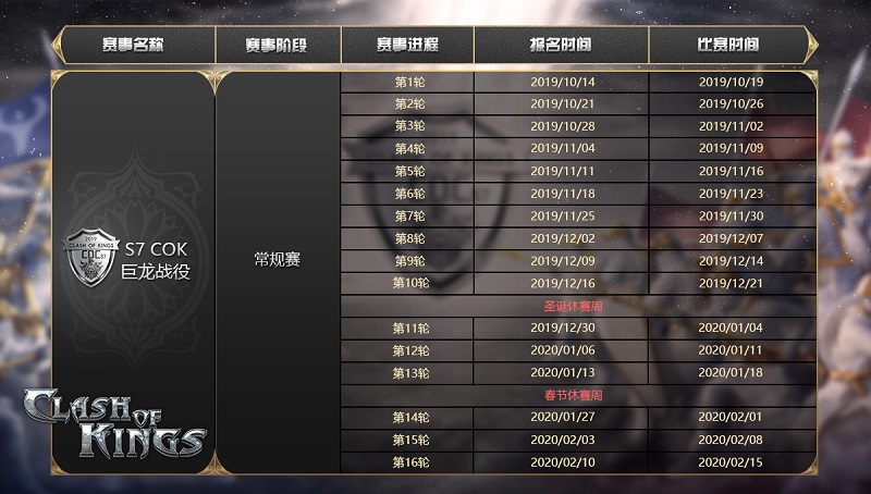 追逐荣耀,永不止步!第七届CoK巨龙战役已于2019年10月14日系统时间0点开启正式常规赛第1轮报名。赛事已如火如荼的展开,下面让我们一起看看本届巨龙战役的新亮点! 美术新升级,战场更热血。 本次巨龙战役,将在红色烈焰沙场展开,战场内所有建筑全部翻新,升级后的新建筑拥有唯美的建筑外表,细节更加精致,画面更加立体!建筑上古老的痕迹诉说着曾经的历史,干涸的血迹吟唱着昨日的传奇,复杂而有序,粗犷厚重而不失庄严,俯瞰世界的磅礴激荡之情,油然而生,静美之秋与凛冬将至的“秋冬版”建筑外表,必将为领主们呈现出一场绝美的视觉盛宴! 劳逸结合,快乐列王。 为了让各位领主在游戏与生活中找到更多的快乐,我们将在第七届CoK巨龙战役常规赛期间,为各位领主准备了,圣诞休赛期与春节休赛期。同时为了战斗节奏更加紧凑,战斗过程更加刺激,第七届CoK巨龙战役季后赛战场时间将改为75分钟(5分钟准备时间)常规赛战斗时间仍为120分钟。最后为了让广大领主在面对任何对手时都有机会获得比赛奖励,个人单场奖励的积分要求下调为:0-50分,51-100分,101-150分,151分以上,共四档。 建筑调整,氛围升级。 为了增加代入感,第七届CoK巨龙战役常规赛期间,将加入攻击行为的战场配音(请以更新公告为准)。您在本届比赛中,将有机会听到“发起集结”之类的配音。同时本届巨龙战役中,骑士大厅暂时退役,巨龙战役战场中将不再出现骑士大厅建筑。 荣耀,无限可能!战友集结号响起,新一届的征程已经开启! |
