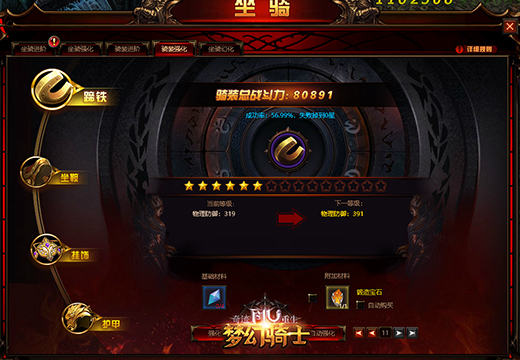 坐骑是每一个玩家最重要的战斗伙伴,在冒险的旅途中它不但能够为玩家提供极大的战斗力支持,也是玩家探索各大地图的重要助力。在塔人《奇迹重生:梦幻骑士》的世界里,骑上一个强大的坐骑,前方再大的冒险,你也能勇往直前! 炫酷坐骑,炫酷体验 《奇迹重生:梦幻骑士》的每一个坐骑不仅仅是玩家的代步工具,更重要的是玩家通过坐骑可以获得海量的属性加成。随着坐骑等阶的不断提升,越高阶的坐骑不但造型更加威猛霸气,同时也能为玩家带来更高的战斗力提升。而且坐骑系统是游戏中玩家获得最极品属性“无视一击”的关键途径! 成熟的坐骑,最强的座驾 除了通过坐骑升阶来再加强我们“座驾”的属性,“坐骑强化”系统也是我们进一步强化坐骑的关键。随着坐骑不断强化,将经历“初生期”“成长期”“成熟期”“觉醒期”“巅峰期”“究极期”6个阶段。特别是达到了究极期的坐骑才称得上是真正的猛兽,骑上它任何敌人都不过是浮云! 坐骑也有装备 塔人《奇迹重生:梦幻骑士》不但玩家可以穿戴装备,强化装备来提升战斗力,坐骑也有自己独有的装备,分别是“蹄铁”“坐鞍”“挂饰”“护甲”四件装备。激活全部四件装备可以大幅度提高坐骑为玩家增加的属性。而且这四件装备同样也是可以进阶和强化的,比如挂饰装备在强化和进阶之后能够为玩家提供大量的“攻击力”属性加成! 最强大的玩家当然要配上最强大的坐骑,霸气的造型,海量的属性加成才是强者们的专属战斗伙伴。打造属于你的威猛坐骑,你的冒险之路从此一片坦途! |