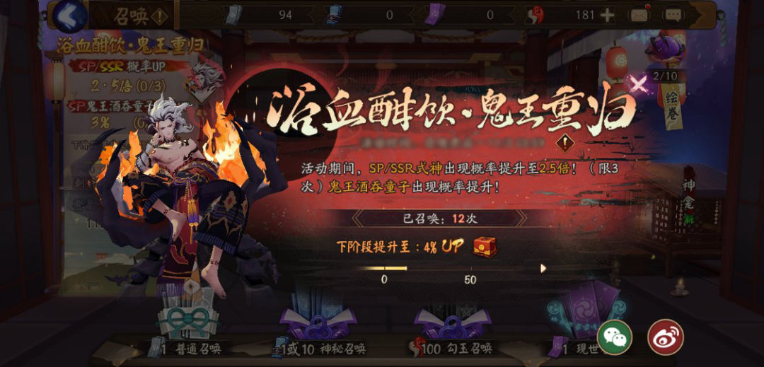 大江山妖族尸横遍野,怒火化作焚天炽焰。妖力迸发,化身战场修罗,鬼族的王者在此刻浴血归来。 浴血酣饮,鬼王重归,全新SP阶式神鬼王酒吞童子即将正式降临平安京!SP/SSR阶式神召唤概率亦将随之提升! 【浴血酣饮·鬼王重归】 从决战鬼王座大岳丸血量下降到50%至11月10日23:59,多重召唤福利来袭! [SP/SSR阶式神出现概率UP] 在召唤期内使用神秘的符咒、勾玉、现世符咒进行召唤,SP/SSR阶式神出现概率提升至原来的2.5倍!每位阴阳师可享受3次SP/SSR概率UP的机会! [指定概率UP阶段成长] 活动期间,使用神秘的符咒、勾玉、现世符咒进行召唤,召唤出SP/SSR式神时,SP鬼王酒吞童子的指定出现概率提升,且此出现概率将在召唤期内随召唤次数持续提升! 对于10月30日维护前已达成SSR全集赏的阴阳师,本期指定出现概率将由初始10%持续提升,并在500次召唤后提升至100%! 对于其他阴阳师,本期指定出现概率将由初始的3%持续提升,并在500次召唤后提升至15%! [召唤特殊福利] 对于维护前已达成SSR全集赏的阴阳师,在活动期间,若召唤699次仍未召唤出SP鬼王酒吞童子,则第700次召唤时出现的必定为SP鬼王酒吞童子,并额外获赠惊喜礼包一份。之后消耗该指定式神的概率UP次数。 若已提前召唤出该式神,则本福利将不再享受。 pic.@诶皮 对于维护前未达成SSR全集赏的阴阳师,召唤次数达到700时,指定式神概率UP,额外增加10%,即增加至25%。 [星熊童子的馈赠] 活动期间,首次使用神秘的符咒、勾玉、现世符咒进行召唤累积100次,可获得SR阶式神星熊童子。 [召唤阶段礼包] 召唤期内使用神秘的符咒、勾玉、现世符咒进行召唤达到指定次数时,还将获得对应的阶段礼包,包含御行达摩、大量神秘的符咒、皮肤券、勾玉、自选SR等稀有道具。 注意: 1、本次召唤活动面向所有等级不低于15级的阴阳师开放。 2、拥有指定SP/SSR概率UP时,若召唤到SP或SSR式神,均会根据当前出现概率计算是否召唤出指定式神。 3、SSR全集赏以图鉴中点亮的SSR式神为准(两面佛除外) 4、SSR全集赏不包括联动限定SSR奴良陆生、卖药郎、鬼灯、犬夜叉、杀生丸、桔梗、黑崎一护。 【神子渡世·一念魔佛】 重燃的大江山火云燎烈,觉醒的记忆在焰风中弥卷。鬼王的过往,大江山的原貌,都将随这绘卷循循展述。 [神子] 伊吹山寺的香客络绎不绝,只为听那神山之子诵一句经文。得偿所愿的信徒们下山而去,却将苦怨留随孤寂的神子。 [归途] 斑驳的佛钟敲荡着乱世沉苦,“都说神佛法力无边,也不过如此。”一念魔佛,堕入鬼道,只身去寻那最纯粹的归途。 [本能] 恶瘴丛生处的征战永无止境,无论清规戒律唯有弱肉强食,以寻从的本能之姿加入厮杀。“真是痛快!” [恶战] 跃上山巅追寻极致的恶鬼之道,如天崩地裂一般的鬼疆。与鬼域至强展开的浩大恶战,不过是一场痛快的嬉闹。 [征服] 烈风阵阵,吹散神子的头发,金丝重重,以经文声纺缠绕。面对伏诛求饶的山岳神,笑道“我要你成为我的王座。” [鬼王] 落败的石巨人伏身化作高山,此处便为障隔人鬼两界的大江山。统帅于那火云弥天的鬼王座间的,便是大江山的鬼王酒吞童子。 【绘卷修复】 活动时间:决战鬼王座大岳丸血量下降到50%至11月26日23:59 追忆绘卷记述了鬼王酒吞童子曾经的故事,参与游戏内玩法,可获得绘卷碎片用以修复。绘卷修复后,即可查看对应的插画。 [活动奖励] 每捐献一个碎片,都会获得一份随机奖励,最终根据捐献贡献排行,发放全服奖励。排名前列的阴阳师可获得鬼王酒吞童子契约书碎片、动态头像框·烈酒火云、御行达摩、高星奉为达摩、神秘的符咒以及大量金币等奖励! 五芒星阵落下,符咒翻飞间,金光乍现。火焰腾空而起,映出来者高大身影,不知各位阴阳师准备怎样迎接归来的鬼王呢? 更多精彩内容,请关注 《阴阳师》官方网站(yys.163.com)、《阴阳师》手游公众号(yinyangshi163)。 【关于“网易大神”】 网易大神是网易游戏旗下的精英玩家社区。这里汇聚了广大精英玩家、游戏圈红人、行业大咖,集合了网易独家的官方资讯和福利趣闻,旨在为玩家打造一个丰富的游戏兴趣社交圈。玩家可以在网易大神与游戏中的好友实时聊天、多元互动;以游戏会友,结交更多游戏同好,和大神一起发现更多游戏乐趣。 官方网站:https://ds.163.com 官方微信:wyds_163 官方微博:@网易大神 APP 官方大神号:@网易大神 【关于《阴阳师》手游】 网易自研旗舰级IP,唯美空灵的和风写意,经典的半即时回合制RPG,卡牌收集、养成,基于LBS技术的社交PK,新番剧情跌宕起伏,上百种式神亟待觉醒。2019年9月20日三周年庆版本上线,美术风格全面迭代升级, 3D唯美和风手游《阴阳师》等你展开神秘的奇幻之旅。 官方网站:https://yys.163.com 官方微信:yinyangshi163 官方微博:@网易阴阳师手游 官方哔哩哔哩:网易阴阳师手游 官方TapTap:https://www.taptap.com/app/12492 |
