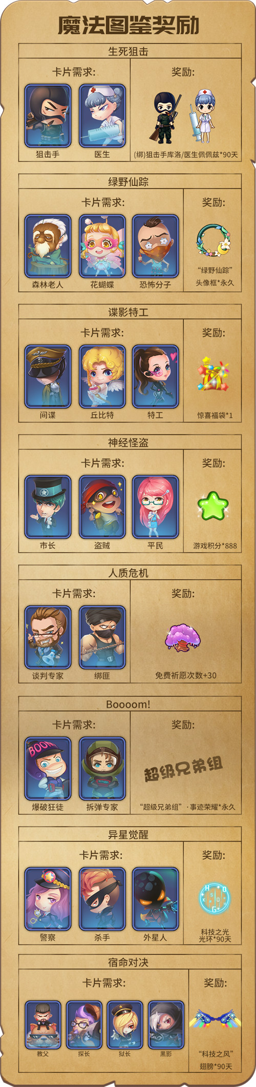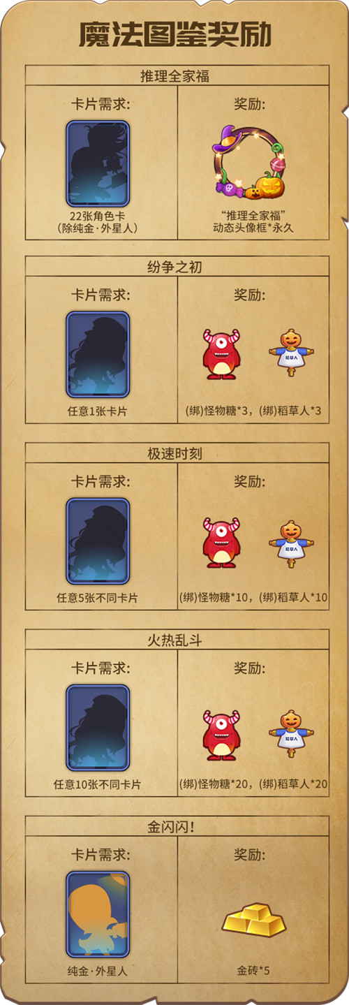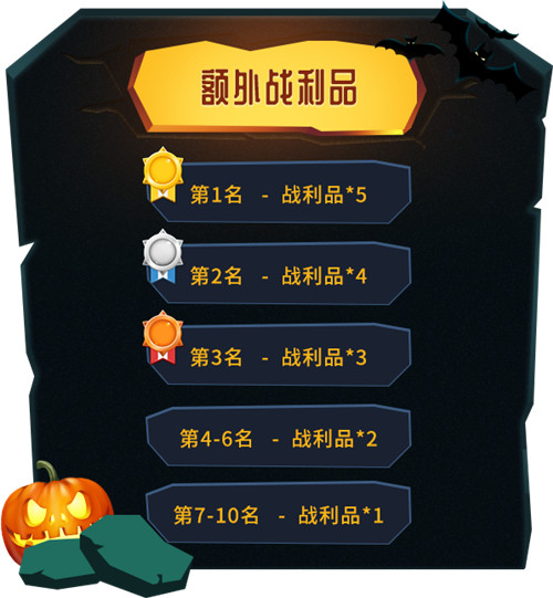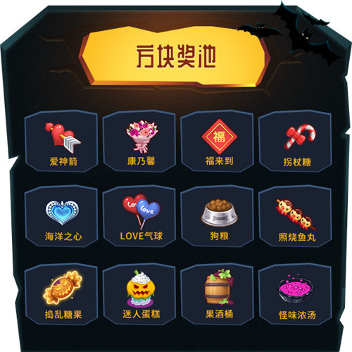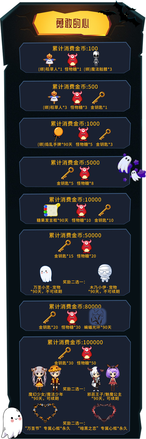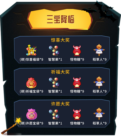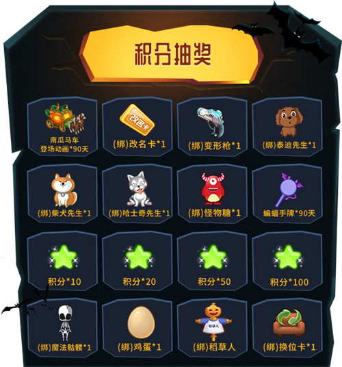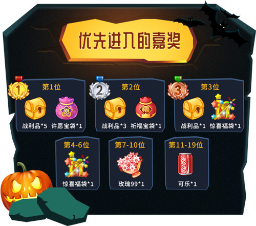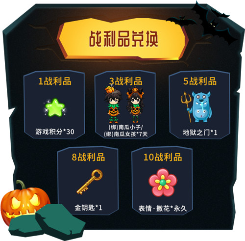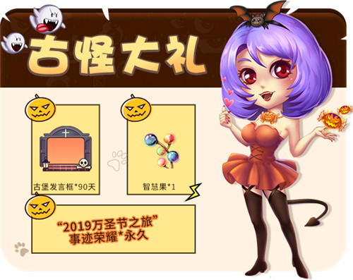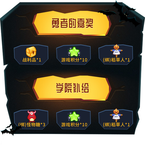 让我们围着南瓜灯坐下,趁着夜色还很美妙,让我们开始今夜的“惊悚”旅程!请收拾一下您的躁动与不安,毕竟接下来发生的事情,将会更加迷离和神奇——《推理学院》万圣节活动惊喜降临!今晚,就让我们与幽灵和蝙蝠们为伴,一起享受一年一度的欢乐盛会吧! 活动时间:2019年10月30日14:00-11月7日23:59 活动一:惊魂长廊,每日签到送好礼 推开古堡的大门,沿着长廊一直往前走,我已经为你准备好了惊喜的礼物,但是你必须记住——千万别回头! 活动期间,500积分及以上玩家完成普通签到可领取《推理学院》为你准备的礼物和绑定的“怪物糖”一份! 活动规则: 1. 对活动期间的补签也能够被记录; 2. 稻草人:功能类道具,被使用后变成一只稻草人,退出房间或使用还原卡可恢复; 3. 怪物糖:讨好类道具,被使用后增加2积分,且被变成一只怪物,使用其他道具可恢复。 活动二:魔王入侵,加入城市护卫队 噢!或许我不应该在你愉快游戏的时候来告知您这个不太好的消息,但事发突然——魔王入侵了!城市的防卫力量完全不足以解除它的威胁,我们需要您和您的伙伴的帮助! 活动期间,点击“参与”将会随机加入一支“护卫队”:天空护卫队、海洋护卫队和陆地护卫队! 您需要和队友们通过以下方式,获得“防御力量”,以抵御每天00:00来自魔王的攻击!偷偷告诉您:魔王最讨厌吃怪物糖! 魔王每天会对三支队伍分别造成“三支队伍平均防御力量”的伤害,在成功抵挡魔王攻击的队伍中,当日防御力量在10及以上的成员都能够获得“勇者的嘉奖”;未能成功抵挡魔王攻击的队伍,当日防御力量在10及以上的成员都能领取“学院补给”。 之后清除每天的防御力量重新计算。 在各自队伍内,玩家可看到每天“防御力量”最强的十位玩家,在每天00:00,无论队伍是否抵御魔王的攻击,位于排行榜前十的玩家均能获得额外战利品: 在活动期间,使用“战利品”可以参与以下物品的兑换: 活动规则: 1. “杀手游戏”需至少12人及以上参与,且房间开启IP限制,每天可重复完成,但每日最多只能通过游戏获得50战利品; 2. 无论接收绑定或非绑定的“怪物糖”,都可以增加防御力量; 3. “表情·撒花”每位玩家最多只能兑换一次。 活动三:勇敢的心,金币消费送惊喜 超稀有的服装、宠物与光环!古堡的宝藏总算重见天日,伙伴们,冲呀! 活动期间,玩家累计消费金币达到相应数量后,则可领取对应奖励! 活动奖励: 活动规则: 1. 所有奖励只能领取一次; 2. 通过商城购买金砖、金元宝,赠送,购买“投资计划”,购买“超级大咖”所消费的金币不参与活动; 3. 直到在活动期间拥有伴侣为止,才可领取“伴侣奖励”; 4. “专属心框”可通过“伴侣”界面进行切换,获得后永久有效,但离婚后会消失。 活动四:魔法图鉴,收集推理全家福 每逢热闹时刻,我们的身边总是不会缺少熟悉伙伴的身影——帅气的莫可,迷人的菲璐!想知道这一次他们又给我们带来怎样的惊喜吗?答案即将揭晓! 活动期间,惊喜福袋、祈福宝袋、许愿宝袋加入商城限时出售!并且,每打开这三份福袋之一,都有机会获得一把“金钥匙”! 使用金钥匙,可以参与“角色卡片”抽奖,每份金钥匙抽取一次!每次抽奖,您都能够100%获得22张杀手游戏角色碎片之一,还有机会获得“纯金·外星人”碎片! 魔法图鉴奖励: 当您获得任意不同碎片的时候,也可以获得奖励哦! 活动规则: 1. 当玩家拥有至少2张同种卡片时,可将多余的卡片赠送给粉丝; 2. “狙击手库洛/医生佩佩兹”服装奖励将根据玩家性别发放; 3. 无论打开是否绑定的福袋,都有机会获得金钥匙; 4. “金钥匙”将在活动结束后由系统回收。 活动五:幽灵迷踪,超级积分榜开启 恐怖的白色幽灵,午夜的空旷走廊,漆黑的惊恐梦魇——想想都觉得可怕! 活动期间,通过接收道具增长积分可进入“超级积分榜”参与排名!并且,每增长500积分可获得一次抽奖机会,通过抽奖,有机会获得“南瓜马车登场动画”、“蝙蝠手牌”以及积分、道具。 活动结束后,为“超级积分榜”上的前10名玩家发放奖励。 活动奖励: 超级积分榜: 活动规则: 1. 仅计算通过接收道具所增加的积分,包含“太极罩”与整蛊道具产生的加分效果; 2. 在活动期间若失去积分,不会影响在“超级积分榜”上的排名。 活动六:怪物九宫格,幸运女神在召唤 在一块背面朝上的九宫格中,藏有3颗炸弹,而其余的方块中全是充满惊喜的奖励! 每次决定开启寻宝之旅时,只需花费3000游戏币就能加入其中!相信你的直觉,点开一个方块吧!我可以为你好好保存你所有翻开的奖励,在你决定结束这一局的时候可以全部领走它们,但如果你一旦翻到炸弹,这些所有奖励都会消失! 每一局探索只需一次性支付3000游戏币,直到你领取奖励或者翻到炸弹。在那之后,九宫格将会重置,等待下一位探索宝藏的幸运冒险家! 九宫格方块奖励: 神奇宝藏在哪里: 每局探索累计从九宫格中获得3/4/5/6份奖励时,你还能获得额外的奖励,并且额外奖励能累积增加! 每局累计获得3份奖励:额外随机赠送玫瑰99、地狱之门、金山之一; 每局累计获得4份奖励:额外再随机赠送祈福宝袋、火鸡、烟花之一; 每局累计获得5份奖励:额外再随机赠送泰坦尼克号、iPhoneX、财富岛之一; 每局累计获得6份奖励:额外再赠送金砖*1; 万圣节的馈赠: 当然,你绝对不会空手而归——每踩到一个炸弹,就会获得一份非绑定万圣节专属道具【怪物