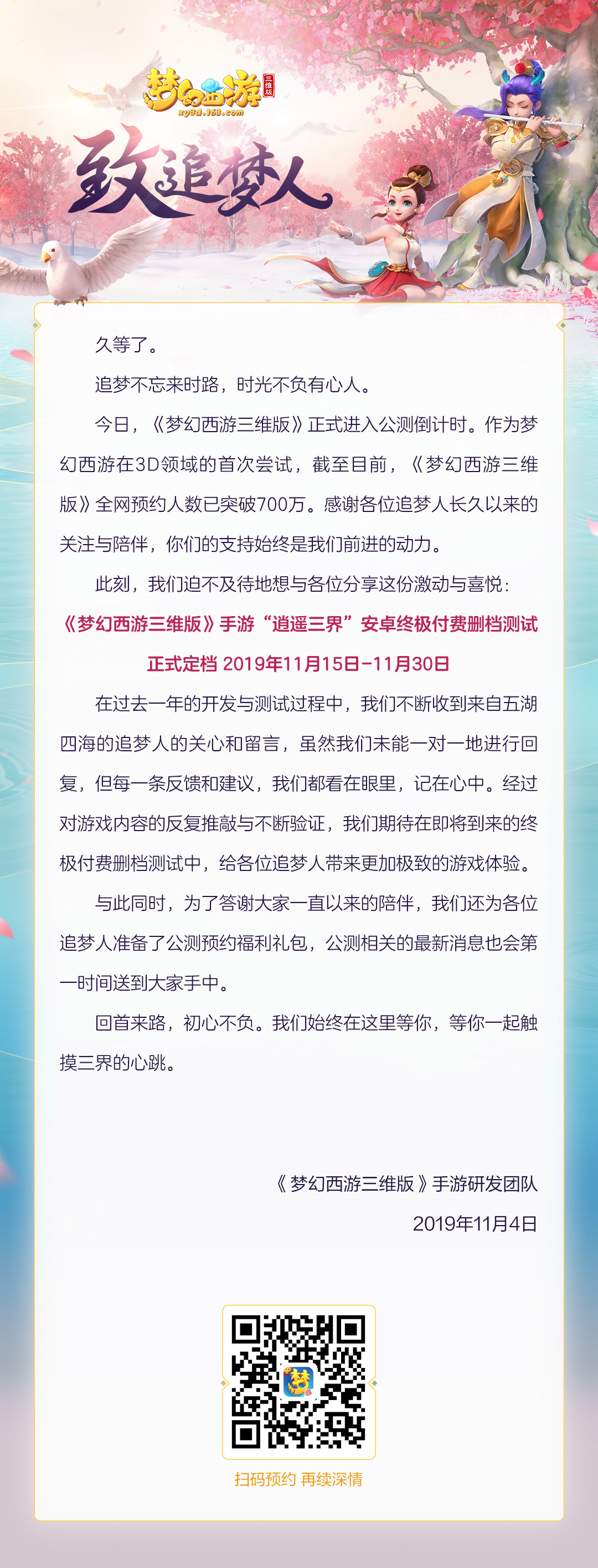 终极测试来了,想必少侠们已经猜到,公测也不会遥远了!为了答谢大家一路以来的陪伴,由开发组精心准备的公测预约福利礼包已打包完毕,现在预约起来(https://xy3d.163.com/),将有更多豪礼回馈! 本次测试为安卓终极付费删档测试,测试邀请码正在官方微信公众号、微博(@网易梦幻西游三维版)掉落,不想错过的少侠赶紧去关注一波吧!逍遥三界,冒险旅途即将开启,你准备好了吗? 关于《梦幻西游三维版》手游 《梦幻西游三维版》是由网易梦幻西游金牌团队研发的次世代3D即时制手游,延续了梦幻西游的经典玩法、独特的国风美学,并塑造了一个万物有灵的西游大世界:随心选择的善恶身份、自由结交的仙魔精怪、无定式的剧情发展、开放探索的游戏规则……即刻启程,触摸三界的心跳。 更多游戏详情请关注 官方网站:https://xy3d.163.com/ 官方微信公众号:wymhxy3d 官方微博:网易梦幻西游三维版 客服电话:95163686 |