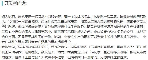 11月初,一款名为《工匠与旅人》的手游迅速在TapTap预约榜中蹿红。在没有大规模宣传的情况下,不到一周时间游戏便取得了TapTap预约榜Android和iOS双榜第一的好成绩。截止目前,游戏预约已突破40000人,且评分高达9.7分。 游戏还未开测,前期也只有TapTap上的宣传视频和官方介绍文,凭什么《工匠与旅人》可以在短时间空降预约榜首的位置呢?要知道和《工匠与旅人》同期在榜上的游戏还有《哈利波特:魔法觉醒》、《暗黑破坏神:不朽》和《使命召唤手游》这类强IP且大厂发行的产品。接下来让我们从两个方面分析一下原因。 ● 玩法:触达手游玩家需求 先说几个关键词:MMORPG,模拟经营,角色养成,探索战斗,多元化职业。在开发者的话中,我们可以了解到游戏是一个以经营养成为主要玩法的MMORPG,可玩职业包括了战斗、贸易和生产等三系,这样多元化的职业在手游MMORPG里实属少见,尤其是开发者表示这些职业间会有很强的合作性,试想一个高度自由的模拟经营游戏,玩家A可以全部建造生产类建筑,培养生产类职业,一旦面对战斗、贸易的情况则可以寻求玩家B或C的帮助。 可以说,多元化的职业赋予了《工匠与旅人》高自由性,而社交强合作的设定又赋予了玩家最真实的扮演体验,正因如此《工匠与旅人》俘获了众多玩家的心,不少玩家通过评价表达出对玩法的认可和渴望。 ● 沟通:真诚对话不搞模板 观察发现,无论主题帖还是回复,《工匠与旅人》官方处理方式非常真诚和自然,管理员设定上像是诙谐有趣的管家,更加拉近了游戏开发者和玩家之间的距离。 可以是拉帮结对。 可以委婉拒绝说实话,杜绝“您好,将建议反馈给开发”。 可以正儿八经回答问题。 也可以偷偷划下水。 除了以上两方面,游戏的画面其实也吸引了一部分玩家,但目前手游市场画面优秀的游戏不占少数,而TapTap渠道的用户也更注重游戏性,由此看来玩法和沟通才是令《工匠与旅人》一度登顶预约榜的原因。不过就如同许多玩家所顾虑的,这样的游戏是否可以开发完成还是未知数,希望一切美好能在游戏正式上线后依然延续。 |