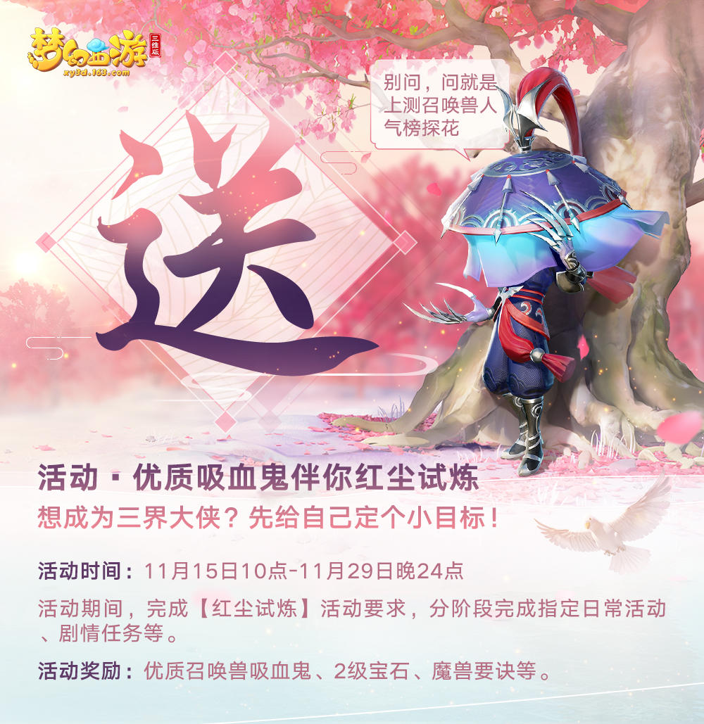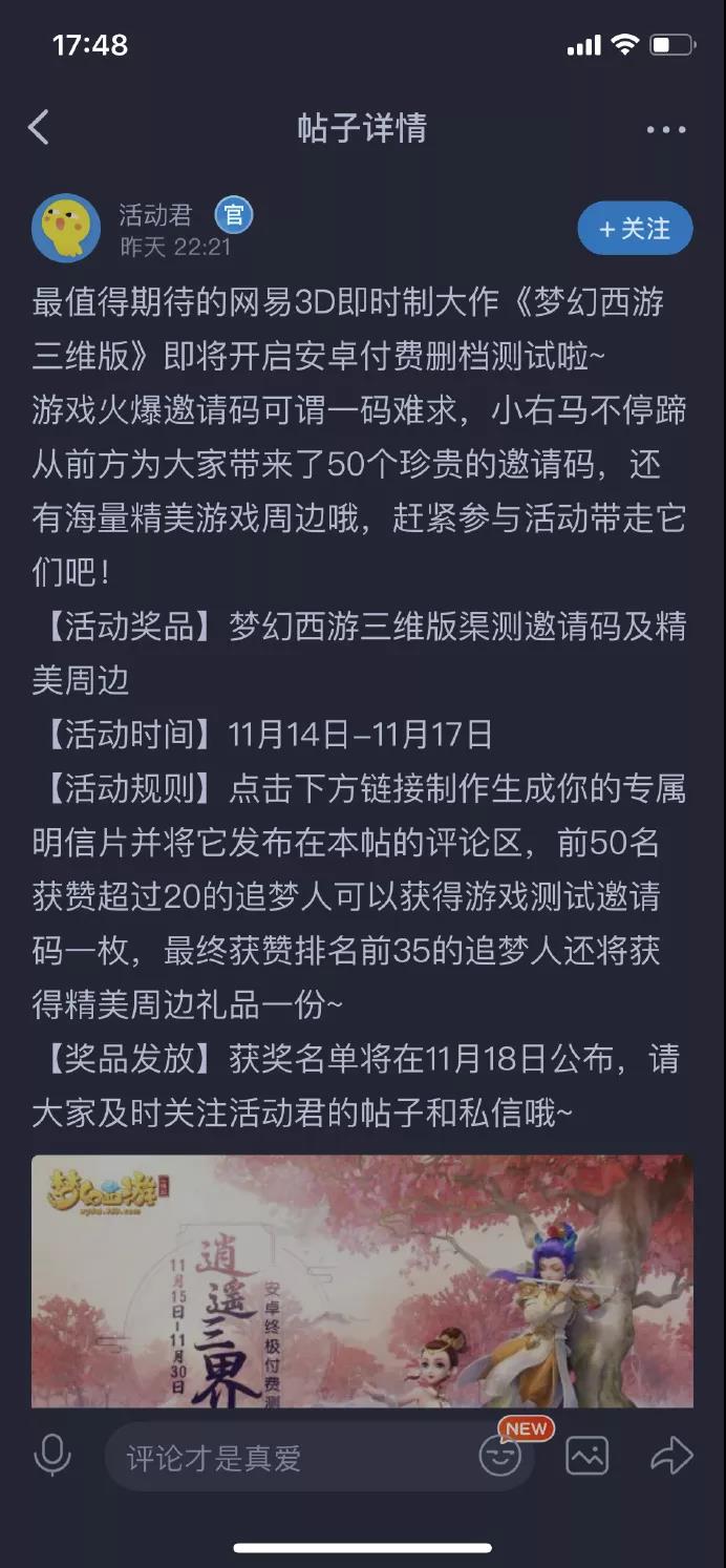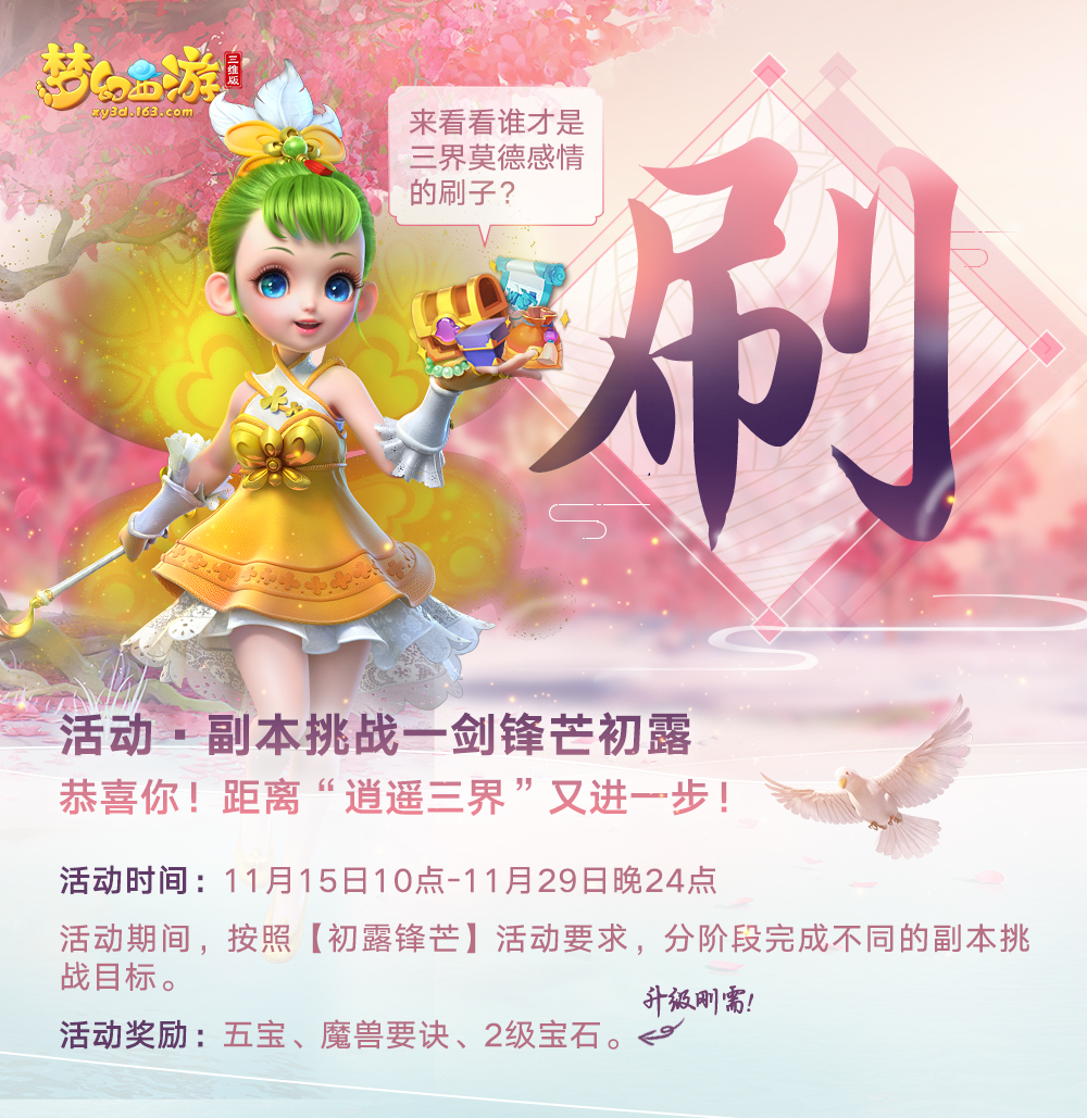 此梦经年,却道初心如故。 《梦幻西游三维版》“逍遥三界”安卓付费删档测试将于2019年11月15日开启,感谢各位追梦人长久以来的等待与陪伴,欢迎进入三界,展开你的全新冒险。 【开测第一天】 1、专属福利助力红尘追梦。 2、与大唐国师袁天罡结下不解之缘。 3、擂台切磋辨高下。 4、泡泡、小悟空,人人都领,不领才怪! 5、超级神兽即将登场,猜猜他们是谁? 6、关注双微,领取专属公测礼包。 三界终于要热闹起来了,大家都准备好了吗? 相信手速快的小可爱已抢先进入三界,还没有抢到测试资格的也不要灰心。今天下午4点将会有第2批测试资格发放。名额有限,先到先得。可不要错过这最后的机会! 已经开启了全新冒险的你,是否了解所有的福利活动?今天,姐姐就来帮大家梳理一下思路,协助各位将活动礼包完美拿下! 【逍遥三界专属福利】 想成为三界大侠,先给自己定个小目标。完成以下活动,用小小的进步,换取大大的收获。 行走三界,没有一个响亮的称号怎么行?姐姐在这里将公测绝版称谓“逍遥一梦间”送给大家。 当然,还有功能齐全的“升级礼包”,助你早日冲上60级。 升值!翻倍!一系列特惠充值活动,让你买到就是赚到。 1元预购公测礼包,升值600%稳赚不赔! 发动你的创意,记录三界之美。还有超丰厚的测试礼包、周边奖励等你拿。 活动详情请点击→公测648等你来拿!玩家有奖征集大赛现已开启! 【去最右领取测试邀请码】 脸黑又手慢?不要慌!“最右”来搞事了! 三界联合最右app为小可爱们准备了50个测试邀请码和精美的游戏周边等好礼。 现在登录最右app,搜索#梦幻西游三维版#话题,分享你制作的专属三界明信片,就有机会抱走福利! 【孟婆姐姐独家礼包】 参与方式: 1、参与“逍遥三界”安卓终极付费删档测试,并关注官方微博/微信“网易梦幻西游三维版”。 2、在官方微博私信或官方微信首页发送关键词“逍遥三界”,公测后可领取姐姐准备的公测礼包。 礼包包括:修炼果*5、绿芦羹*5、1级宝石袋*2(微信专属)、花豆*5(微博专属)、月华露·小*3、银券*3 注意:双微奖励可同时获取。 【线上圆桌首度开启】 当轮回重演之时,三界不但会万象更新,还将更有温情。在破解天命的同时,难免会对三界有些困惑和建议。姐姐已经摩拳擦掌,在后台等待回答大家的提问了。 对了,不只是姐姐,开花组的诸位也已蓄势待发。在本次“逍遥三界”测试中,我们将首度开启“线上圆桌”栏目,在测试期间回答大家最迫切的提问,聆听大家的意见建议,愿我们在三界一同成长。 【活动时间】 2019年11月15日 至2019年11月21日 所以,请大声说出,关于《梦幻西游三维版》的想法吧!欢迎去往官方置顶微博中留下你对游戏的建议与意见。 关于《梦幻西游三维版》手游: 《梦幻西游三维版》是由网易梦幻西游金牌团队研发的次世代3D即时制手游,延续了梦幻西游的经典玩法、独特的国风美学,并塑造了一个万物有灵的西游大世界:随心选择的善恶身份、自由结交的仙魔精怪、无定式的剧情发展、开放探索的游戏规则……即刻启程,触摸三界的心跳。 |