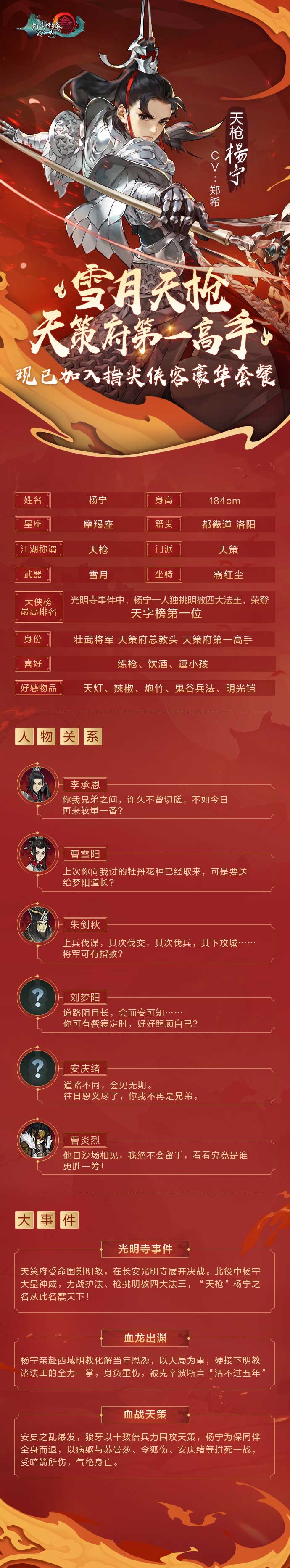 《剑网3:指尖江湖》“风气稻香”版本火热进行中,杨宁作为“风起稻香”版本的新侠客,因其独特的空中战斗武学套路而备受瞩目。今天,就让三妹带领各位少侠解读天枪杨宁的身世吧! 【解读天枪杨宁的身世】 雪月天枪杨宁,天策府前总教练使杨明之子,天策府实至名归的第一高手。 杨宁从小天资聪颖,武学天资卓越,在江湖中经历了风雨磨砺,因此枪术十分精湛;虽然枪术过人,他却也谦逊持重,因此深得天策府前辈们重视。杨宁年少时就已成名,但在他身上却看不到半点骄纵习气,凭借着一身本领,被敕封为壮武将军,后来又任天策府总教练使。无论是天策府都统李承恩,还是其余天策将士,大家都对这位总教练使信任有加。 杨宁善长枪术,他的枪法不但威猛而且锐利,凭借一杆长枪守卫大唐太平,就连当年明教四法王都曾是他的手下败将。 想要了解更多剧情故事,不妨和三妹一起重温一遍经典的大唐异闻录之《岂曰无衣》吧! 【杨宁详细资料曝光】 天枪杨宁作为一名新侠客,凭借出色的武学表现以及英气的容貌备受少侠们青睐,今天三妹也深入打探,为各位少侠带来了杨宁的详细资料,少侠想知道的身高、生日甚至星座!三妹都帮你打听到啦~快来看看吧! 【天枪杨宁现已加入豪华套餐】 杨宁破招类型为长兵,相比较于同门侠客,杨宁的技能显得尤有特色。杨宁能够利用“疾风逐月”技能,在空中挥出雪月气劲,不仅能够令敌人无法跃身穿过,自身还可以在雪月气劲上移动且施展招式能够得到增强,利用这一技能能够很好地压制浮空型侠客,打出大量伤害。同时搭配秘籍可在空中打出连招,武学套路千变万化! 在先前“风起稻香”的新版本活动中可限时获取侠客杨宁以及外观【松寒】,如果少侠不小心错过了活动,也不用着急!今天三妹为各位少侠带来“豪华套餐”,侠客杨宁将以1500通宝的价格上架售卖,同时杨宁外观【松寒】也将以1400福币的价格进入福币商店,可供少侠兑换,错过活动的少侠们不要犹豫啦~赶紧前往获取侠客吧! |
