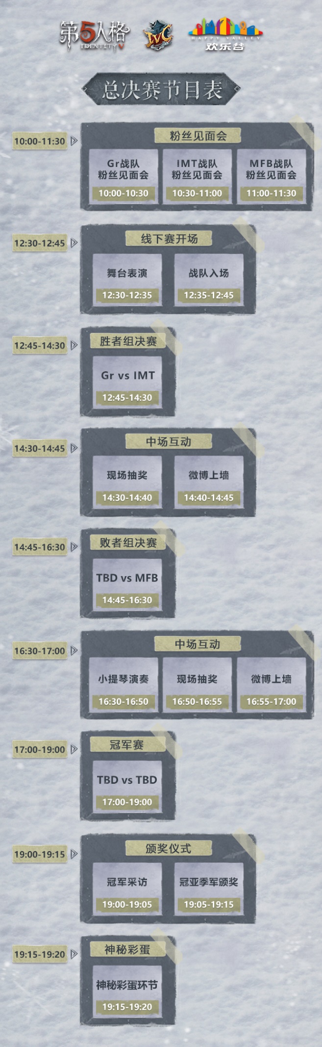 2019IVC冬季精英赛 最强战力的比拼,接踵而至的强强对话,五周的激烈角逐后三支战队突破重围!11月30日,2019IVC冬季精英赛决赛将在重庆欢乐谷展开最后的决战,Gr战队、IMT战队和MFB战队齐聚总决赛现场,向着IVC冬季赛冠军的宝座发起最后的冲击!巅峰对决,一触即发! 三强聚首,最强对决一触即发 以小组赛B组头名成绩晋级的Gr战队,可谓本次冬季精英赛的王者之师,从小组赛的3-0战绩到淘汰赛的不败战绩,Gr战队的状态一直保持的非常出色,战术鲜明,配合默契而且打法凶悍。作为队内监管者扮演者的Gr丶皮皮限多次入选最佳演绎,上演“四杀”表现,Gr战队也以不败战绩挺进胜者组决赛。以小组赛第二晋级的IMT战队在死亡之组B组的出线颇为惊险,但在淘汰赛中,IMT战队的状态愈发火热,队员的默契和比赛表现都有进一步的提升,强势晋级胜者组总决赛。从败者组杀出重围的MFB战队的晋级之路显得颇为坎坷,以小组第二出线的他们在淘汰赛第一轮的对决中状态不佳落入败者组。但MFB战队在随后的两场败者组的比赛中重整旗鼓,并在最后一场比赛中绝地翻盘惊险获胜成功晋级败者组决赛,经过洗礼的他们一定不容小觑。三支战队能否在总决赛的舞台延续此前的高光发挥,哪支战队能最终问鼎2019IVC冬季精英赛冠军?11月30日,让我们拭目以待! 场外精彩继续,欢乐不停歇 本次《第五人格》IVC冬季精英赛线下赛将进行三个场次的对决,分别是胜者组决赛、败者组决赛以及最终的冠军争夺赛。本次冬季精英赛的奖金进行了升级,总奖金高达30万元人民币,其中冠军将独揽135,000元,亚军和季军也可获得60,000元和45,000元的丰厚奖金,殿军可获得24000元奖金,第5~8名战队可以获得9000元奖金。冠军队伍将获得《第五人格》全球赛事深渊的呼唤(COA)总决赛直邀名额,向《第五人格》全球电竞赛事的最高荣誉发起冲击!与此同时,在重庆欢乐谷·恺撒宫的《第五人格》IVC冬季精英赛总决赛现场,现场观众们不仅可以亲身感受《第五人格》电竞赛事的魅力和激情,还可以近距离接触明星选手,相信赛场之下的他们会给大家带来不一样的感觉。 场内的总决赛代表着《第五人格》最高水平的竞技,场外欢的欢乐互动也不能少。现场观众们可以在现场游玩“幸运儿的骰子对决”、“厂长的鲨鱼牙”以及“来自求生者的涂鸦纪念”来获得各类周边奖励,数量有限,先到先得哦。 专业主持解说助阵,赛事全面升级 本次《第五人格》IVC冬季精英赛总决赛现场不仅有大家最熟悉和喜爱的主持人苏苏,还有实力解说头鱼、凉哈皮、贤儿、司机,他们将在现场为观众带来最专业、最深度、最欢乐的比赛分析,与玩家共同见证最终冠军时刻的到来!11月30日,2019IVC冬季精英赛决赛将在重庆欢乐谷展开最后的决战,继续锁定各大直播平台官方赛事直播间,不见不散! 感谢本次比赛的官方合作伙伴欢乐谷、脉动、迪瑞克斯电竞椅、招商银行信用卡以及合作直播平台CC直播、Bilibili直播、虎牙直播、西瓜视频、斗鱼直播、触手直播、抖音、快手直播、一直播、爱奇艺游戏、优酷直播、AcFun、好看视频对本次比赛的大力支持! 【关于欢乐谷】 中国主题公园第一连锁品牌——欢乐谷承袭华侨城独有的创想文化内核,集成世界领先的高科技游乐设施、国际接轨的都市演艺精品、深具人文魅力的主题文化体验,用“动感、时尚、激情”的品牌个性与丰富内涵,向现代都市人提供愉悦身心的多元化旅游休闲方式与都市娱乐产品。 东西南北中,欢乐大中国!一次次惊心动魄的欢乐历程,一个个亦真亦幻的欢乐世界,一座座永不落幕的欢乐之城。随着深圳、北京、成都、上海、武汉、天津、重庆七大欢乐谷相继落成运营,以及在建的第八个欢乐谷——南京欢乐谷,欢乐谷主题公园已累计接待了1.8亿人次的海内外游客,当之无愧地成为中国连锁主题公园第一品牌。在未来的前进道路上,欢乐谷连锁主题公园还将继续锐意进取,引领中国旅游产业不断升级,为中国人创造欢乐。 【关于IVC】 第五人格精英赛(简称IVC)是第五人格游戏举办的面向各平台主播和游戏高玩的顶级赛事,每年分为夏季精英赛和冬季精英赛两届,夏季精英赛为7月到8月举行,冬季精英赛为10月到11月举行。最终有16支战队将通过选拔参与到每届精英赛中,争夺精英赛冠军的荣耀和丰厚的赛事奖金。同时,精英赛冠军还将有机会晋级到第五人格每年度的全球总决赛(简称COA)。 【关于第五人格】 《第五人格》是网易首款非对称性对抗竞技手游。荒诞哥特画风,悬疑烧脑剧情,刺激的1V4的对抗玩法,都将给玩家带来全新的游戏体验。玩家将扮演侦探奥尔菲斯,在收到一封神秘的委托信后,进入恶名昭著的庄园调查一件失踪案。在进行证据调查过程中,玩家扮演的奥尔菲斯将采用演绎法,对案情进行回顾。在案情回顾时,玩家可以选择扮演监管者或求生者,展开激烈的对抗。而在调查的过程,无限接近事实时,却发现越来越不可思议的真相。 |