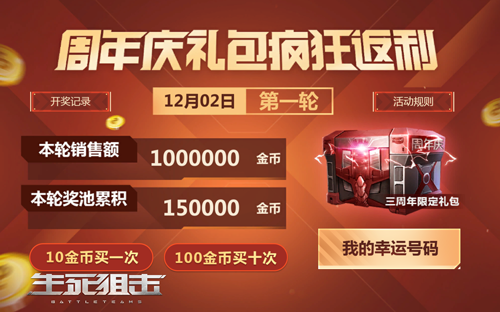 对战不休,福利不止。《生死狙击》手游正值三周年庆典之际,周年庆已然到来,福利自然是必不可少的,而在三周年这样的具有特殊意义的日子里,《生死狙击》手游也将以最为诚意的惊喜派送燃爆年末,与诸位玩家共贺! 生死三周年庆 生涯成就传说 在《生死狙击》手游中,每位玩家的一举一动都是珍贵且有意义的。在三周年之际,《生死狙击》手游将会和大家一起回溯过去的点点滴滴。每位玩家都能根据各自的角色诞生时间、角色等级、游戏战斗总时长、总击杀数、不同品质武器拥有量等数个数据获得相应的生涯成就得分,并且根据最终成就得分免费领取相应的圣魔血晶和圣魔宝箱。 通过生涯成就活动,玩家可以从中获得大量圣魔血晶和圣魔宝箱。其中,圣魔血晶可用于铸造传说级武器RPK天神和RPK魔神;而圣魔宝箱开启之后除了能获得大量道具奖励之外,更是有几率直接开出RPK天神和RPK魔神哦!积极参与活动,轻松赢取传说武器-众神之怒也不无可能哦! 一路同行 并肩作战?最强挑战来袭 此外,在11月25日至12月22日周年庆期间,《生死狙击》手游将会开启一个独特的全服挑战活动!何为全服挑战?全服参与,人人拿奖。在这个活动中,个人荣耀数据与服务器活动数据将会进行联动,完成指定目标挑战即可解锁终极奖励。 活动主要分为个人挑战和全服挑战两个部分。主要挑战内容包含战斗时长、爆头击杀数、神器碎片消耗、冒险怪物击杀、金币消耗、武器升星、军火库英雄武器获取等多个项目。而通过完成个人目标和全服目标,玩家可以轻松从中获得挑战宝箱;海量神器碎片、神器原石以及英雄武器合成碎片等高品质奖励唾手可得! 疯狂返利开启,周年礼包显神威 周年庆之际,除各路精彩活动之外,福利礼包自然也不会少。在12月2日至12月8日期间,《生死狙击》手游全新上线周年庆礼包疯狂返利活动。玩家通过三周年限定礼包可以开启获得三周年限定喷漆以及价值10金币的随机道具,同时玩家还有机会直接获得永久英雄级武器!值得注意的是,单个礼包只需消耗10金币,玩家可以通过三周年限定礼包获得一个随机五位数的编号,用于参与每天的抽奖返利活动。绝对的低门槛,人人皆可参与。 抽奖编号与当日大奖编号完全相同或者是最为接近的玩家,将会独享当轮三周年限定礼包销售额总数5%的绑定金币!甚至前4位字数、前3位数字与大奖编号相同的玩家也能获得一定数额的绑定金币。或许你与海量金币之间,只差一个锦鲤护体啦! 生死三周年,海量福利大派送。在三周年这样的一个特殊日子里,《生死狙击》手游一如既往的秉承为玩家服务、为玩家让利的宗旨,为大家献上一份完美的惊喜盛宴。如果你也想要拥有这些奖励,想要体验锦鲤的日常,那么千万要记得在活动期间登录游戏,并积极参与活动哦! |