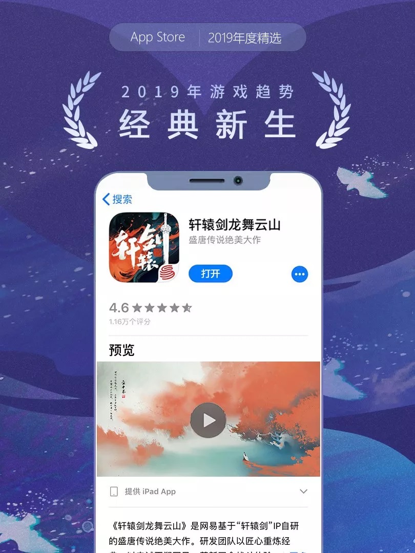 近日,App Store 2019年度精选重磅揭晓,网易盛唐传说绝美大作《轩辕剑龙舞云山》入选“App Store 2019年游戏年度趋势:经典新生”! 【经典新生,再获盛誉】 每年年末,Apple官方都会在各种优秀App和游戏作品中进行筛选和总结,评选出App Store年度精选榜单。12月3日,App Store 2019年度精选正式揭晓,网易《轩辕剑龙舞云山》手游从众多优秀作品中脱颖而出,入选“App Store 2019年游戏年度趋势:经典新生”。 10月18日,《轩辕剑龙舞云山》正式上线当天,App Store便于Today编辑推荐及游戏精选标签推荐,为这款盛唐传说绝美大作送上祝福。游戏上线4小时便登顶App Store免费榜榜首,如今更是入选了“App Store 2019年游戏年度趋势:经典新生”,能获得这一殊荣,是对《轩辕剑龙舞云山》品质的最大认可。 【脱胎换骨,焕发新生】 Apple官方在《轩辕剑龙舞云山》的当选理由中说道:“经典本土RPG《轩辕剑叁:云和山的彼端》和《轩辕剑叁外传:天之痕》以出色的水墨美术著称,而《轩辕剑龙舞云山》则实现了全面升级,3D 技术让水墨得到了立体呈现,创造了动态的人物和唯美场景。多人在线的玩法则让玩家自己定制角色,更加自由地游历盛唐仙侠世界,回味动人剧情。《轩辕剑龙舞云山》用精致的水墨国风重新诠释了《轩辕剑》的故事。” 以匠心重炼经典,以赤诚再塑国风,是《轩辕剑龙舞云山》研发团队的不懈追求。《轩辕剑龙舞云山》独创“新国风轻写实”的美术风格,将虚实、肌理、晕染等东方绘画的表现精髓,运用到游戏的贴图语言和3D技术当中,将轻快明亮的色调晕染在游戏画感中,为玩家营造出了颠覆传统审美与美术画法的意境与氛围。如梦似幻的桃园盛景、空灵圣洁的天山草甸、恢弘壮阔的敦煌大漠、气吞山河的铁马雄关……置身于游戏场景之中,仿佛步入美轮美奂的水墨画卷,将绝美盛唐风光尽收眼底。 【重炼经典,再塑国风】 基于“轩辕剑”IP打造的全新手游《轩辕剑龙舞云山》不仅继承了原作至高的文化追求,更是将传统文化融入于游戏的细节当中,为玩家们带来了全新的体验,为游戏史上的经典系列注入了全新的生机与活力。 在《轩辕剑龙舞云山》中,各位少侠可以体验古时候的各个行当。既可成为乐师,聆听古韵应律拨弦;亦能化身藏家,鉴定收藏华夏瑰宝;还可挥毫舞墨,描绘盛唐旖旎风光;更能摘字飞花,以诗会友助兴取乐。此外,还能亲自重走海上丝绸之路,探寻璀璨文化,见证千年繁华,尽享一场声画皆佳赏、处处皆学问的传统文化之旅。 长路修远而上下求索,风雨前行而不忘初心。由衷感谢各位少侠对《轩辕剑龙舞云山》的支持与热爱。研发团队将会倾注更多心血,不断打磨与优化产品,力争为玩家们带来一场更加精彩的盛唐之旅! 关于《轩辕剑龙舞云山》: 《轩辕剑龙舞云山》是网易基于“轩辕剑”IP自研的盛唐传说绝美大作。研发团队以匠心重炼经典,以赤诚再塑国风,革新回合战斗体验,畅享爽快追击;开创休闲奇趣玩法,体验古人行当;打造影视品质剧情,演绎众生百态。执剑卫唐,谱写壮阔史诗;声临其境,传颂千载正道。 |