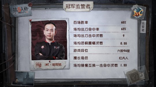 呵呵哒:享受生活享受游戏,注重效率放平心态 2019《第五人格》IVC冬季精英赛已圆满落下帷幕,在11月30日重庆欢乐谷·恺撒宫的决赛现场,IMT战队发挥出了极佳的水平,凭借十分亮眼的发挥战胜Gr战队成功登顶本次IVC冬季精英赛,获得总冠军! 战队夺冠图 赛后很荣幸邀请到了IMT丶呵呵哒进行赛后专访。接下来,让我们一起跟着他了解下IMT战队以及他们对本次IVC征程的感想吧! 呵呵哒个人介绍图 Q:恭喜IMT战队获得本次IVC冬季精英赛冠军,此时此刻最想对支持IMT战队的粉丝们说些什么? A:感谢大家一如既往的支持,没有让大家失望。还想对大家说享受生活,享受游戏。 Q:IMT战队作为一个新组建的战队,在这次IVC冬季赛中战胜了老牌冠军战队Gr,队员们都是怎么想的呢? A:当时我拿了四杀时,相信我的队友们很激动,也算是运气比较好,抓到对手的失误打出了优势。这一路走来,我们一直很艰难,差点都没有出线。虽然我们一直在输,但是我还是心态放平。后来我们打Gr时还是很紧张的,因为有些队友也是第一次参加线下赛。到最后真正赢了是非常高兴的,也算是努力没有白费。 Q:可以说一说你是如何备战线下总决赛的吗? A:为了备战总决赛,我们牺牲直播时间,针对不同的地图和对手的角色池进行了训练,也邀请了一些专精监管者的玩家帮助我们队伍加强训练。我们战队的备战强度适当,注重两点:一是效率,线下我们有很多时间训练,临阵磨枪也是非常重要的;二是心态,如果训练完大家都很累的话,那也会影响比赛的发挥。 Q:我们可以看到你们战队的队长李志轩在比赛虽然没有上场,但是也一直坐在备战席中,他在比赛中扮演了什么角色呢? A:李志轩是我们的队长和教练,他对游戏理解很深刻,平时会监督我们训练,有时候我训练比较累的时候,他也会代替我进行训练。他是很重要的角色,一直帮战队出谋划策,比如在BP的时候会给我们意见,告诉我们该怎么打,怎么带天赋和辅助技能,但他也不做过多干涉,只是点到为止。 Q:成功夺冠,队内的每位成员都功不可没,请分别评价下你的队友们吧! A:四个求生者队友各有千秋,小迪属于发挥非常稳定的选手,对游戏理解非常深刻,在比赛打得不好的时候他主动当指挥位,逆转局势。狐狸想法很多,他和李志轩在比赛前都会讨论角色选择,他的角色池也很深,只是有时候比赛会比较紧张。清唱属于比较稳定的选手,也是非常有潜力的选手。斯文是我们队伍的主前锋位,这次有点紧张,但是后来在比赛中还是抗住了压力,沉稳比赛,在关键局救人没有被恐惧震慑。 Q:可以评价一下你们的对手Gr战队和MFB战队吗? A:MFB战队也是老对手了,不管线上线下都是比较了解的。总体来说,他们也是一个训练很辛苦的战队,他们每次都是惜败,但比赛也是有运气成分的,大家都很强。Gr战队属于非常强的明星战队,这次比赛我的发挥应该是比较好的,但是还是打得很吃力,一直在平局,每次都打满BO3、BO5,是很强的对手。 Q:在本届IVC冬季精英赛中,你多次四杀,是不是每一局的打法都是冲着“四杀”去的? A:队友被四杀后,我才会冲着四杀去打。平时的话,我都是该怎么打就怎么打,保持稳定发挥。果断激进或者保守的决策都会影响打法,所以还是按当时的情况去打,除非是逼不得已必须四杀的时候。 Q:观察到你在比赛中表现的非常沉稳,可以简单聊一聊自己在比赛中的心理想法吗? A:当时心如止水。我就是按平常一样去打,因为我平时也有高强度的排位和训练,大家或多或少都会有些紧张,但是这样的强度比我们正常的排位训练强度要低一些,所以就不用担心,打好自己的就可以了。我能够赢、可以打出好的操作,只要融入到这个游戏中,把自己想成游戏中的角色,就会好很多。 Q:队员们平时生活在不同的城市,线下赛成员难得聚齐,夺冠之后大家是怎么庆祝的呢? A:当天晚上就有重庆的粉丝介绍了一家当地的火锅店,所有队员和线下的粉丝们就一起去吃了火锅,还开了直播,大家都很开心。在比赛之前,难得有机会聚齐,还一起去玩了密室逃脱。 Q:可以谈一谈你当初是怎么接触到《第五人格》这款游戏的呢?玩这款游戏多久了?又是怎么决定走上组战队打比赛成为一个职业玩家的道路的呢? A:从去年4月份开始接触这款游戏,已经有1年8个月了。当时我处于换工作的空档期,就接触到了《第五人格》。因为这款游戏的非对称性机制比较新颖,我想体验一下。后来我打榜,冲到了前50、前30,然后就有人邀请我当主播。慢慢冲榜到榜单前列,大家就觉得我有实力打比赛。 Q:疯眼、红夫人、蜘蛛等不同的监管者你都很擅长,你个人最喜欢哪个监管者? A:我个人最喜欢的是疯眼。但疯眼真的很难玩,要记很多东西,投入很大,也有可能带给你很大的挫败感。所以玩疯眼一定要心态放好。其次,要好好去钻研、总结,因为疯眼这个角色基本上在任何时期都可以掌控全局,所以他需要同时想和做的事情是很多的。既要有想象力,又要有对局势的把握。 Q:可以给粉丝们分享一下平时除了直播和备战赛事,最喜欢做的事是什么吗? A:我会看第五人格其他主播的直播和回放。我比较喜欢养生,毕竟要保持自己的状态,在饮食作息还是生活习惯方面都会做一些调整。我吃素快4年了,每天早上会吃很多维生素、核桃、杏仁和黑芝麻糊,还会喝一些蛋白质。在比赛和排位之前也会睡一觉,这样状态比较好。直播前也会做一下手腕