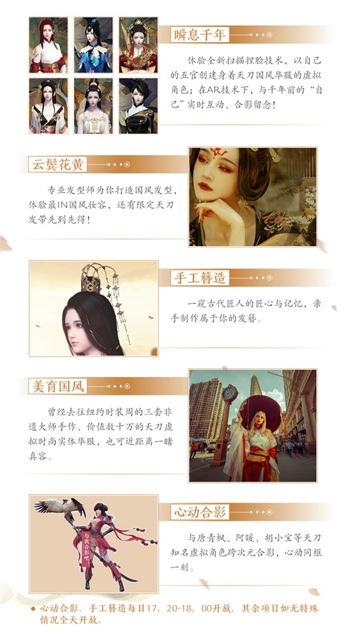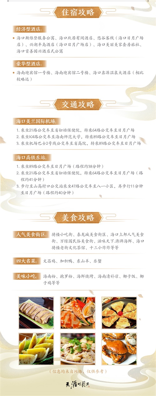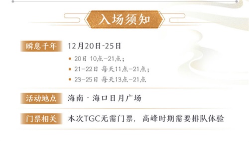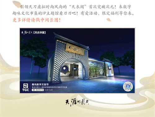 好消息!2019TGC腾讯数字文创节天刀参展确定! 这一次,天涯明月刀真的来到了天涯至远之处。在这里,不仅可以近距离欣赏天刀非遗合作款作品,享受周边惊喜折扣,在IP专场区域中,苏夜来阁主的“天衣阁”首次现身三次元。 少侠们将可以体验扫描捏脸+AR拍照技术,和天刀江湖中身着华服的自己交互合影,一秒穿越大宋。还有天刀NPC合影、国风妆造等! 天刀XTGC 内容概览 用科技重现文化,以文化照见未来,当游戏打破次元壁与你相约,世界蕴含着多少可能等待我们去发现?12月20日-25日,天刀携非遗手作、新品周边、IP专场展馆等精彩内容现身海南TGC2019,一起来看看! ①艺术共创区 多件天刀非遗周边现身艺术共创馆,近距离感受匠心手作魅力。更携手中央美术学院,三希堂主题艺术装置作品《暖阁探微》等你欣赏! ②TGC周边商城 精美天刀周边现场贩售,自用送人两相宜。不仅有新品现场首发,还有惊喜折扣和满额赠礼哦~ ③数字趣味文化市集 其中,在这块区域天刀还拥有一块专场,线下天衣阁等你体验! 线下天衣阁 ①天衣阁必玩榜 ②现场福利抢先看! 完成指定流程、参与线上分享、体验指定环节均有机会获得以下好礼! 逛吃攻略 听说冬天和海南更配,这次和我们一起相约海角天涯!身份证钱包别忘记,导航APP也要准备好~一起开启逛吃逛吃模式吧! 人气美食街是专为像刀娘这样吃货准备的吗? |